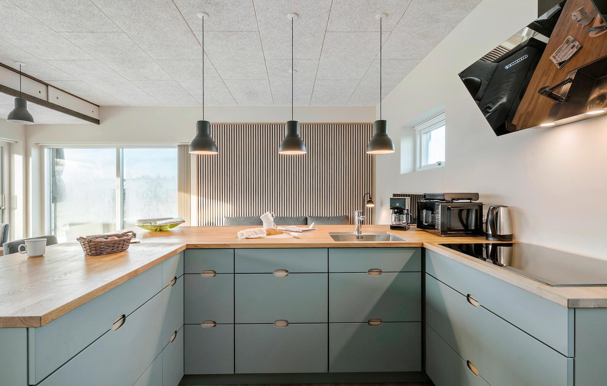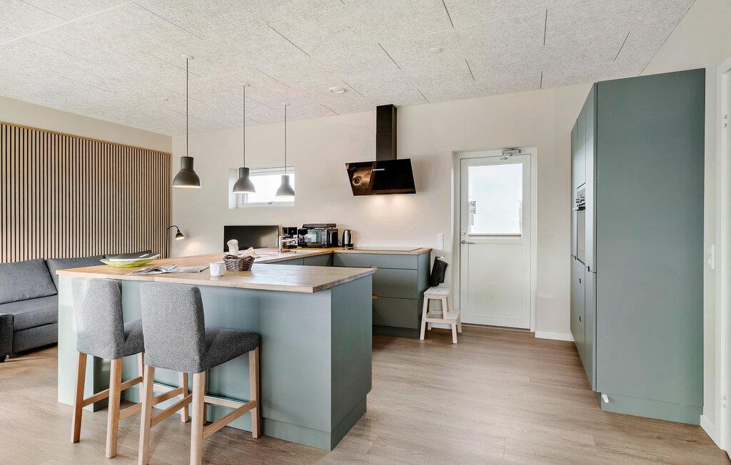 Velkommen til dette moderne og flotte sommerhus. Indretningen er simpel og praktisk, og meget stilren. I køkkenet kan I lave mad, mens samtalen kan fortsætte fra både sofaen og spisebordet. De store vinduespartier lukker en masse naturligt lys ind, og giver skønne solstråler i stuen. Sving benene op i sofaen og sæt en god film på, eller find de sjove brætspil frem og saml jer om spisebordet.