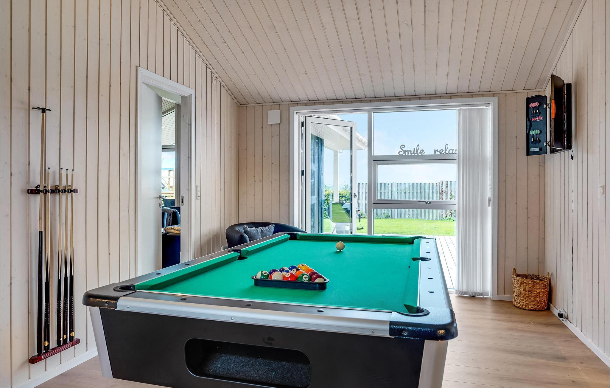 Huset byder på masser af faciliteter, og ingen behøver kede sig under opholdet, da der er aktivitetsmuligheder for både børn og voksne. Husets aktivitetsrum byder på både billard/poolbord og bordtennis. Møbler og udstyr er flot sammensat, og stue og opholdsrum fremtræder lyst, rummeligt og indbydende. Fra stuen er der udgang til stor sydvestvendt terrasse, hvor gode havemøbler og ikke mindst det store vildmarksbad indviterer til masser af afslapning og hyggestunder. Huset har god plads til to familier eller tre generationer, som ønsker at have en masse kvalitetstid sammen på ferien..