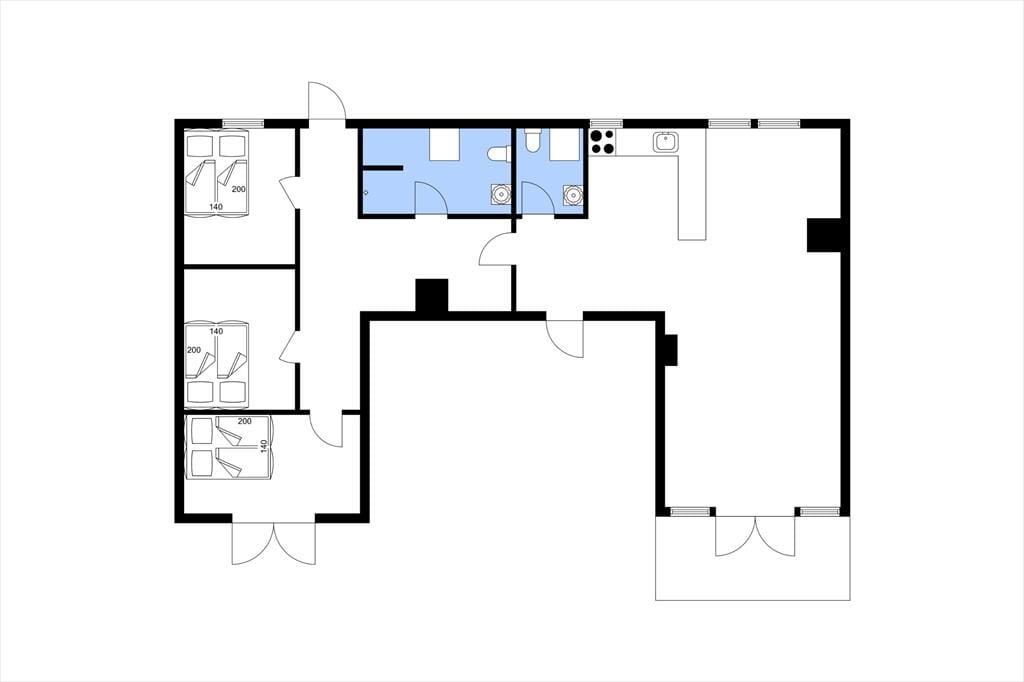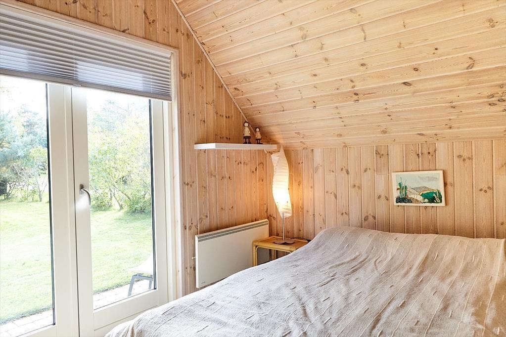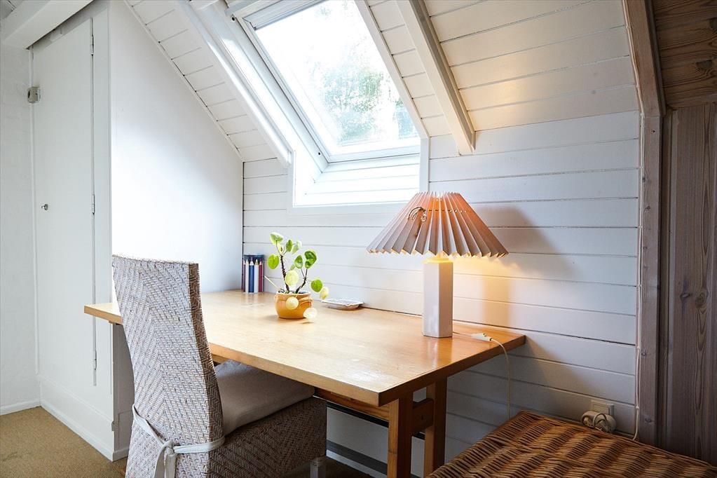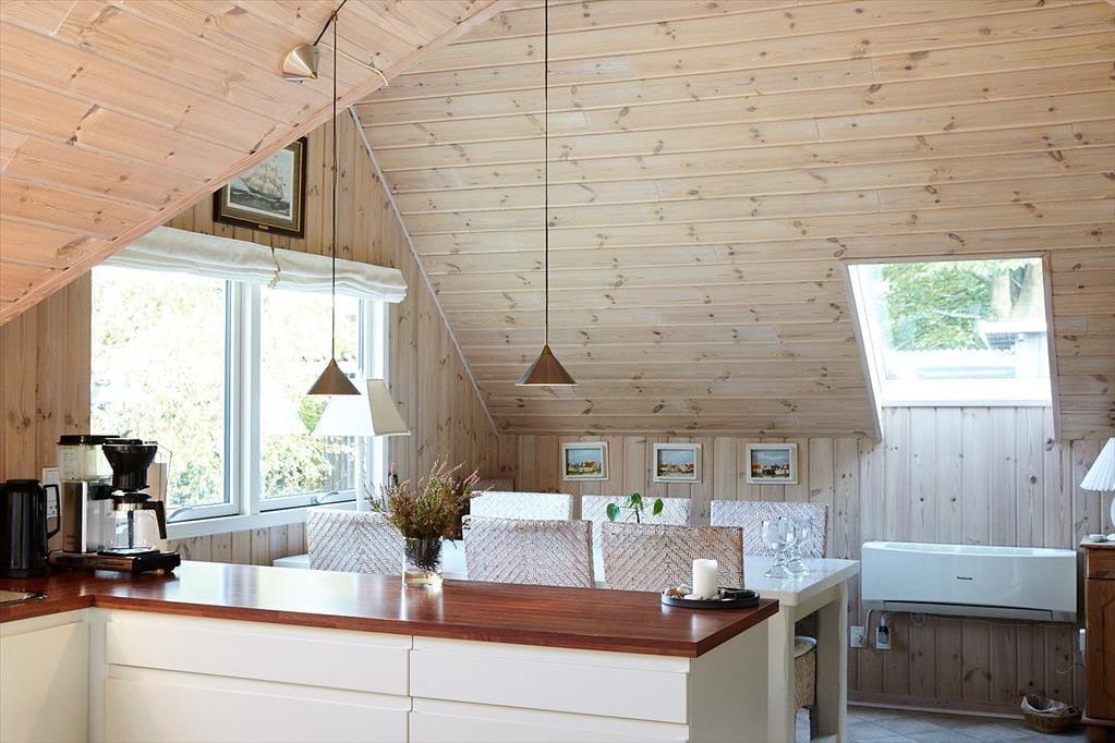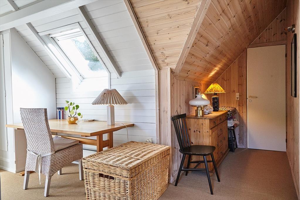 Dette dejlige og veldisponerede sommerhus byder sig til med værelser i den ene side og åbent køkken og stue i den anden side. Her har du plads til storfamilien, strikke- eller kortklubben, bare nogle gode venner eller familien på fire og et hold bedsteforældre. Fra det åbne køkken kan du nemt servere måltiderne til spisebordet lige ved siden af. Fra spisebordet kan I følge med i naturen og livet i haven lige uden for vinduet. Bagefter kan I drikke the eller kaffe fra sofaen ved døren til den sydvendte terrasse, og når mørket falder på, er der dejlige rummelige værelser i den anden fløj modsat stuen. De skrå vægge og brændeovnen, vil skabe den helt rette sommerhusstemning.