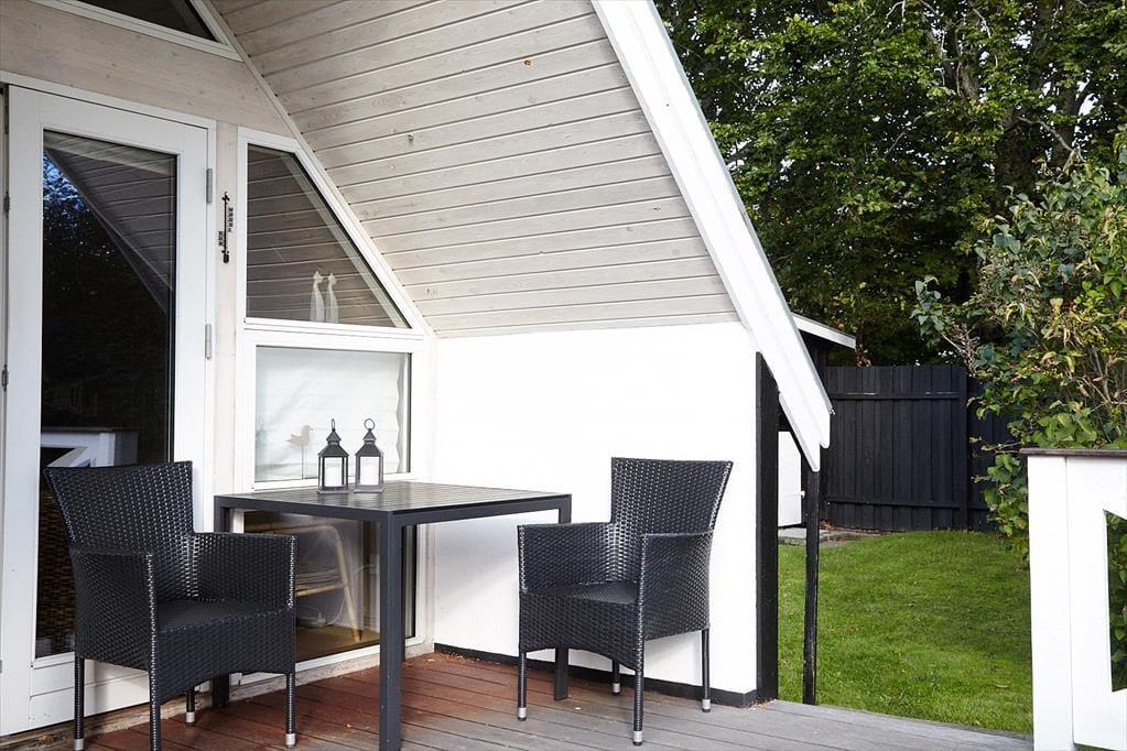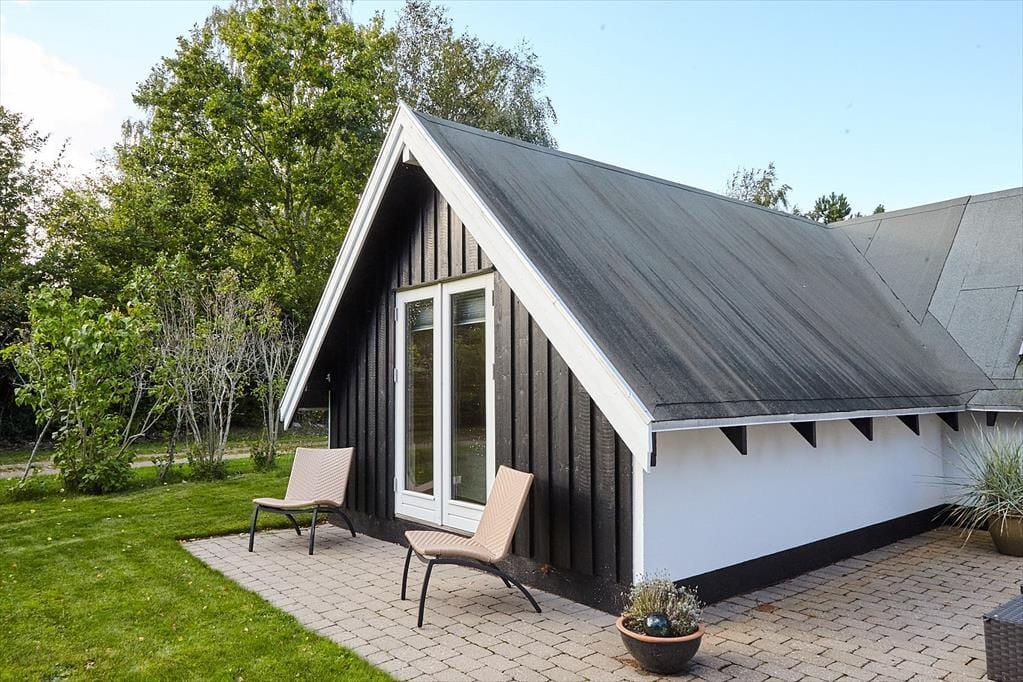 Nyd morgen- og eftermiddagskaffe, ja gerne alle måltider, på den store læfyldte sydvendte terrasse mellem huses to vinkler. Der er flere andre terrasser, ugenert beliggende rundt om huset foruden bord- og bænkesæt. I den dejlige have kan du fint invitere til en familiedyst i petanque, kroket eller badminton eller en spadseretur på godt en km i den lille 10 hektar store Fredsskov i Askehaven næsten lige over for sommerhuset. Hvis du har lyst til en lidt længere vandretur eller bare at komme i vandet, ligger Kattegat kun et par km væk og frister med en flot badestrand og en kilometerlang kystlinje.
