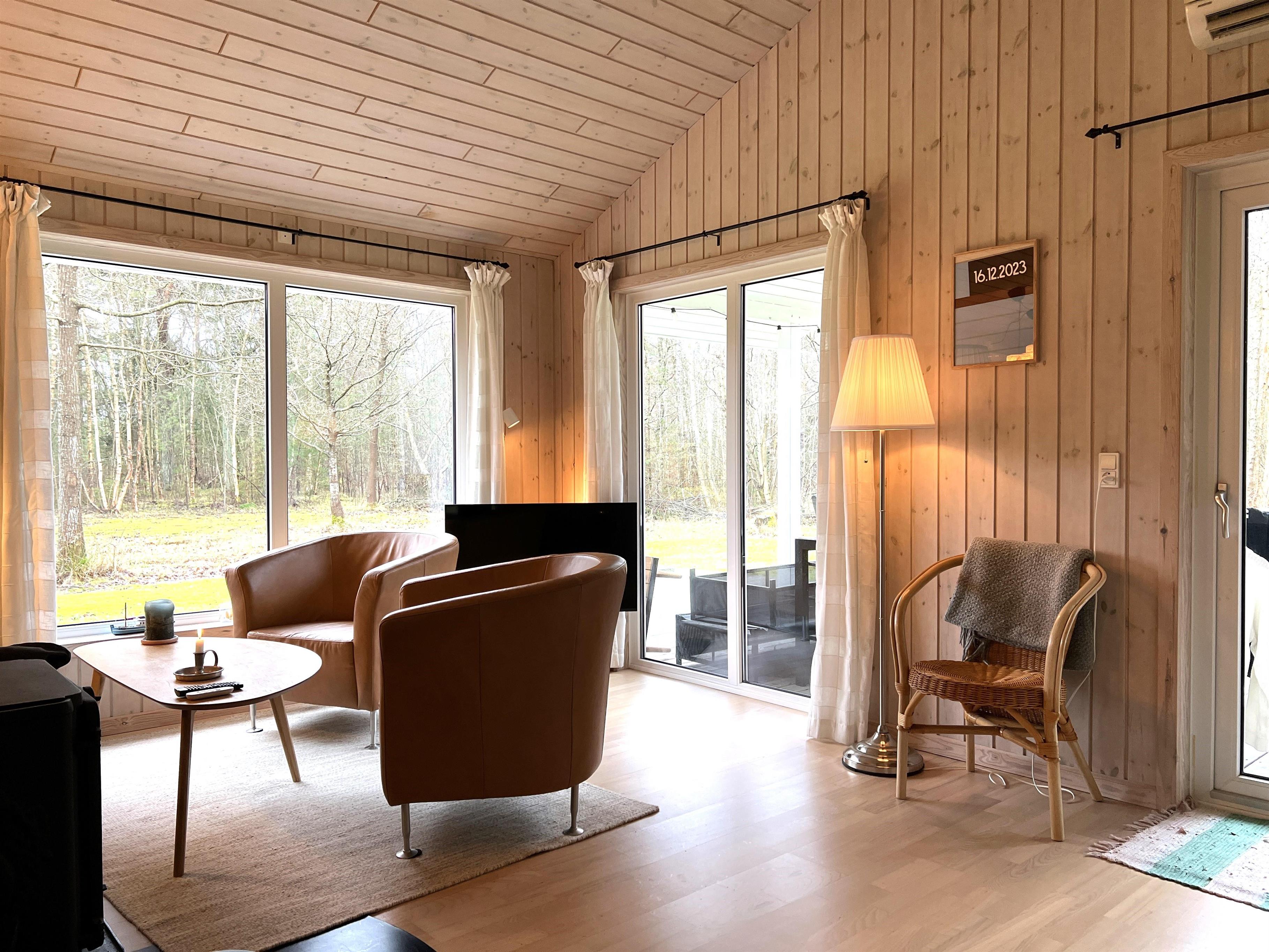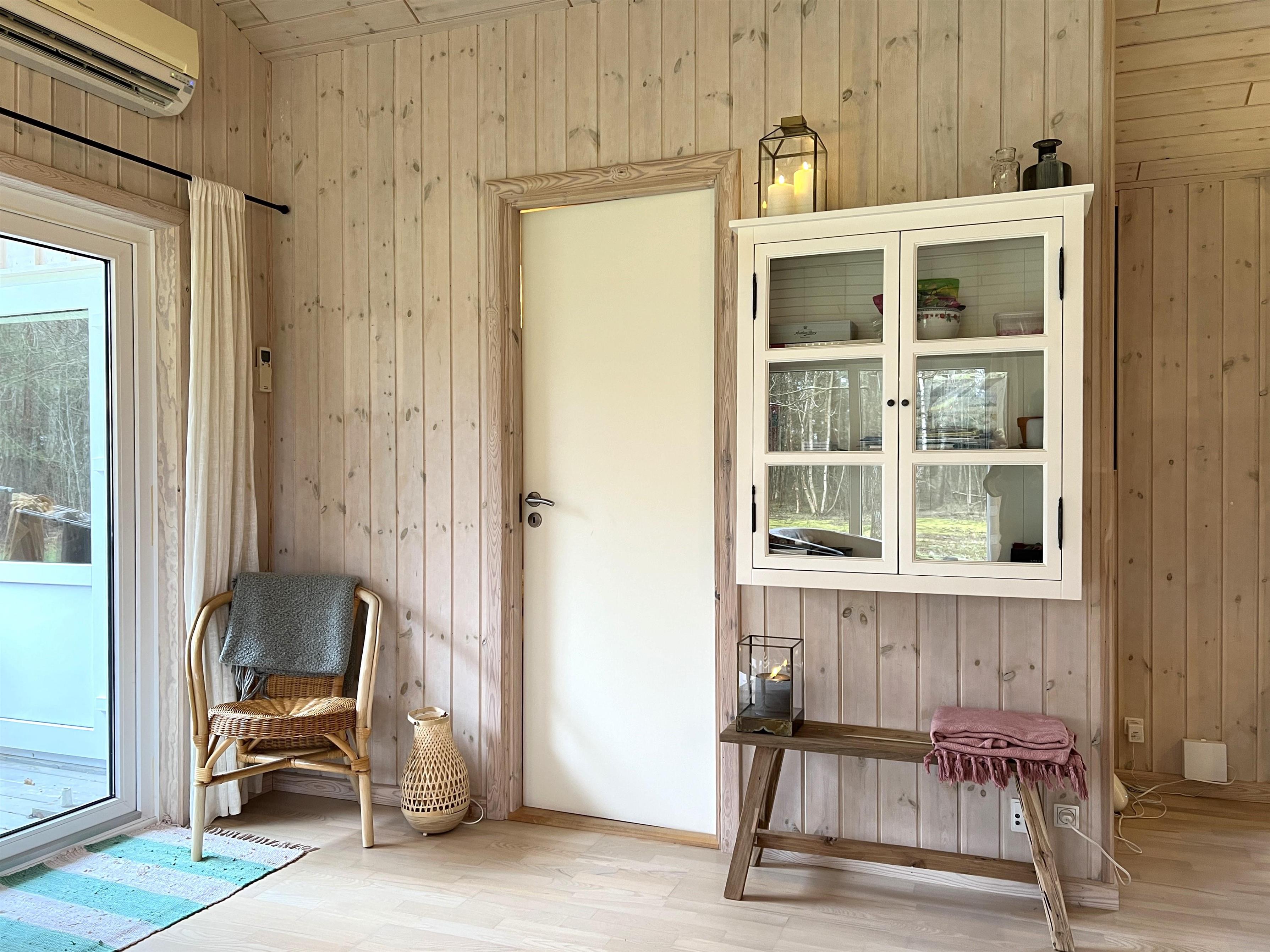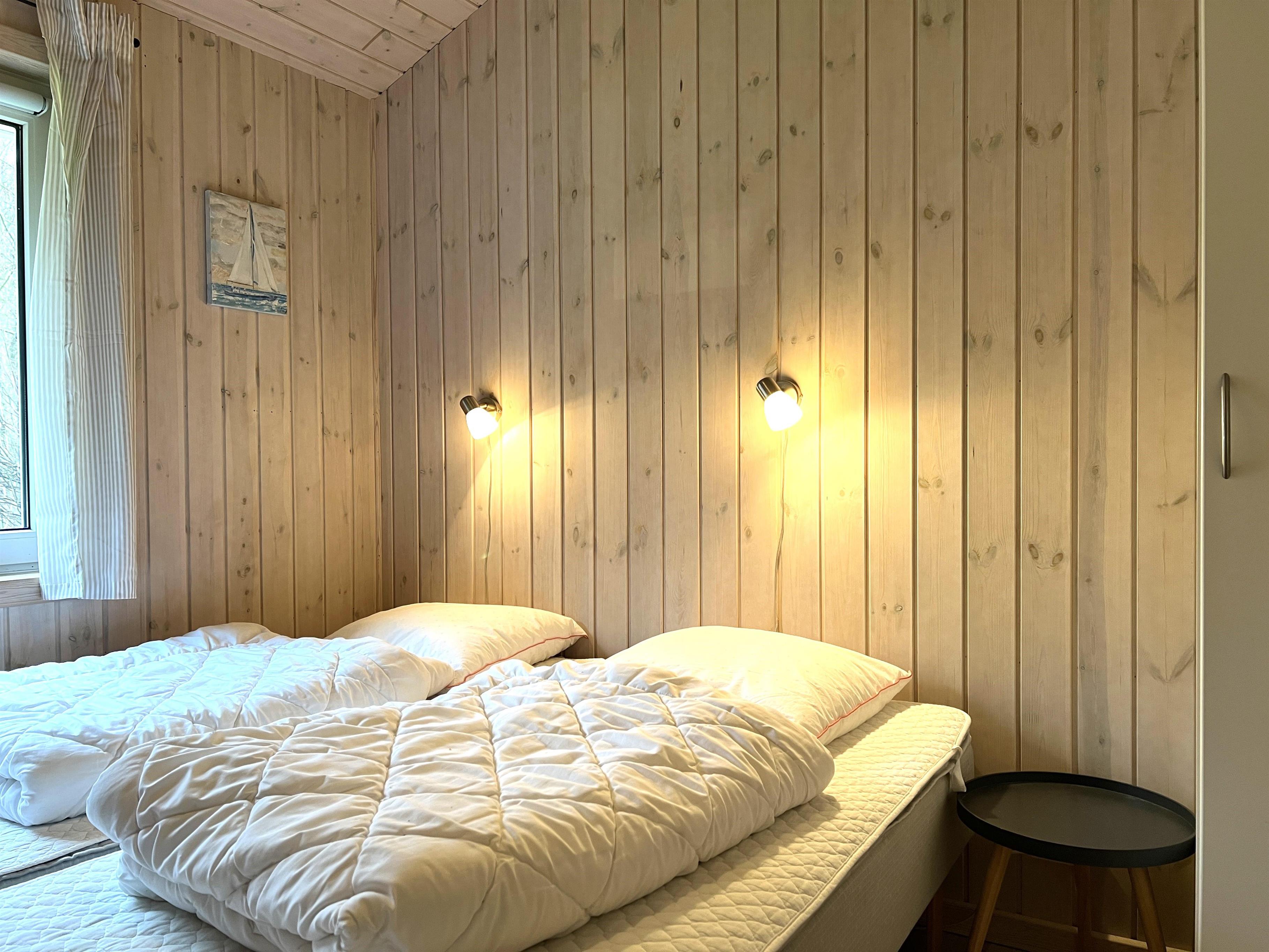 Selve huset er komfortabelt indrettet med køkkenalrum og stue med behagelige møbler og brændeovn samt store vinduespartier ud mod terrasse og have, der giver et dejligt lysindfald. To fine soveværelser i hovedhuset, et med dobbeltseng og et med to enkelsenge. Lille dobbeltseng i anneks. Desuden badeværelse med brus og gulvvarme.