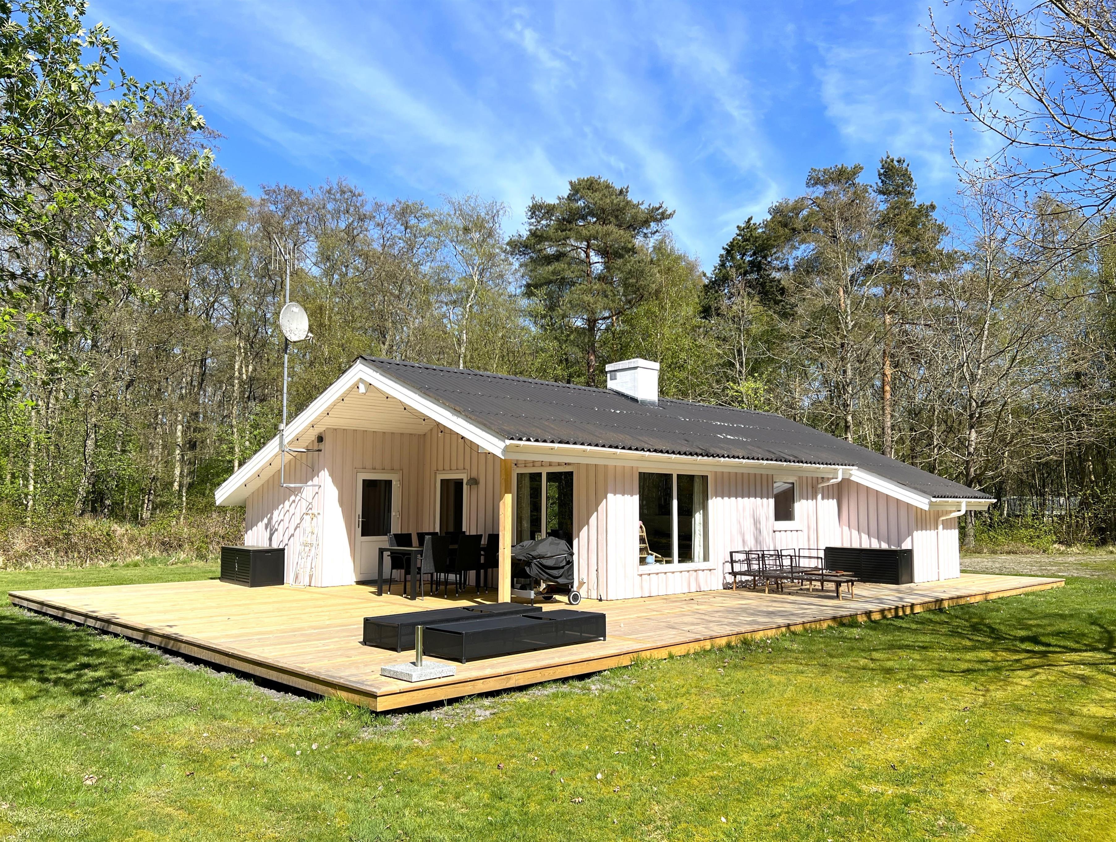 Huset ligger på skøn grund med græsplæne rundt huset og dejlig solrig træterrasse, som er delvis overdækket.