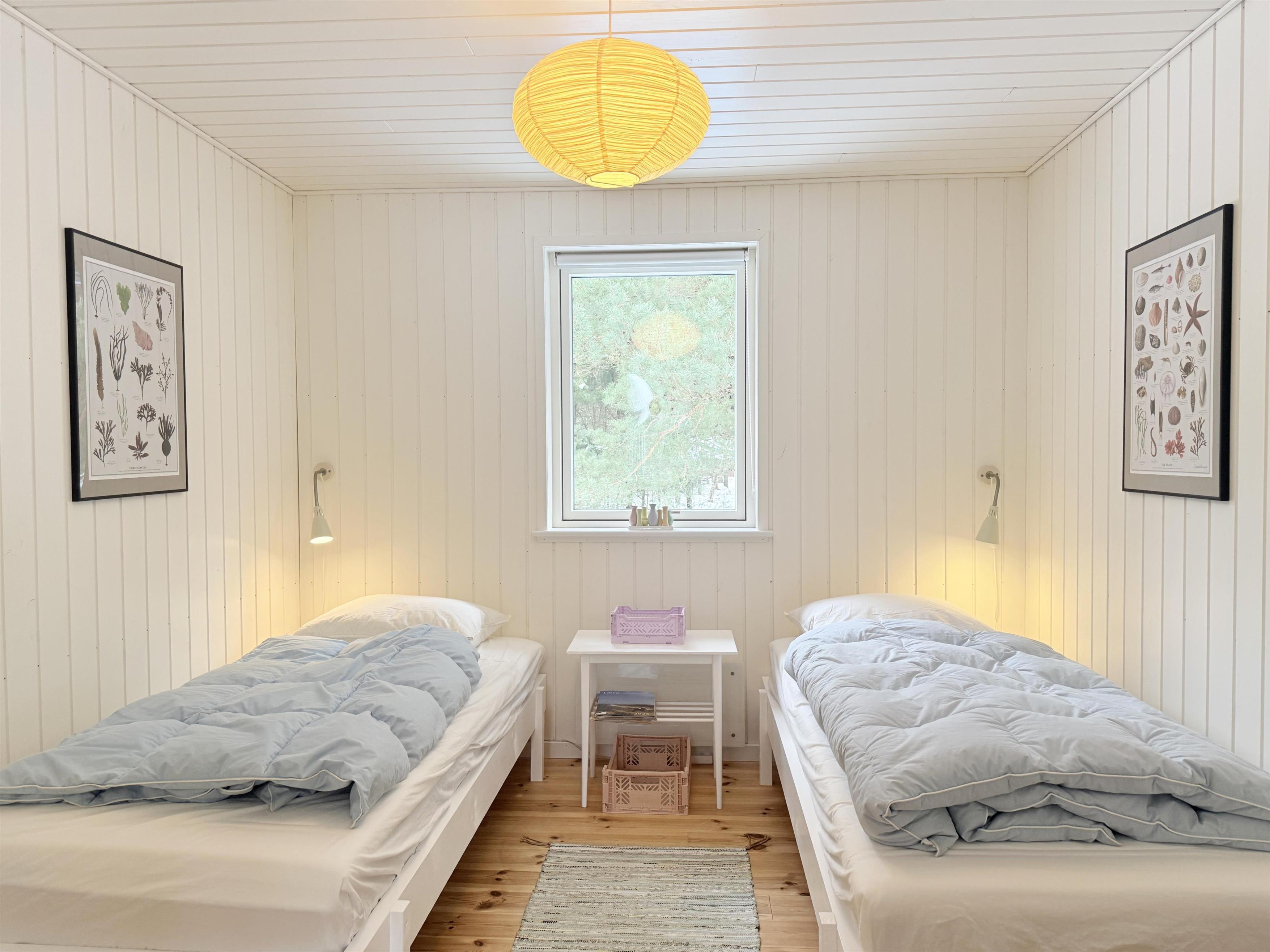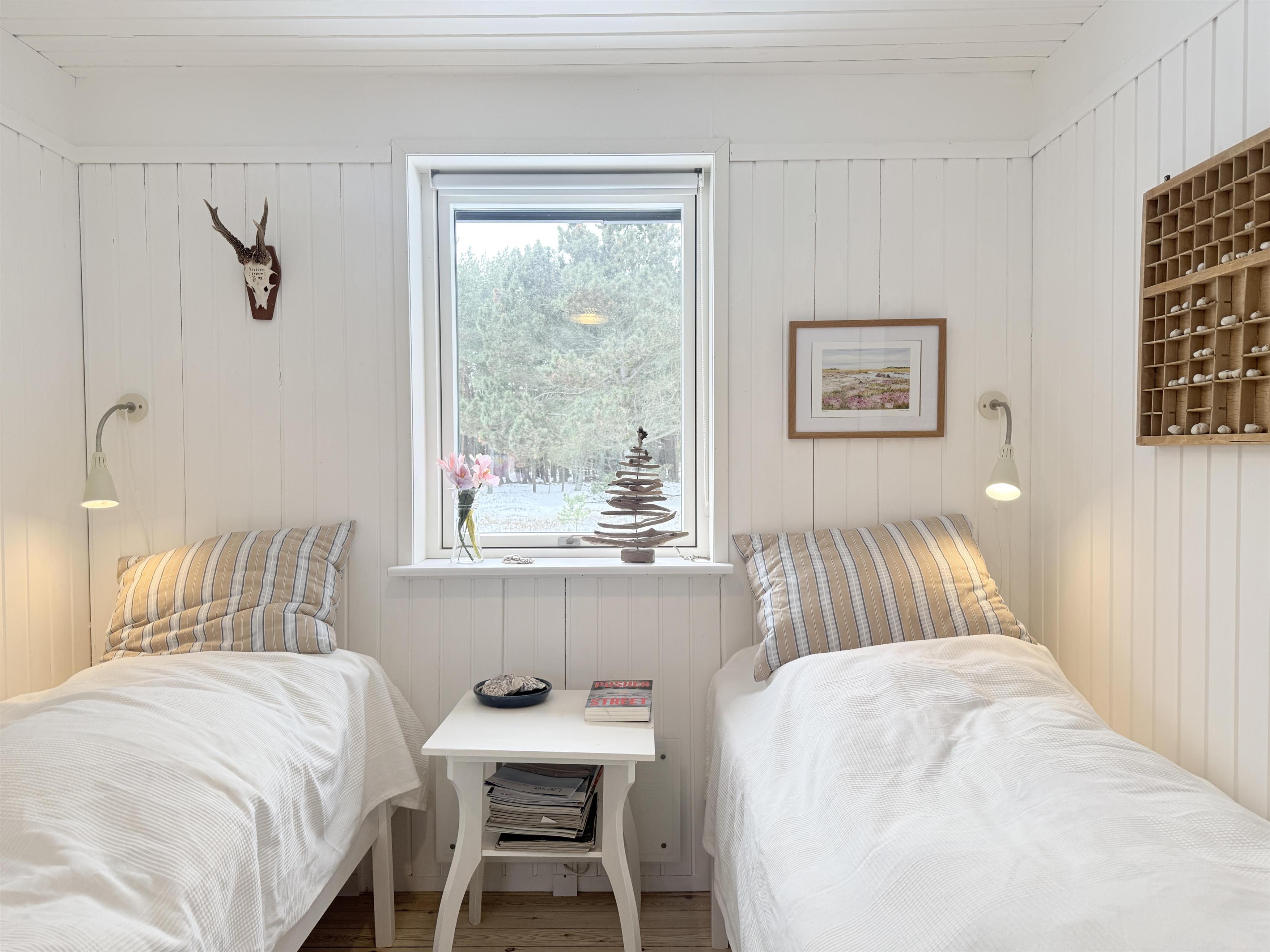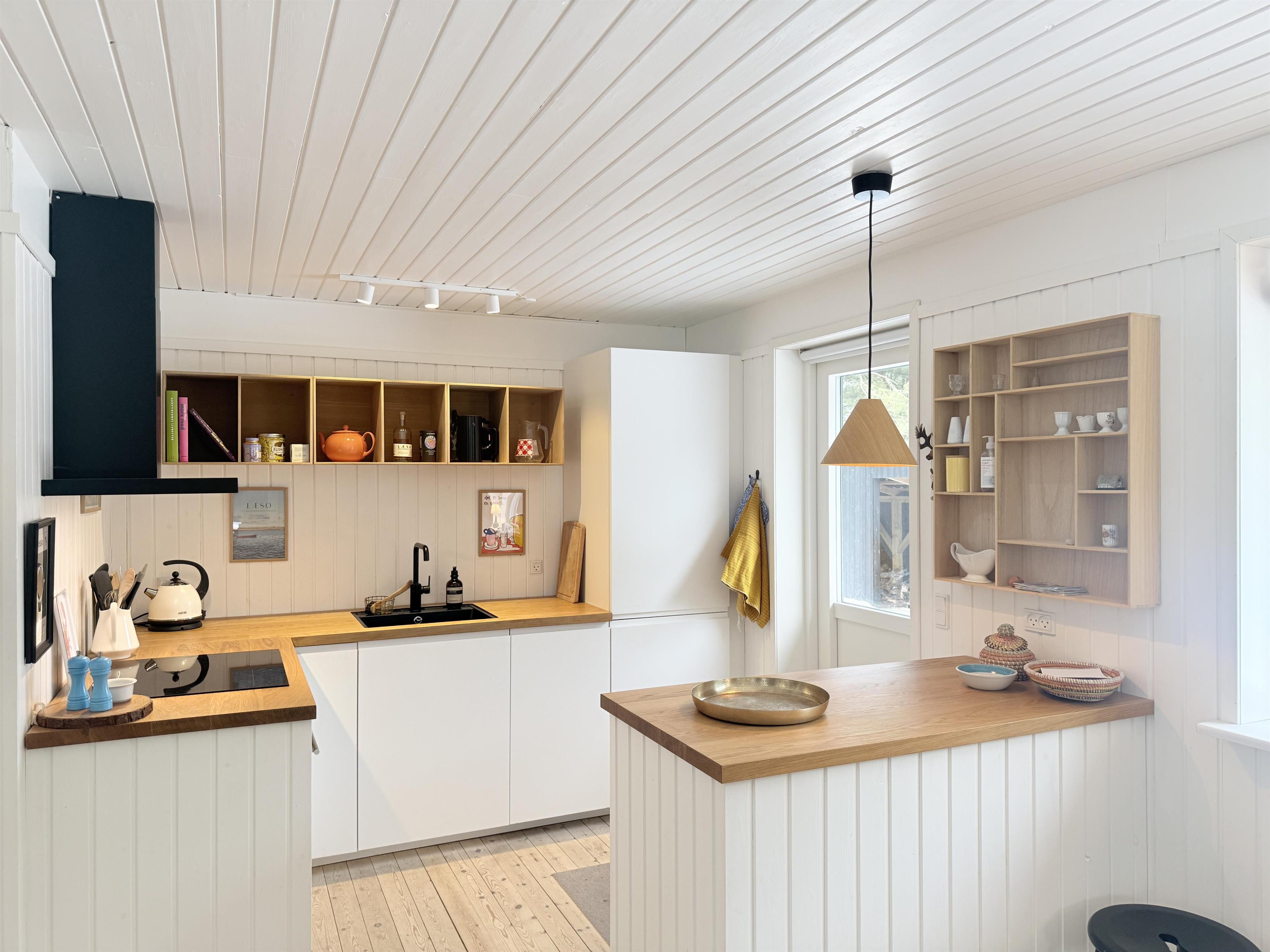 I hovedhuset er der et charmerende køkken-alrum, spisesplads med lækre designmøbler og sofaafdeling. De store vinduespartier sikrer flot lysindfald, og fra stuen er der udgang til den store træterrase, der også fører til annekset. I huset er der tre fine soveværelser, to med to enkeltsenge og et med en enkeltseng. Alle sengepladser er i god kvalitet med nye madrasser, dyner og puder. Der er desuden en gang med god opbevaringsplads samt et fint badeværelse, når man træder ind i huset. Fra huset er der flere udgangsdøre til terrasse, bl.a. fra køkkenet, hvor man kan nyde morgensolen.