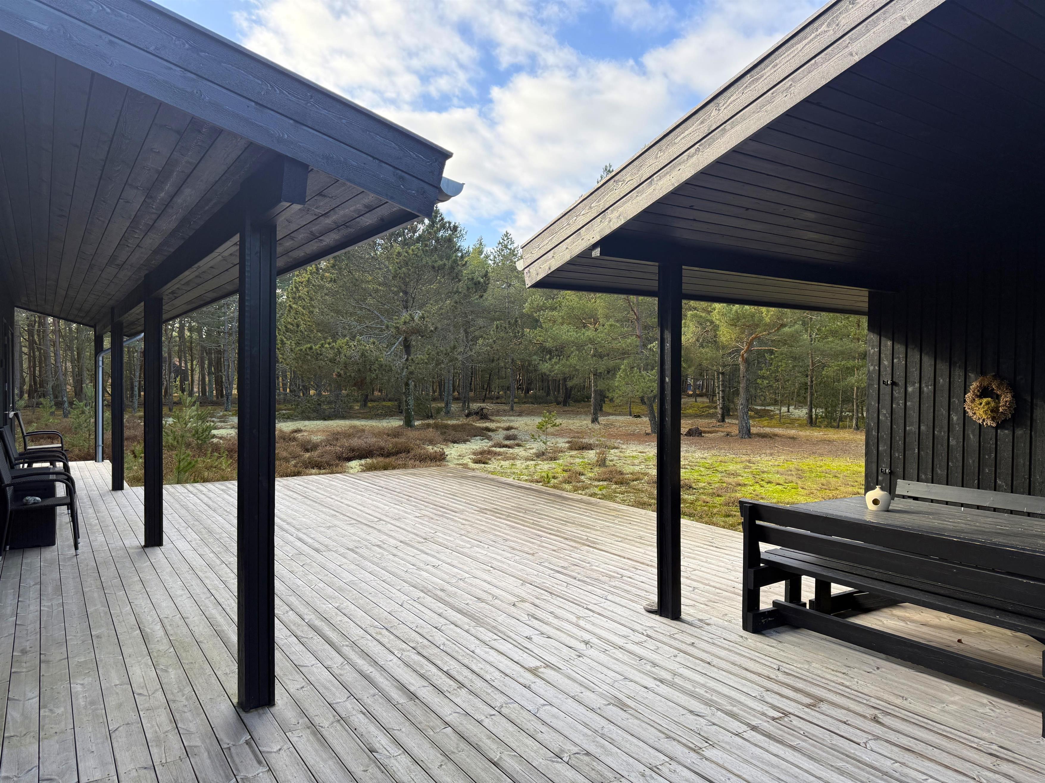 Det store anneks har et rummeligt soveværelse med to enkeltsenge, og der bliver indrettet en stor, ekstra stue med behagelige møbler og TV (billede følger). Dette giver rig mulighed for, at den større familie kan fordele sig og slappe af i både hovedhus og anneks. Begge huse har luft-luft varmepumper og stærkt fiberinternet. Fra den store terrasse er der flot kig til vandet, og man forestiller sig mange smukke sommeraftener, hvor udsigten virkelig kan nydes. Rundt på træterrasserne er der flere sæt lækre havemøbler. Kommer man eksempelvis fra stranden, er det også muligt at benytte udebruseren. På Sandstien 17 oplever man straks, hvordan den særlige Læsøro sænker sig.