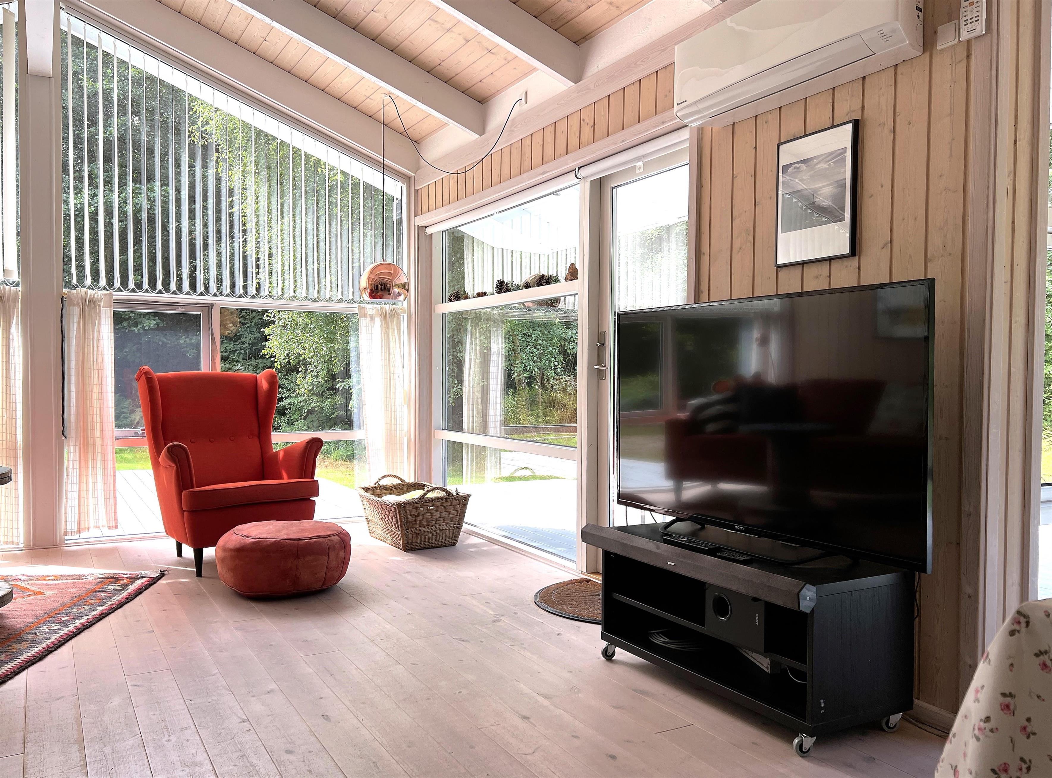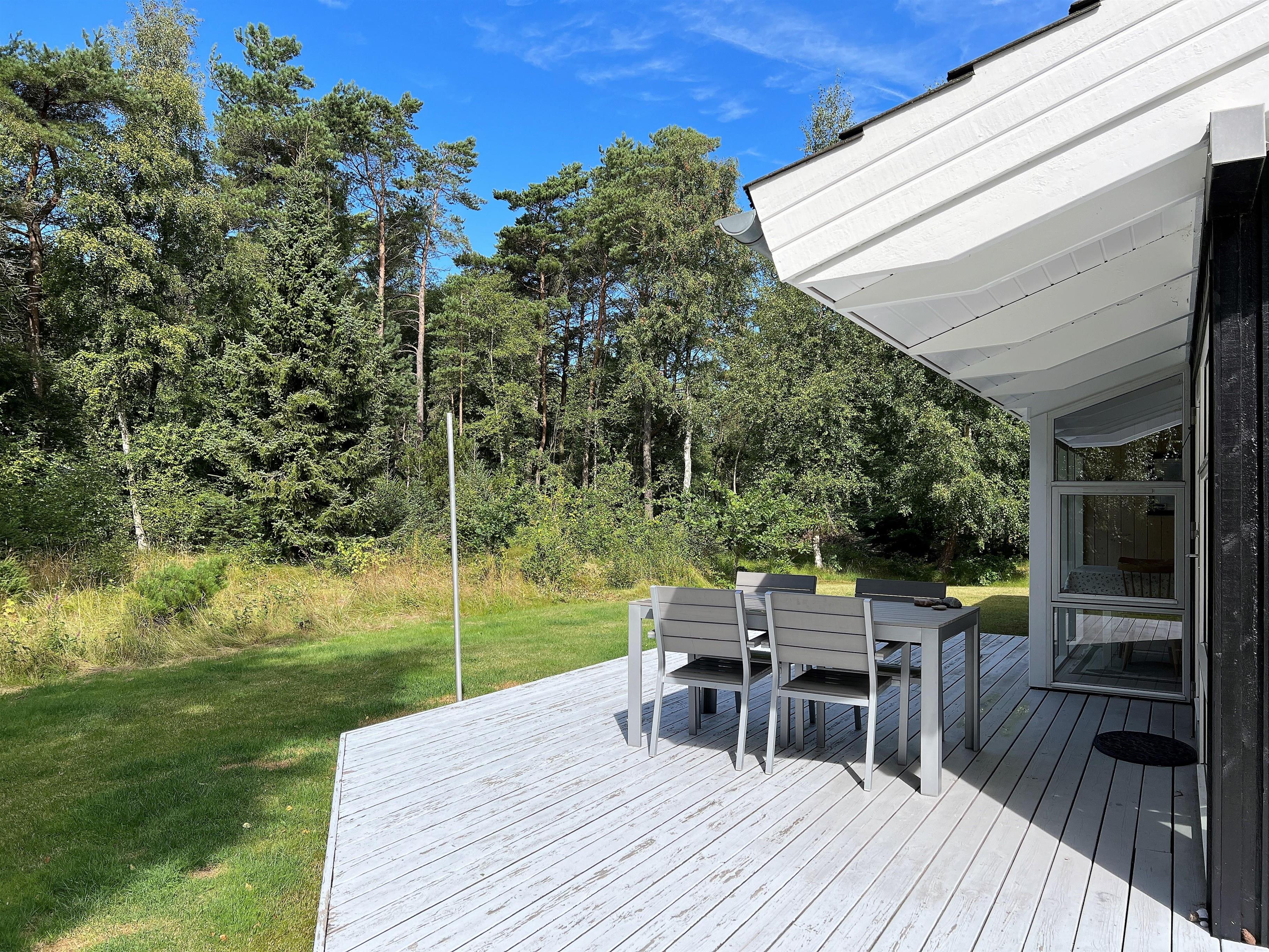Huset ligger på skøn naturgrund med græsplæne rundt huset og dejlig solrig træterrasse, der er solsejl til terrassen. En fin, privat grund i rolige omgivelser.