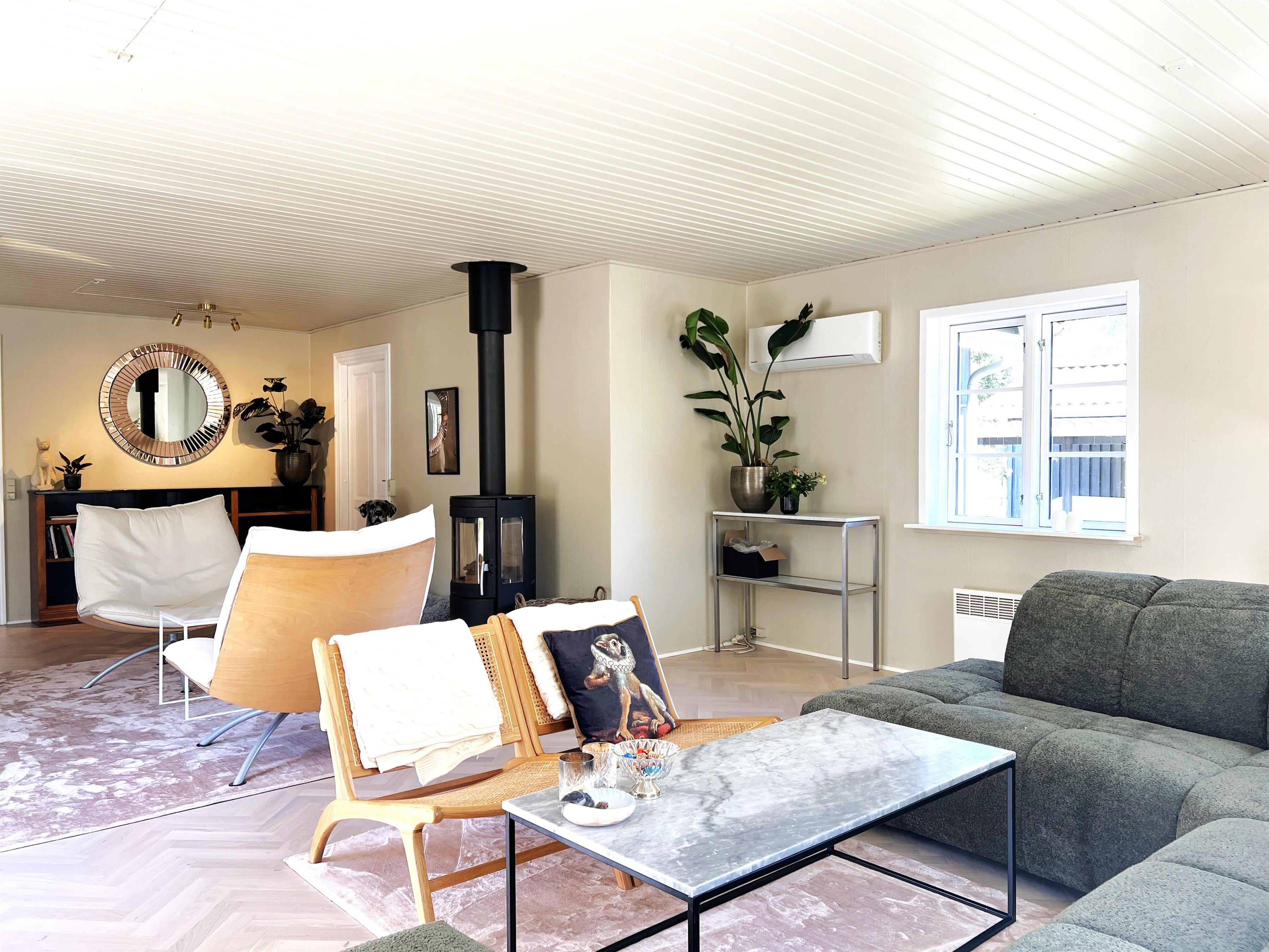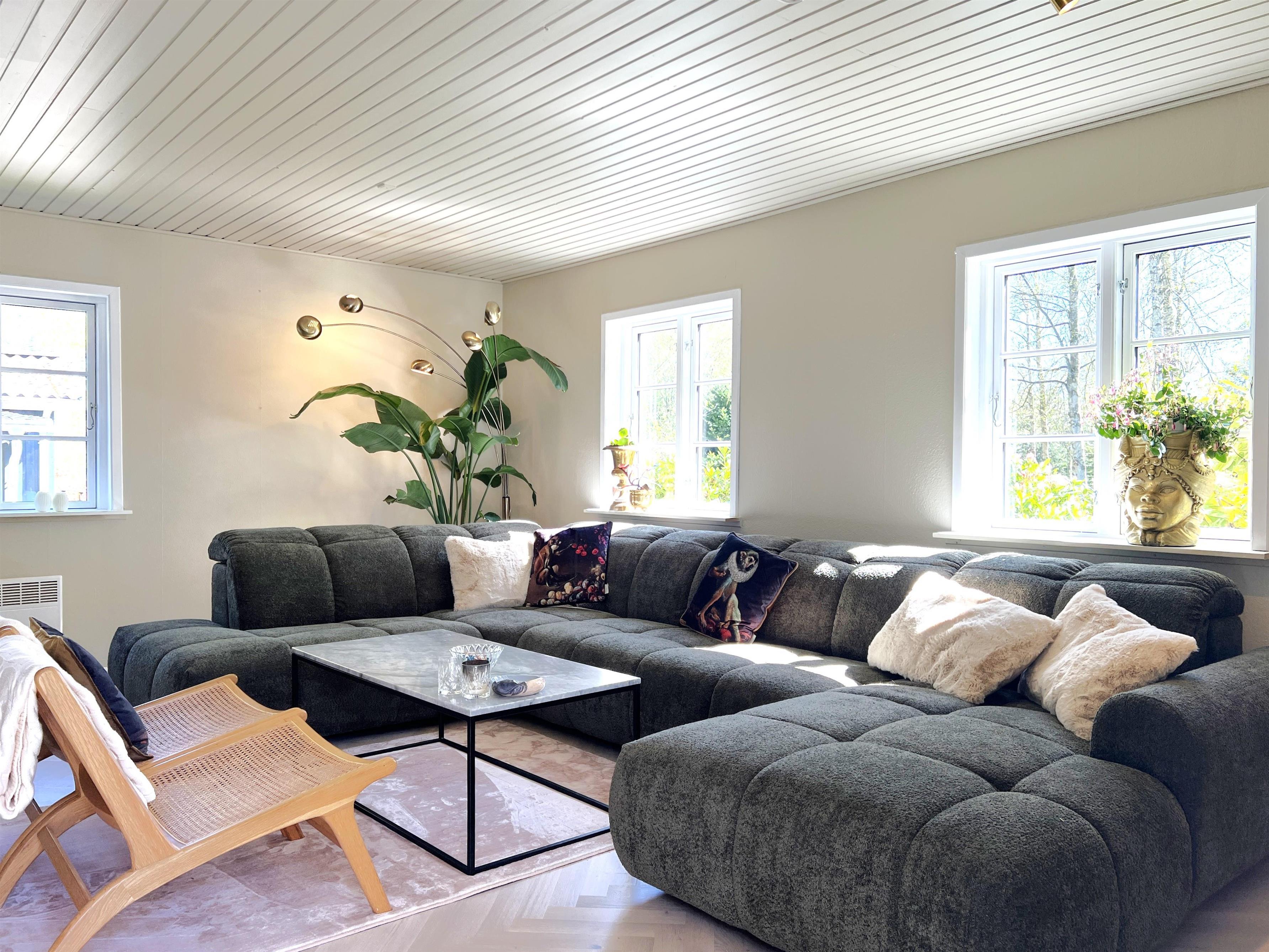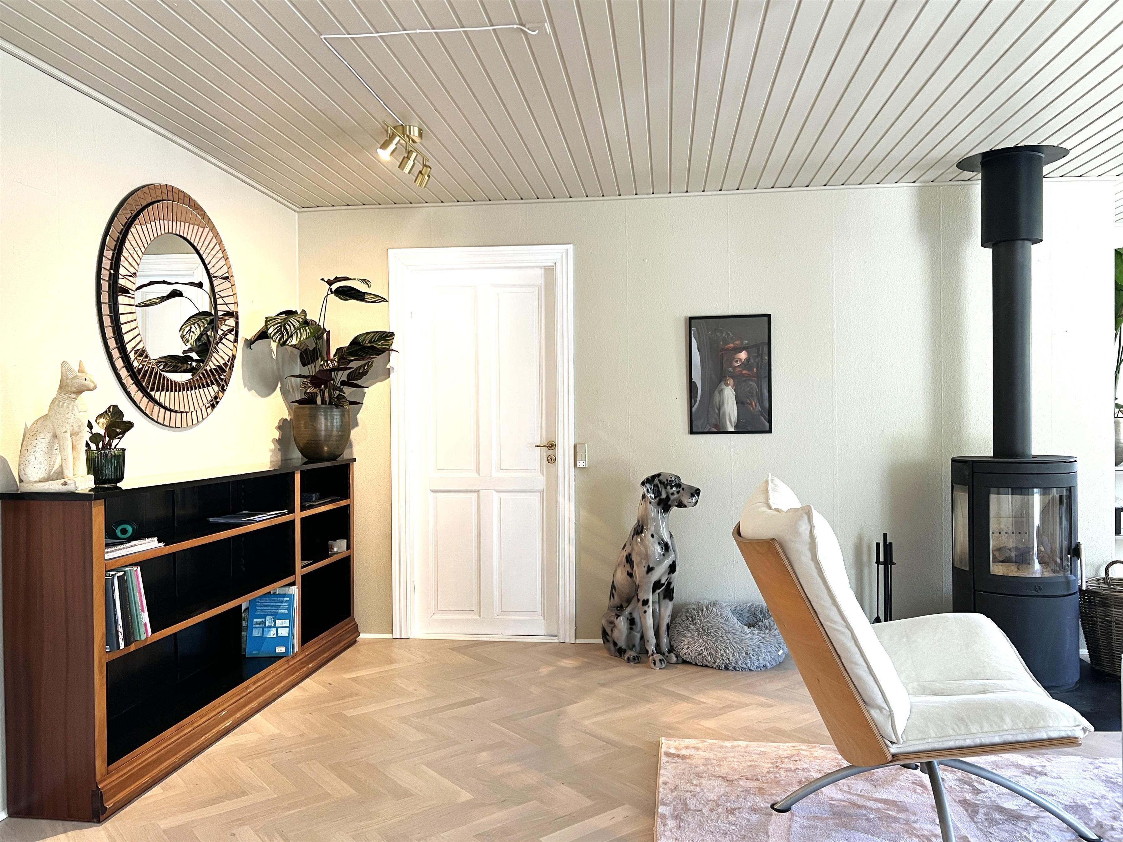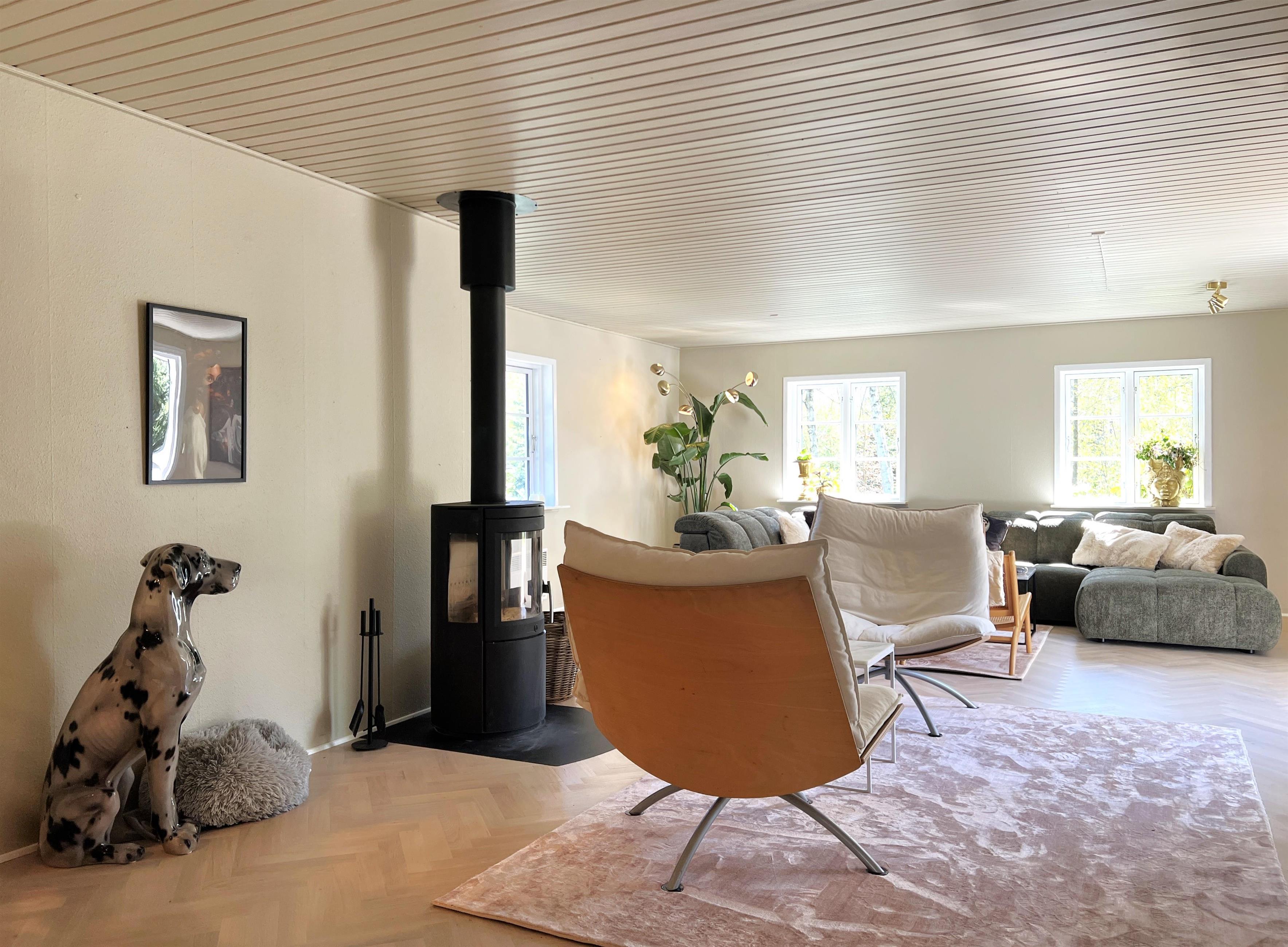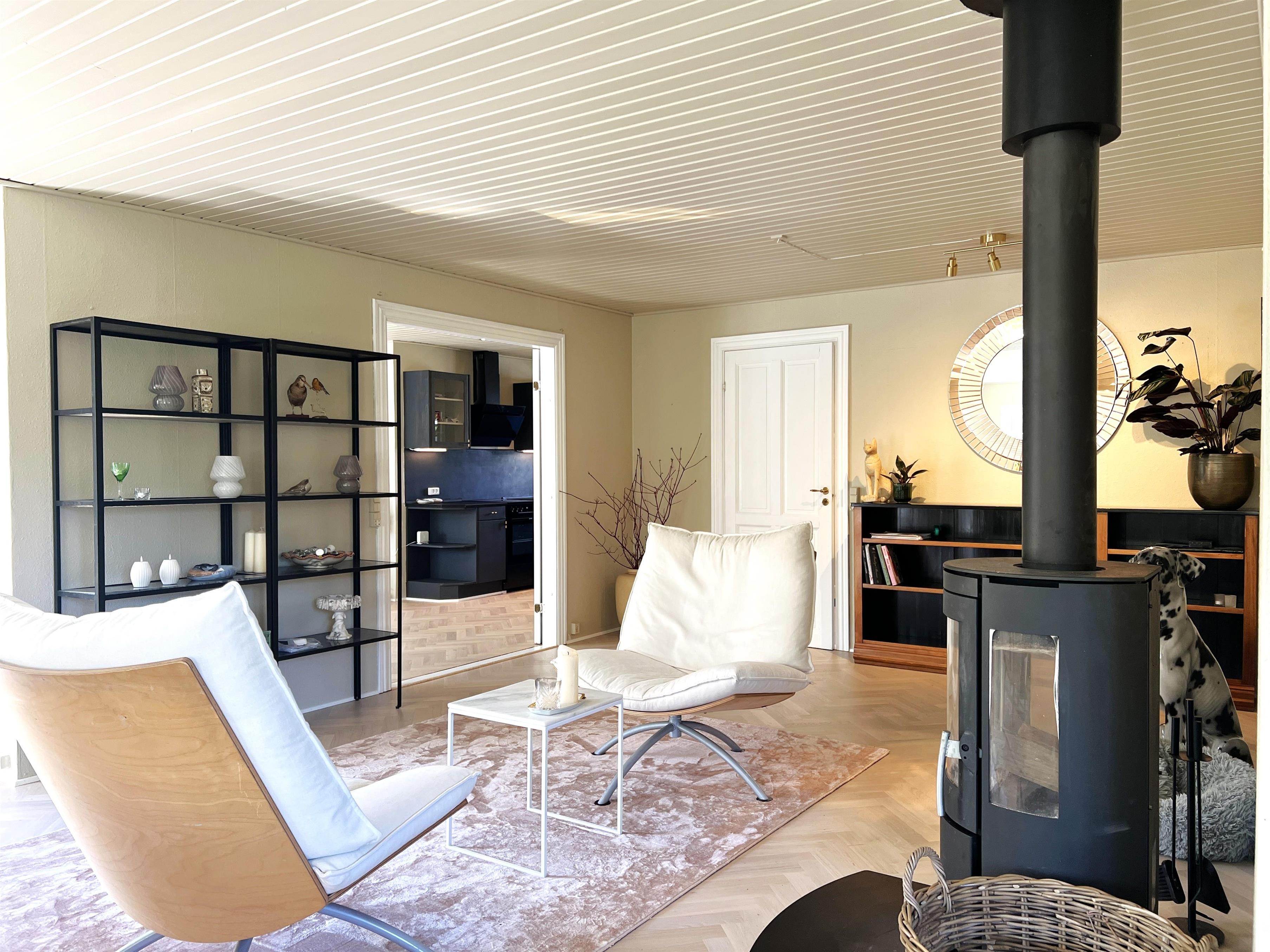 Huset har et fint, stilrent køkken med spiseplads og den ene af husets to brændeovne. Fra spisestuen er der åben forbindelse til den store stue med TV (via Apple TV), hvor hele familien kan slappe af. Her er flere sæt behagelige møbler og en meget lækker, stor sofagruppe. Der er tale om en virkelig charmerende stil i husets stue, og der er lagt op til afslapning i særklasse. Fra stuen er der udgang til den store smukke have med prydbuske, terrasse, behagelige havemøbler og grill.