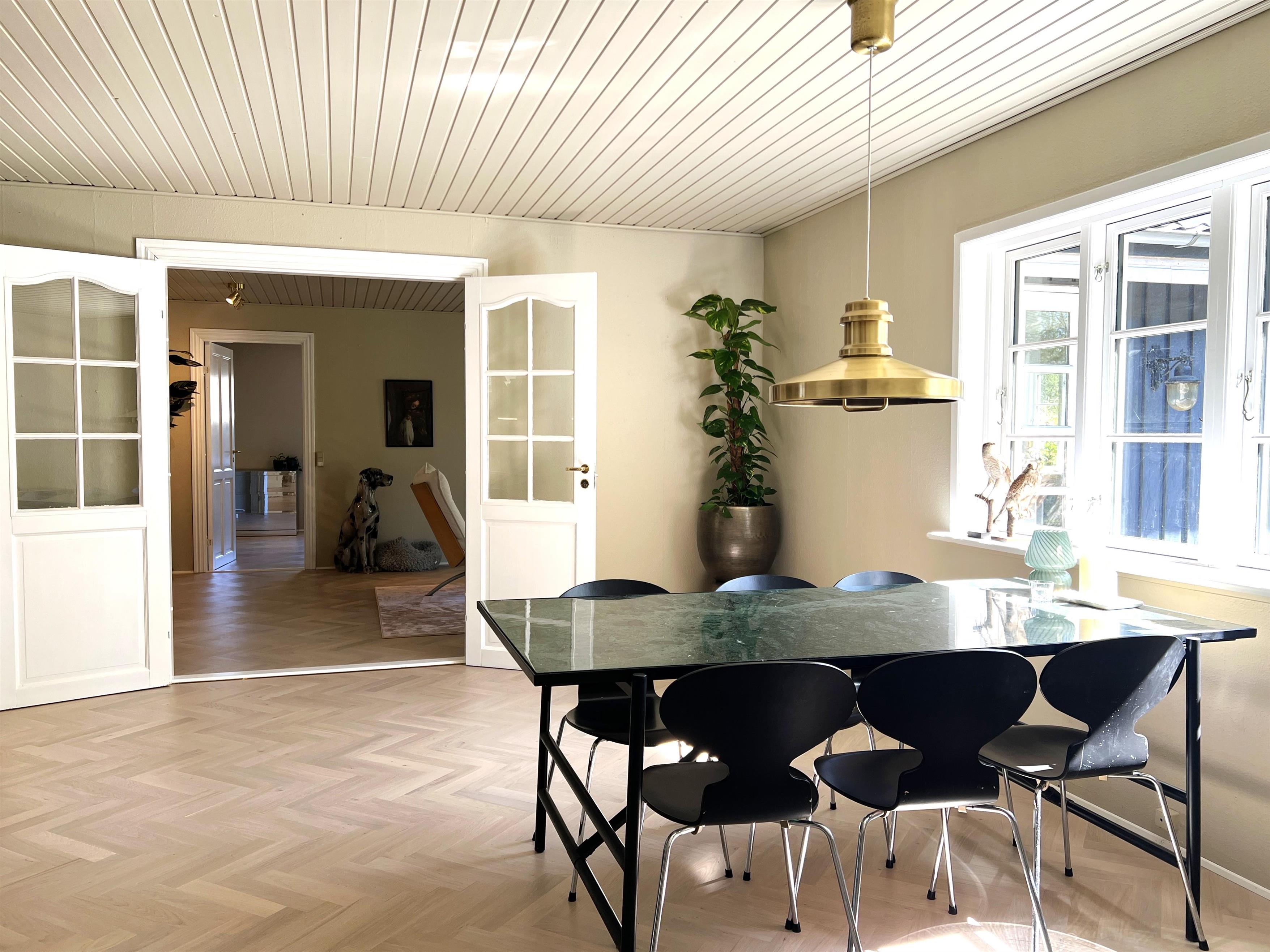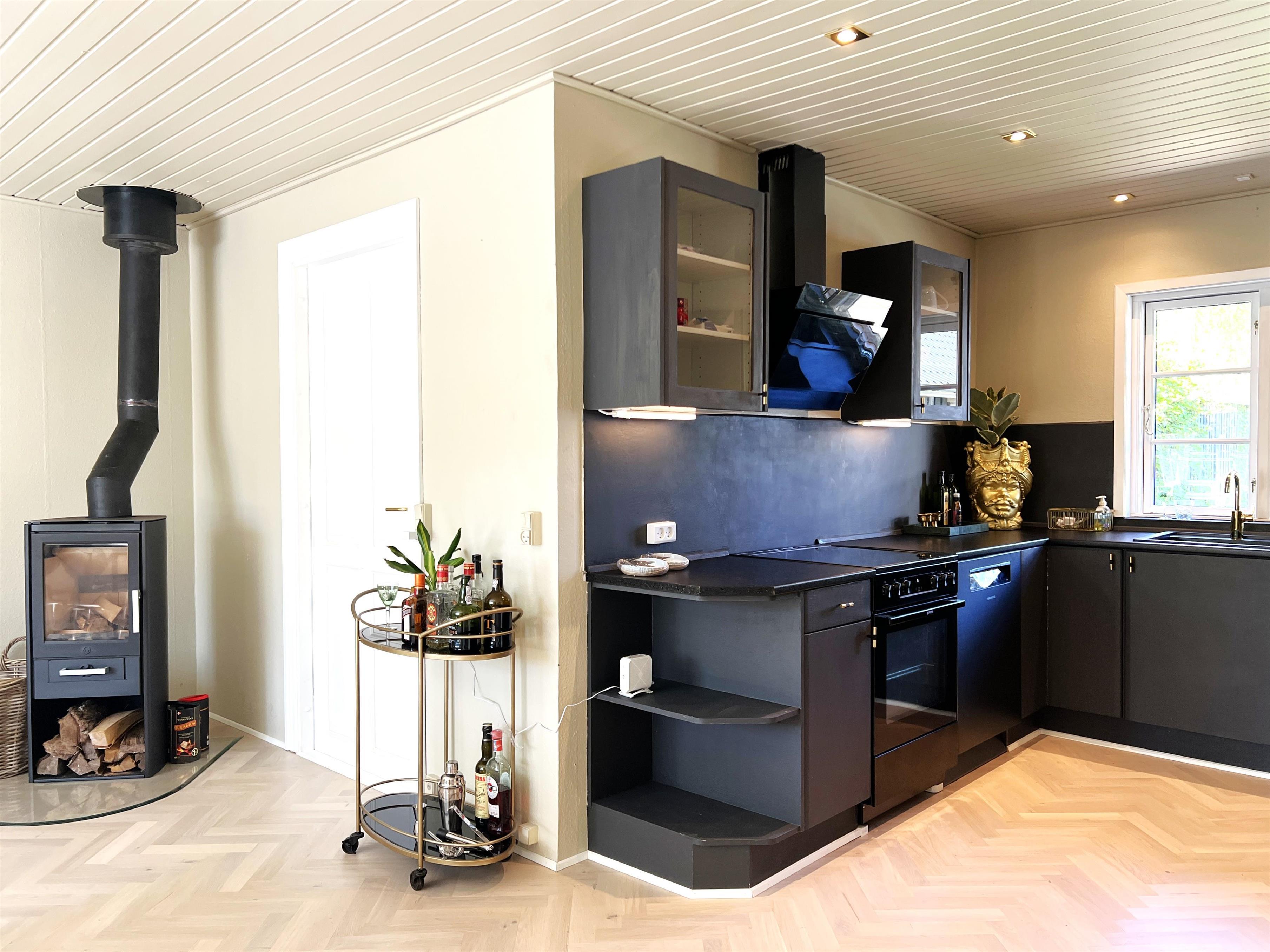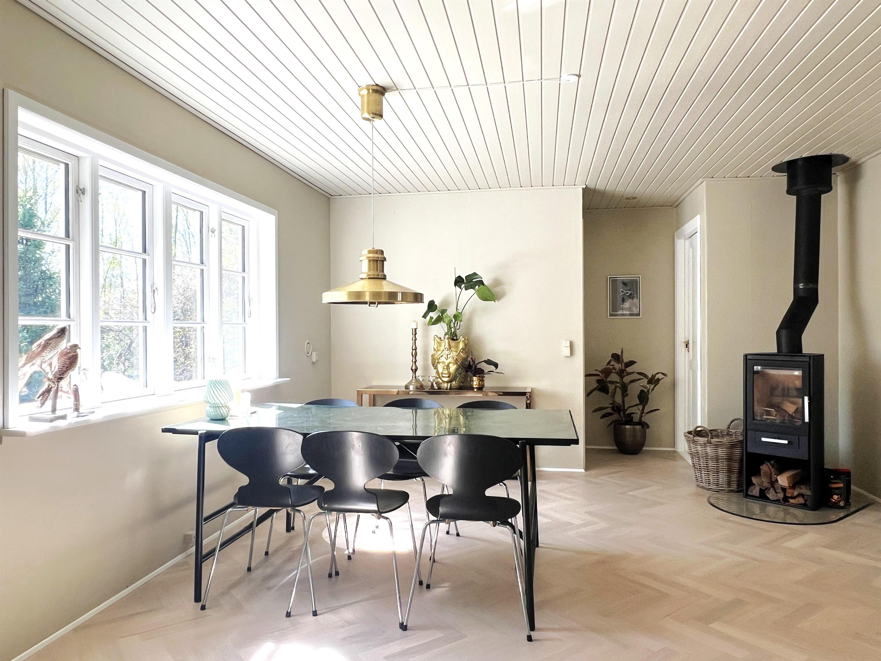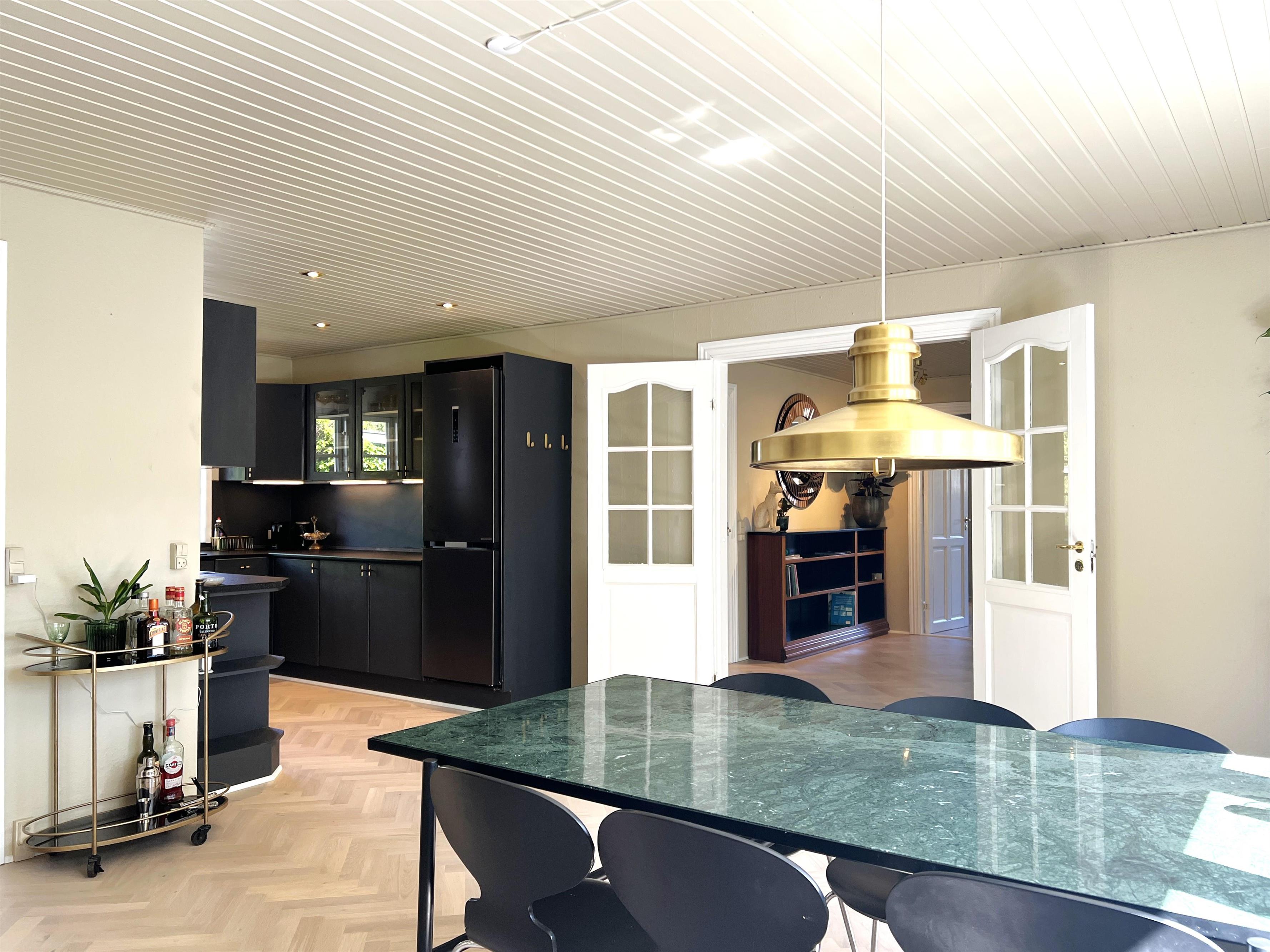 Huset har et fint, stilrent køkken med spiseplads og den ene af husets to brændeovne. Fra spisestuen er der åben forbindelse til den store stue med TV (via Apple TV), hvor hele familien kan slappe af. Her er flere sæt behagelige møbler og en meget lækker, stor sofagruppe. Der er tale om en virkelig charmerende stil i husets stue, og der er lagt op til afslapning i særklasse. Fra stuen er der udgang til den store smukke have med prydbuske, terrasse, behagelige havemøbler og grill.