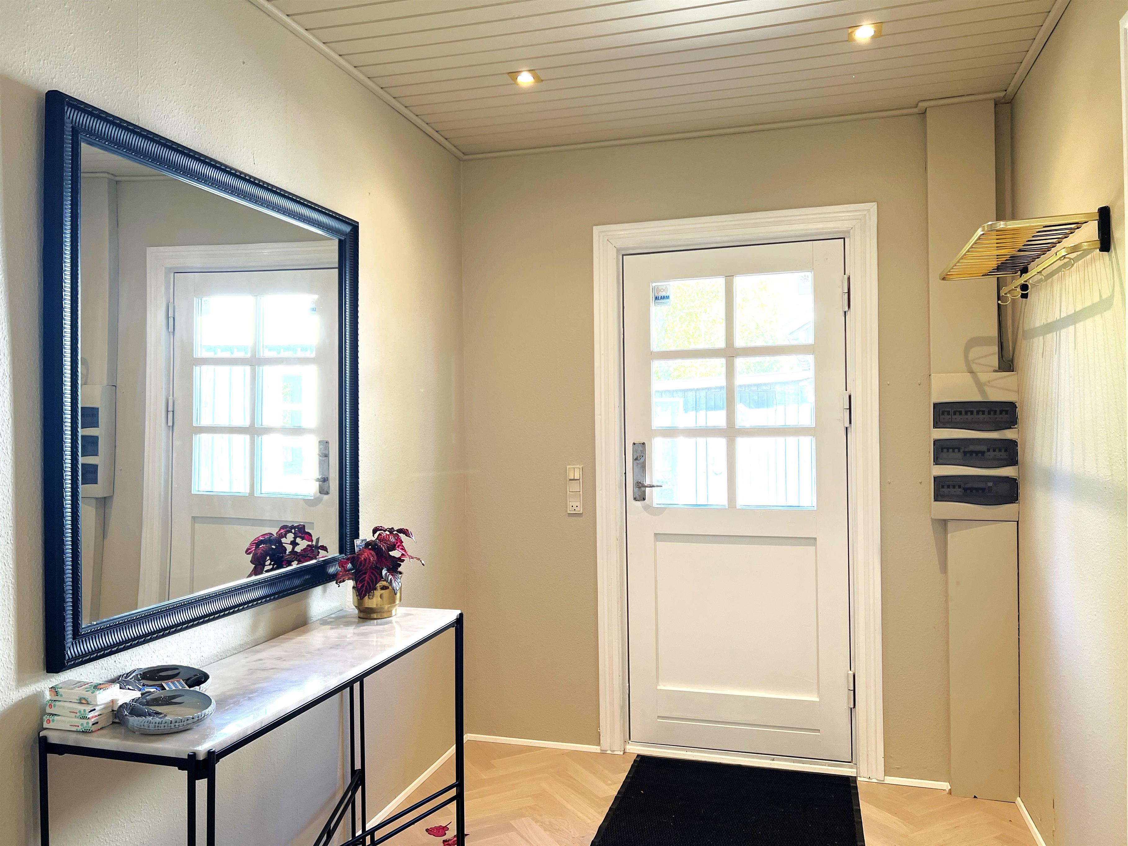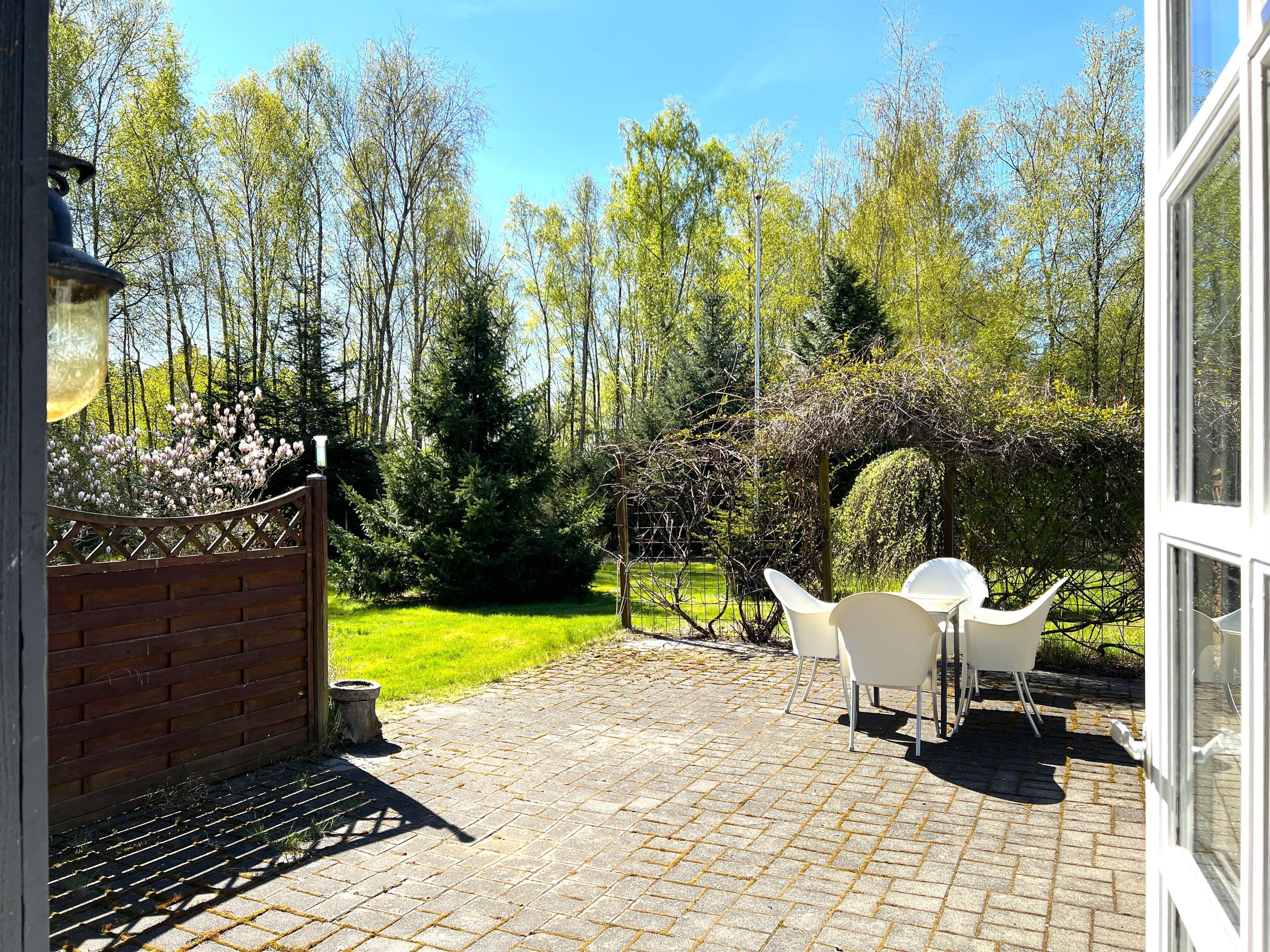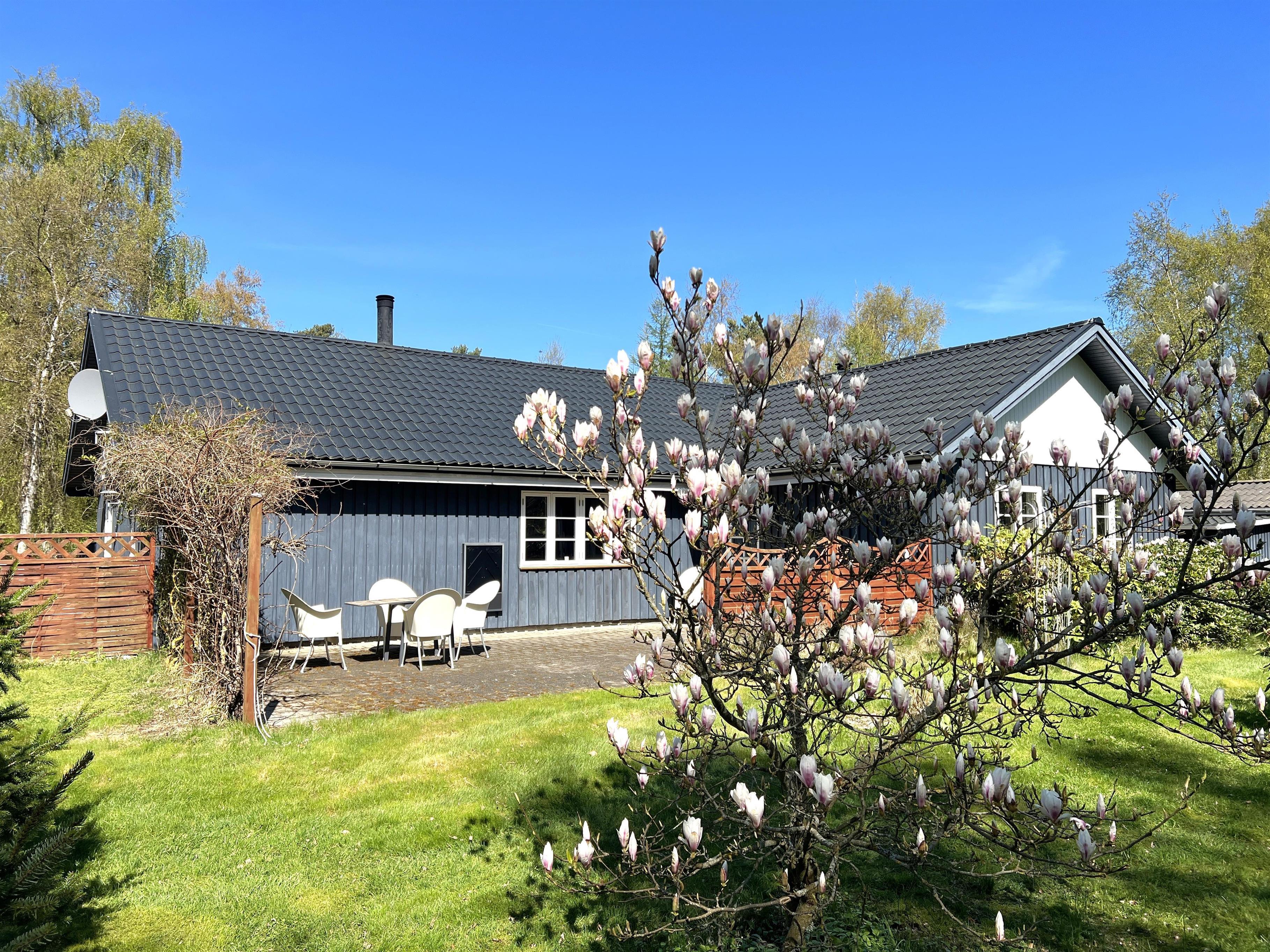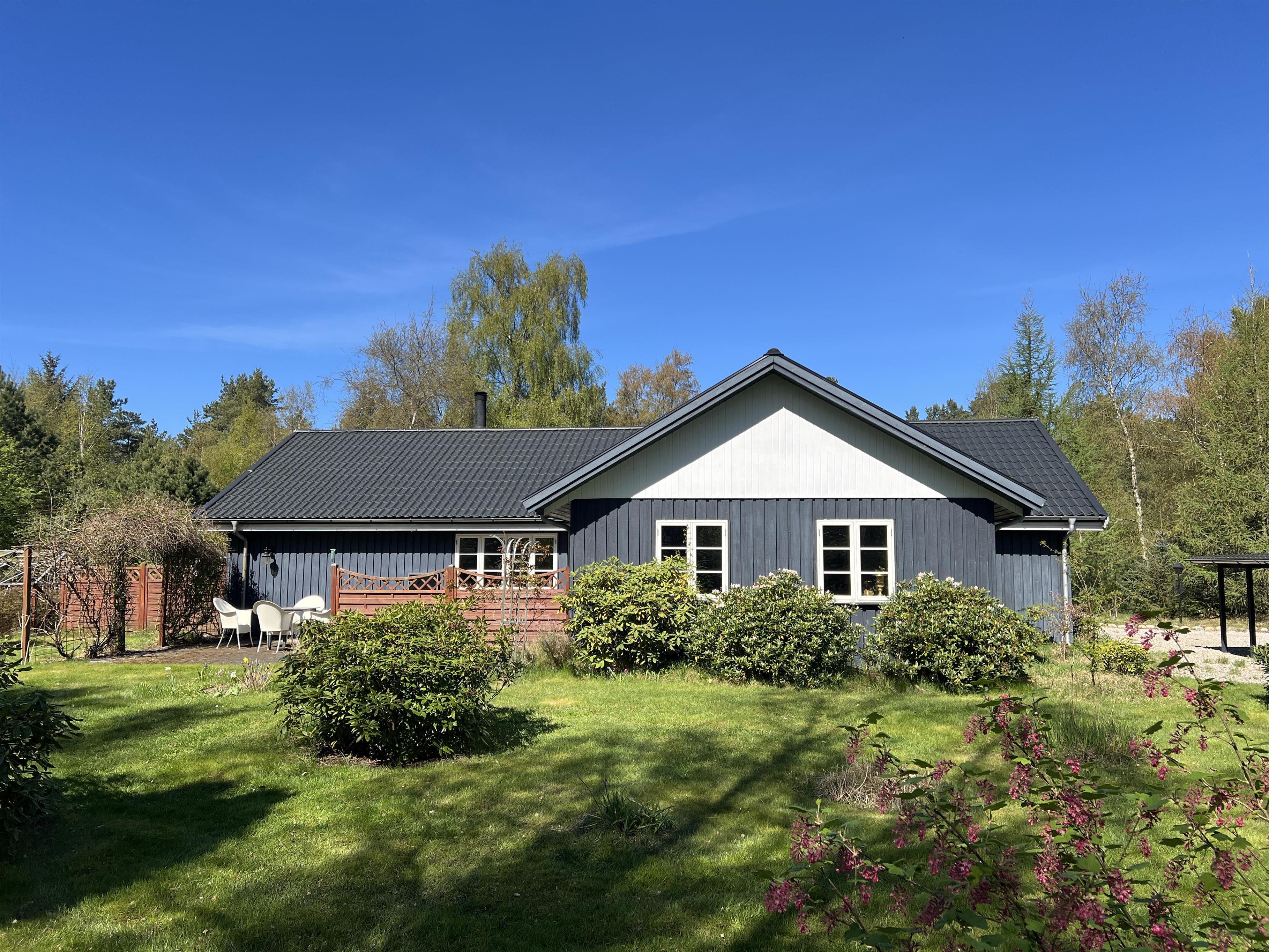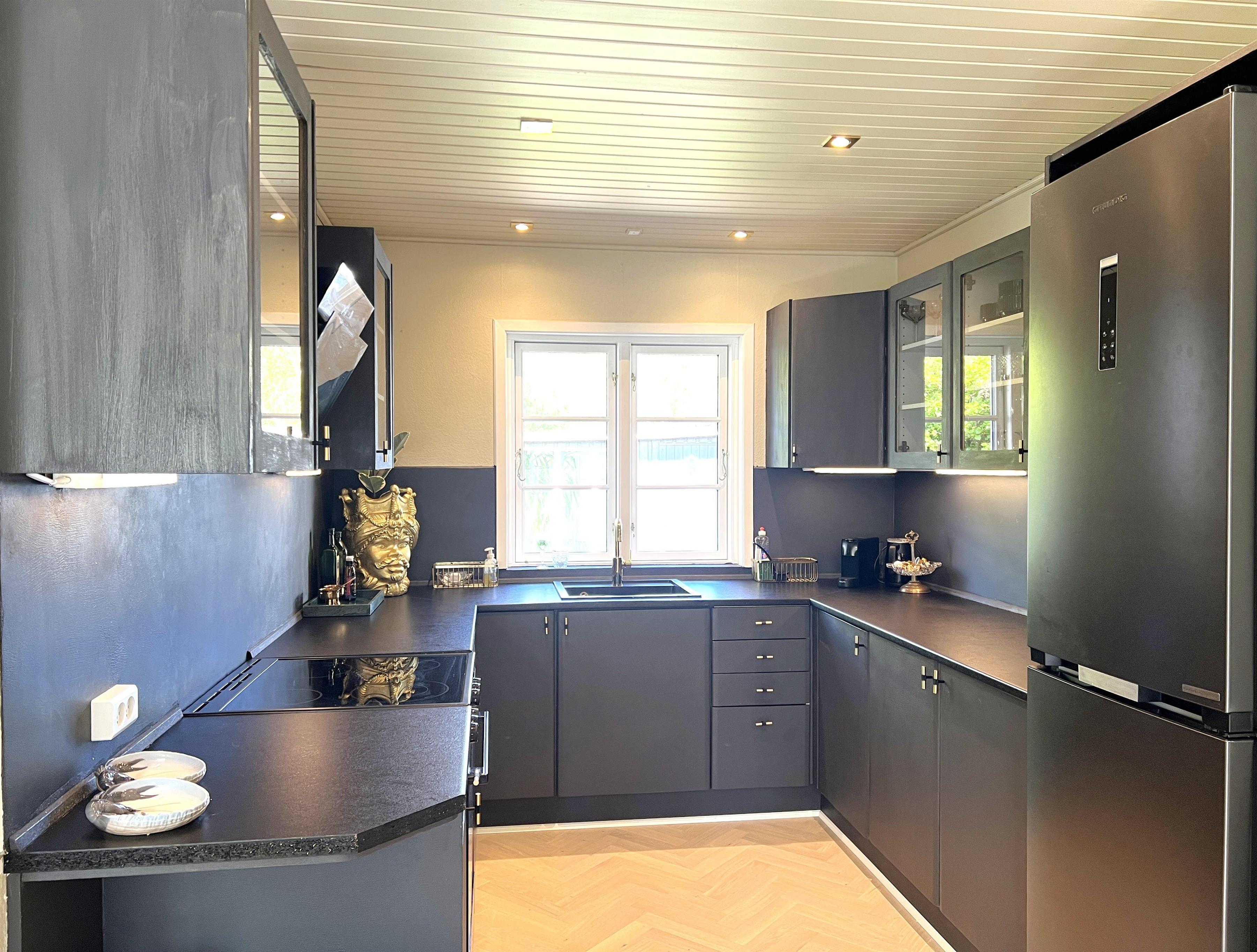 Huset har et fint, stilrent køkken med spiseplads og den ene af husets to brændeovne. Fra spisestuen er der åben forbindelse til den store stue med TV (via Apple TV), hvor hele familien kan slappe af. Her er flere sæt behagelige møbler og en meget lækker, stor sofagruppe. Der er tale om en virkelig charmerende stil i husets stue, og der er lagt op til afslapning i særklasse. Fra stuen er der udgang til den store smukke have med prydbuske, terrasse, behagelige havemøbler og grill.