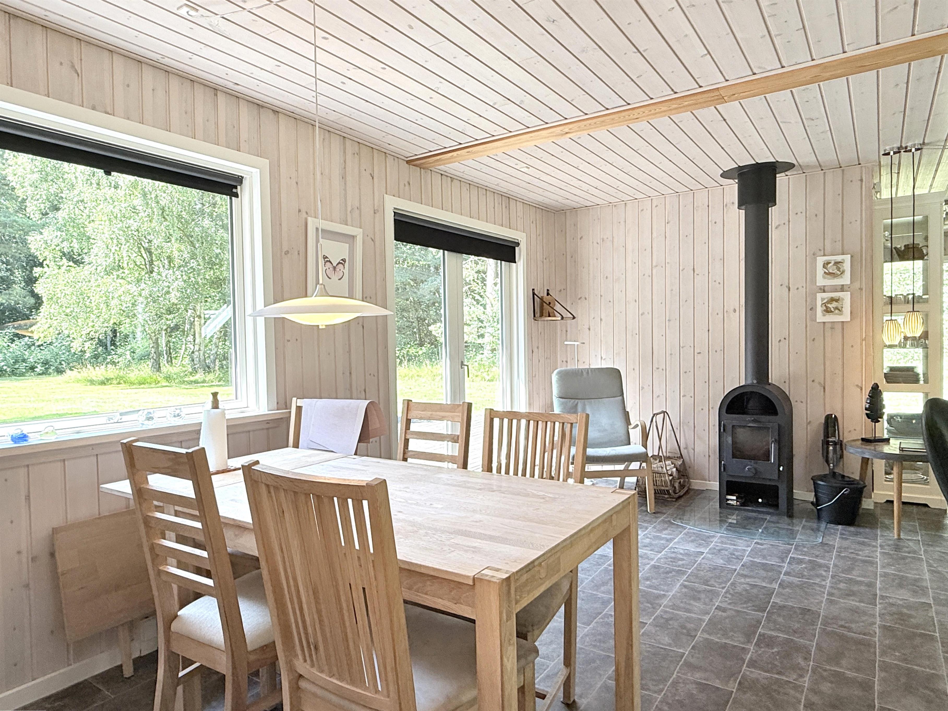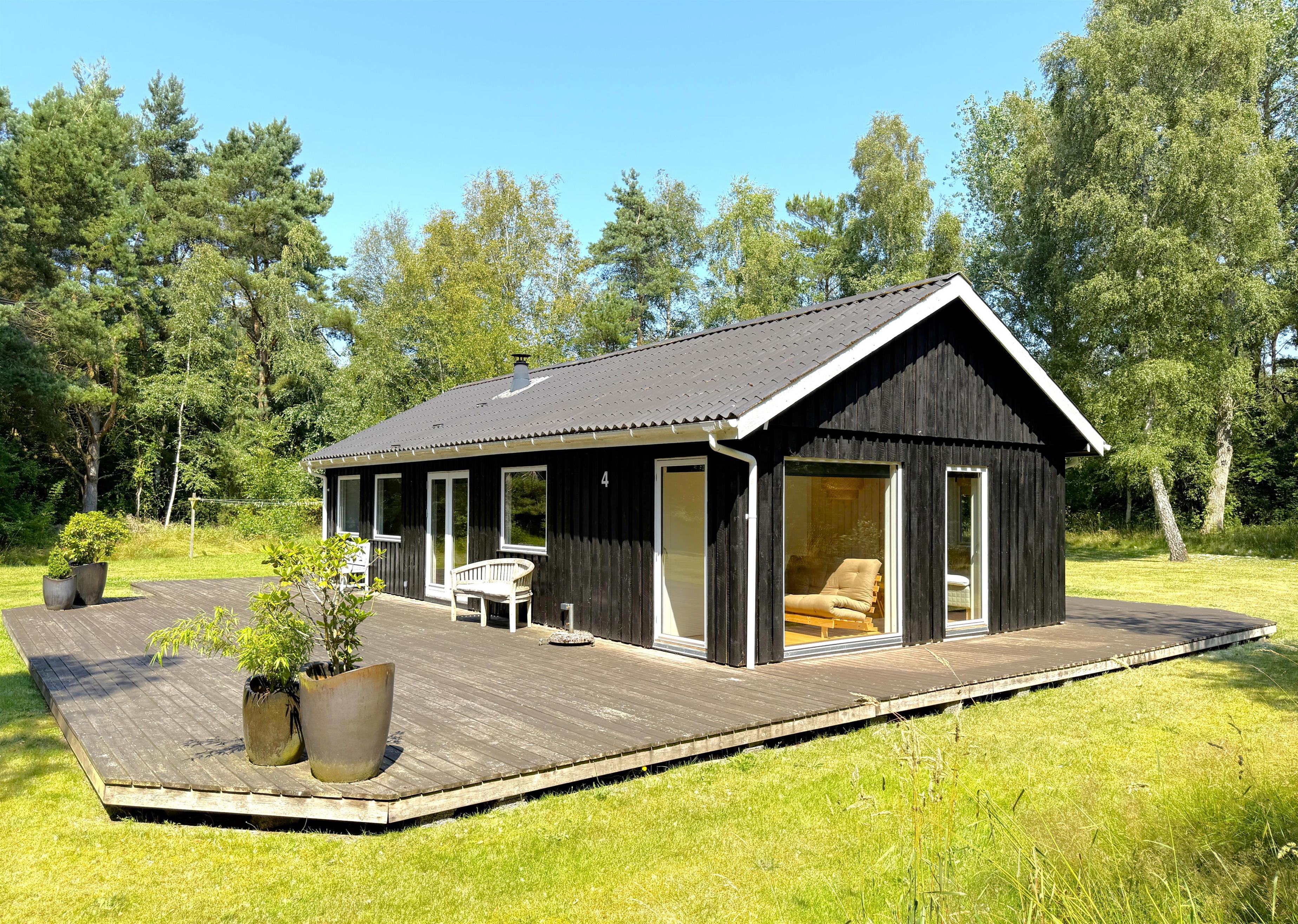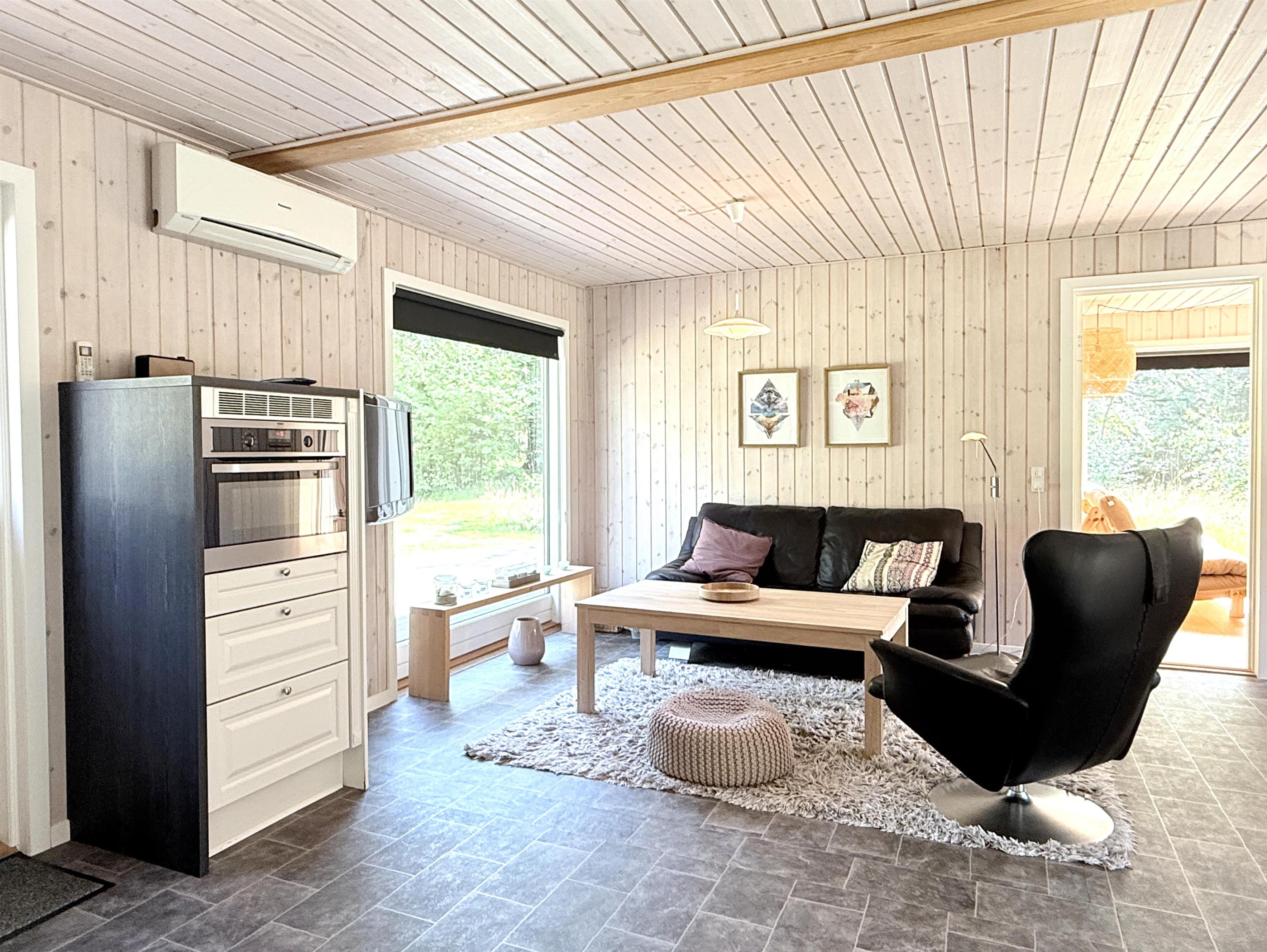 Feriehuset har et stort, lyst køkken-alrum med moderne køkken, spiseplads og hyggelig sofaafdeling med TV. Fra stuen er der udgang til den fine træterrasse, der indbyder til adskillige solrige stunder midt i naturen. Huset har to gode soveværelser med fin skabsplads og fra det ene er der også udgang til terrassen, hvor husets grill kan benyttes. Ekstra rum med sovesofa er også disponibelt, hvis man har brug for det. Der er desuden et splinternyt, lækkert badeværelse (2024). Udhus med vaske - og tørretumbler til rådighed. Der er, udover træterrassen med havemøbler og solsenge, flere hyggekroge på grunden, blandt andet en terrassekrog med fint læ og ekstra havemøbler samt et bålsted. Her kan både familien og hunden hygge sig.