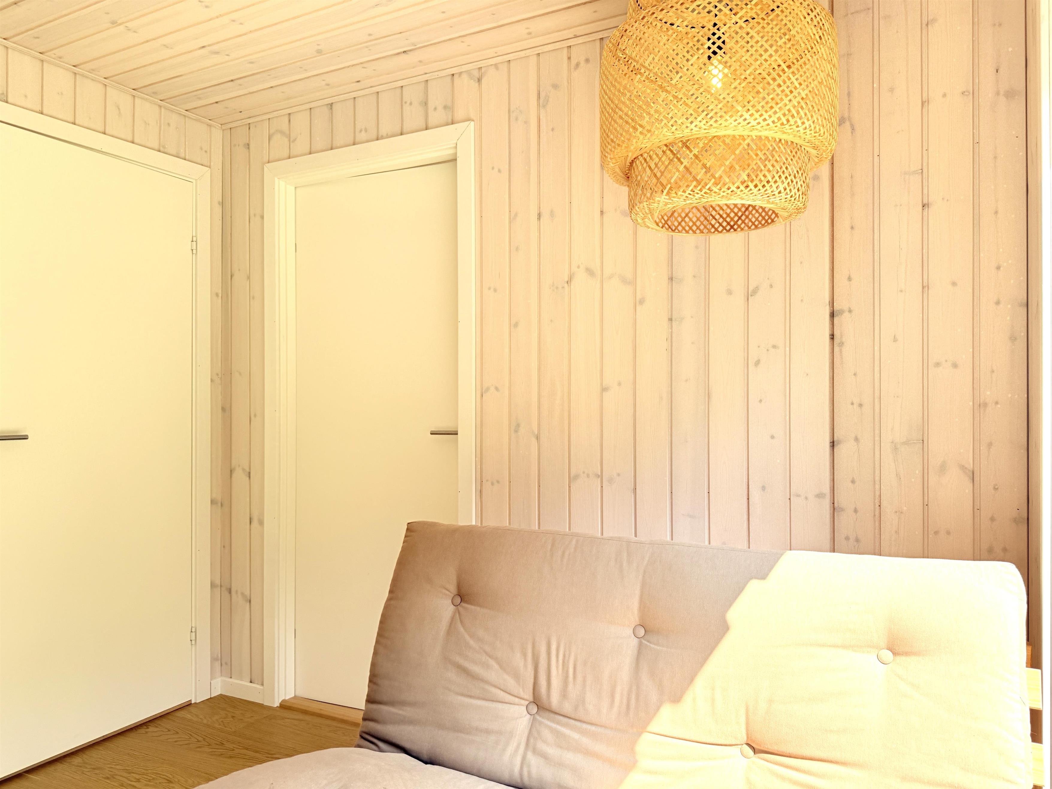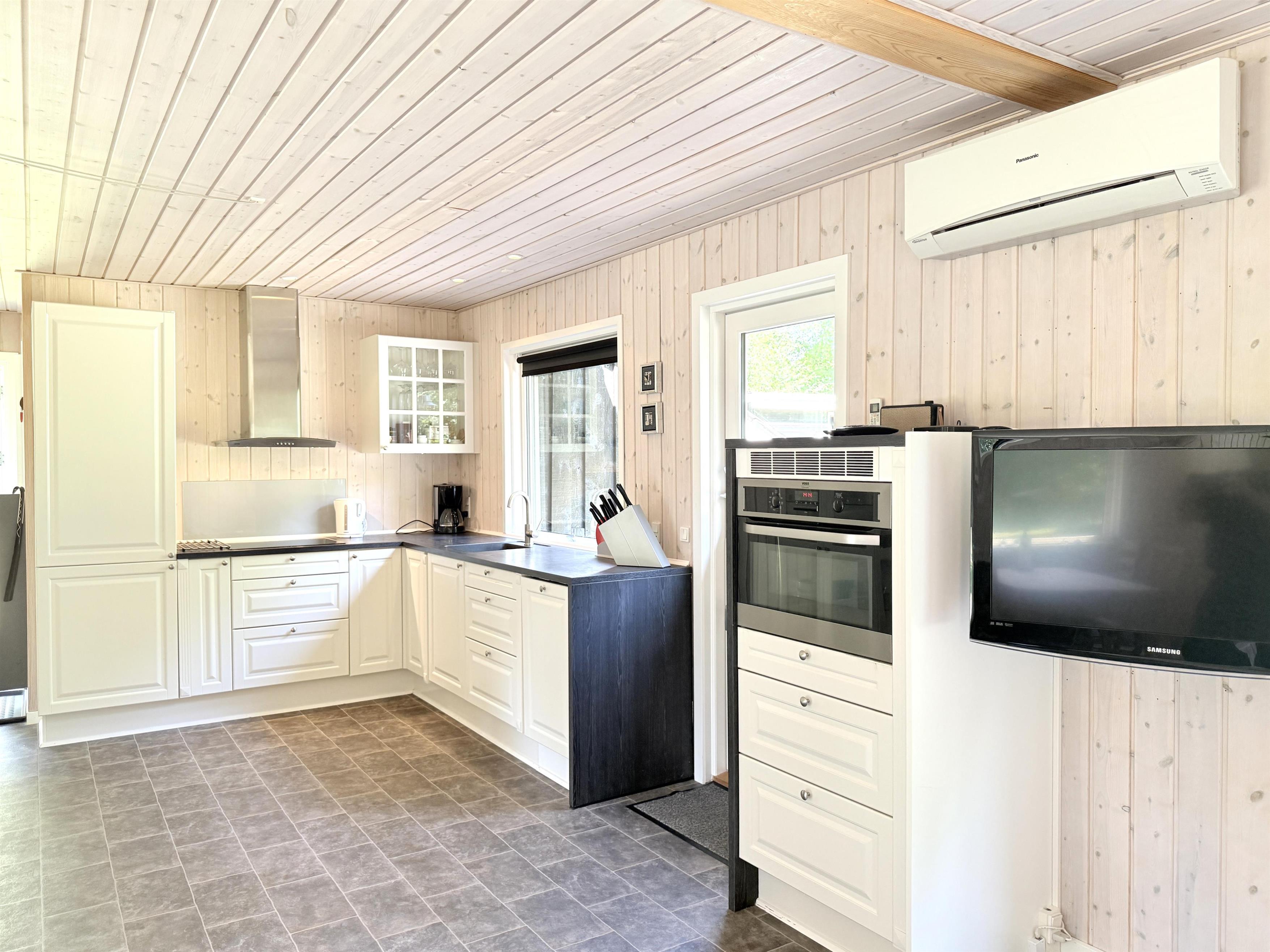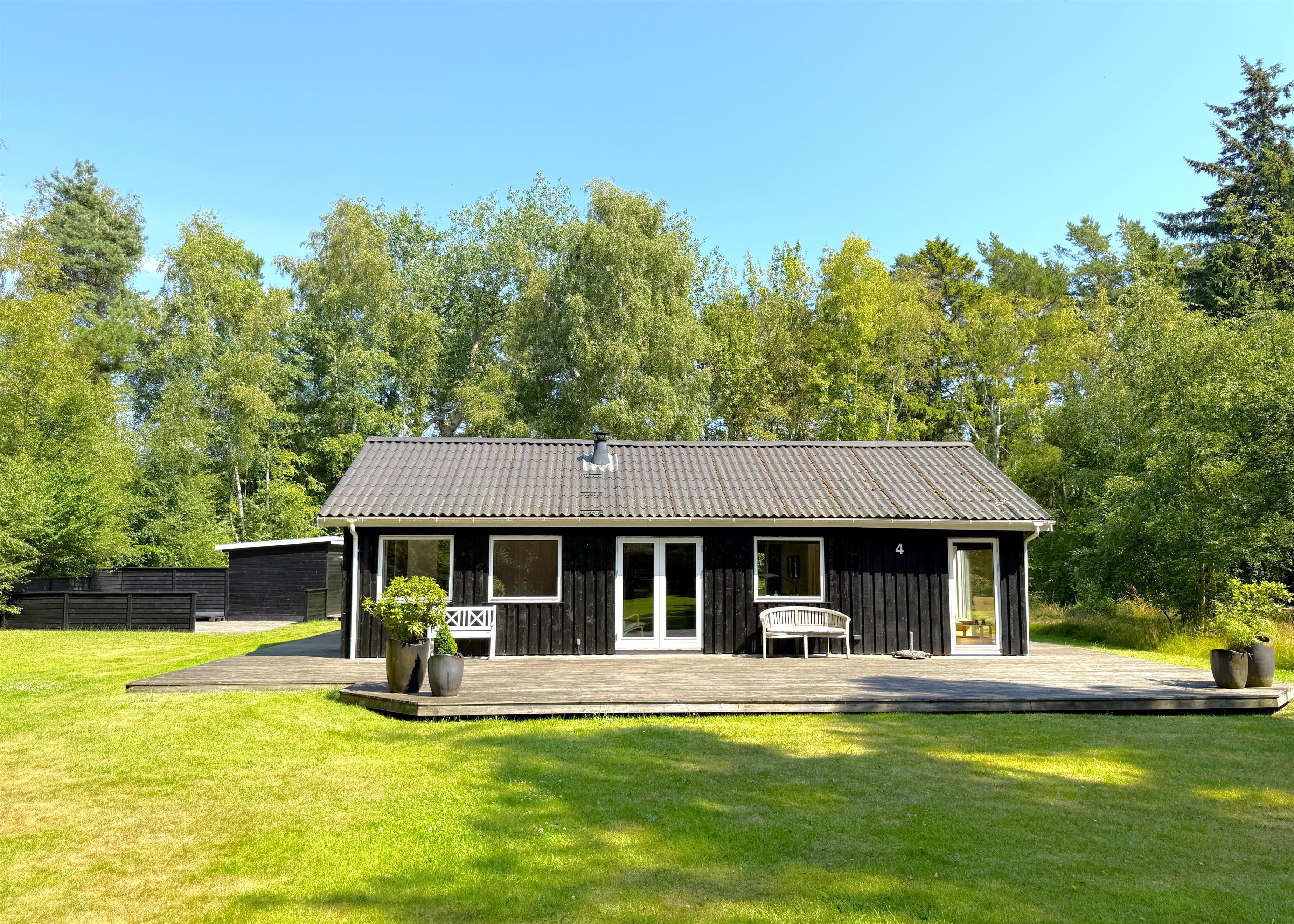 Feriehuset har et stort, lyst køkken-alrum med moderne køkken, spiseplads og hyggelig sofaafdeling med TV. Fra stuen er der udgang til den fine træterrasse, der indbyder til adskillige solrige stunder midt i naturen. Huset har to gode soveværelser med fin skabsplads og fra det ene er der også udgang til terrassen, hvor husets grill kan benyttes. Ekstra rum med sovesofa er også disponibelt, hvis man har brug for det. Der er desuden et splinternyt, lækkert badeværelse (2024). Udhus med vaske - og tørretumbler til rådighed. Der er, udover træterrassen med havemøbler og solsenge, flere hyggekroge på grunden, blandt andet en terrassekrog med fint læ og ekstra havemøbler samt et bålsted. Her kan både familien og hunden hygge sig.