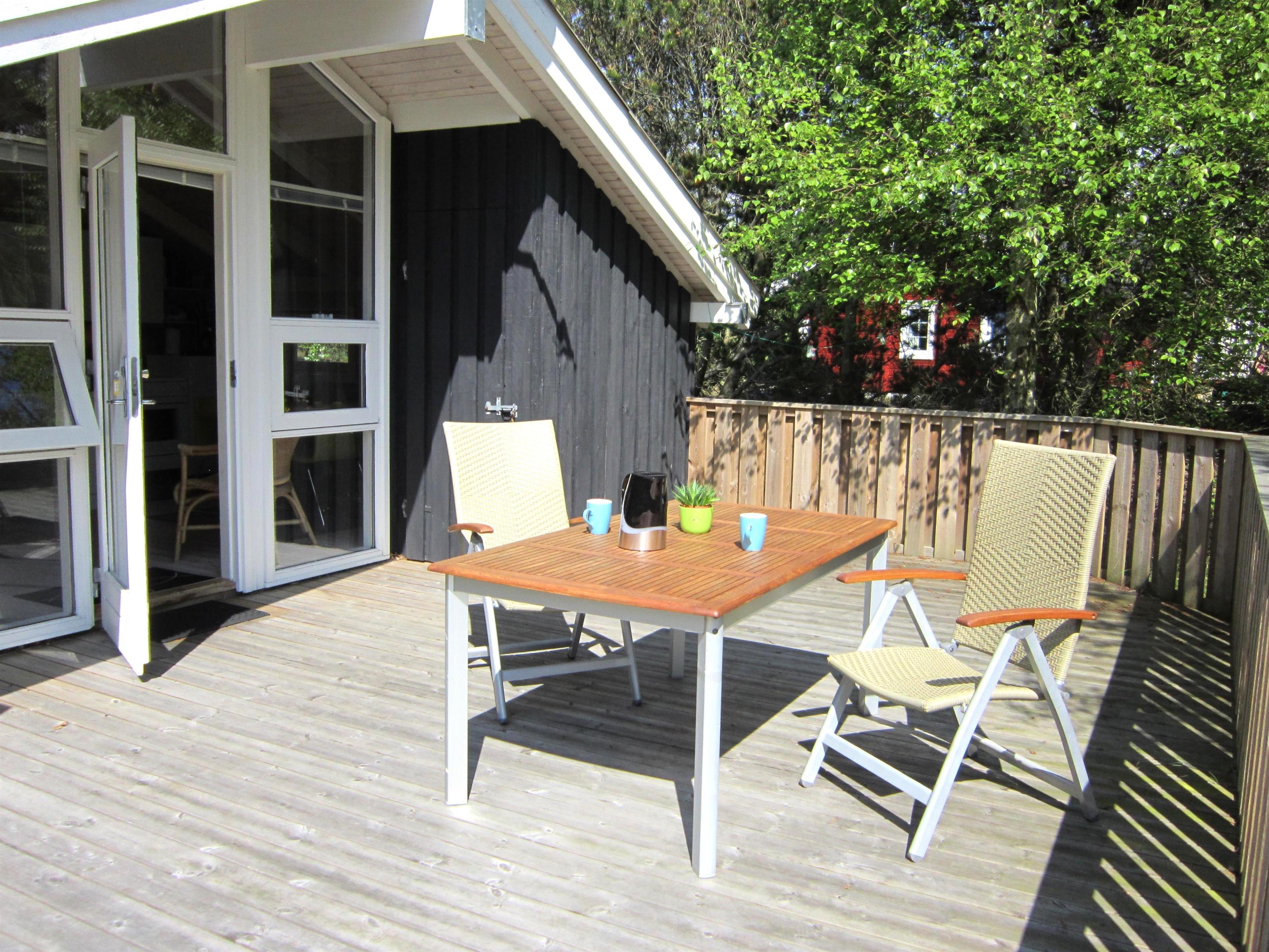 Stor ugenert træterrasse med havemøbler.