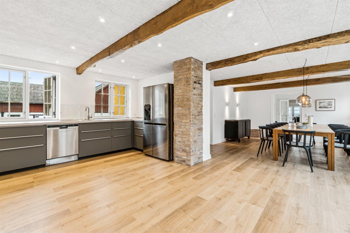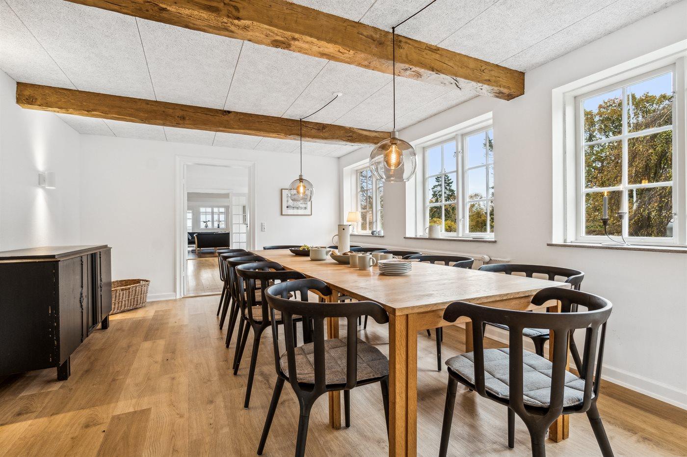 Det nye store køkken giver da også løfter om, at madlavningen kan være praktisk og kan forberedes sammen med familien - der er bare god plads. Med en større spisestue virker det næsten højtideligt ved det lange flotte bord - efter maden kan man trække ind i den hyggelige opholdsstue eller måske endda ud i udestuen, hvor de mange større vinduer giver de bedste udsigtsmuligheder.