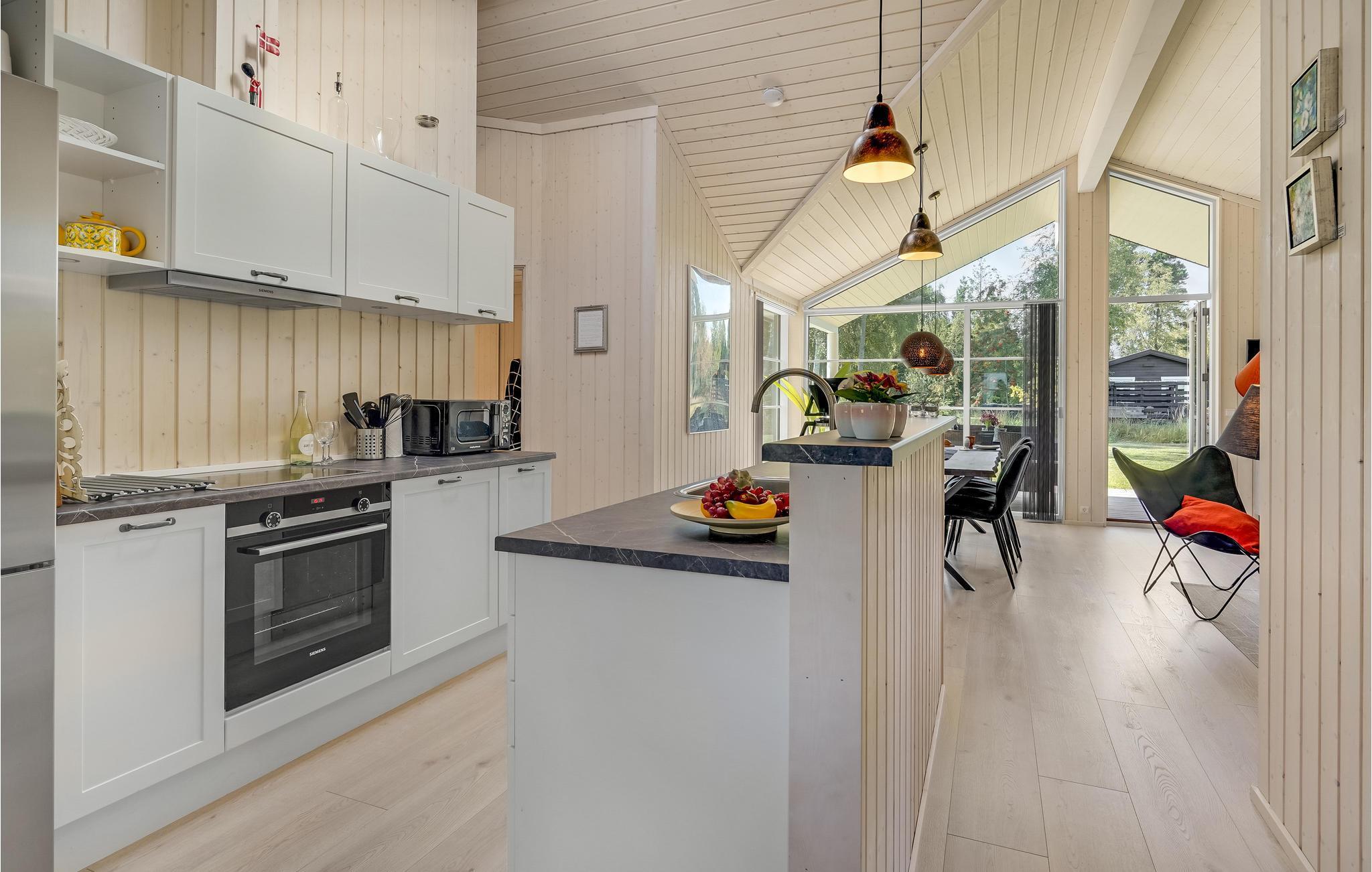 Der er dejlige, store lysindfald gennem gulv til loft-vinduer i opholdsstuen, og samtidig får I en dejlig udsigt til udendørsrammerne, mens I er samlet om middagsbordet. Huset er pænt og moderne indrettet. Brændeovnen sørger for ekstra varme og stemning på en kold vintermorgen.