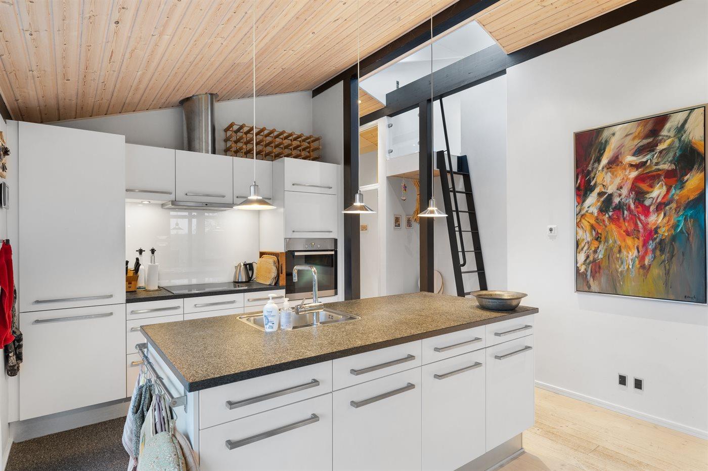 Køkkenet er udstyret med 1 køleskab. Der er 4 induktionskogeplader, varmluftovn samt opvaskemaskine.