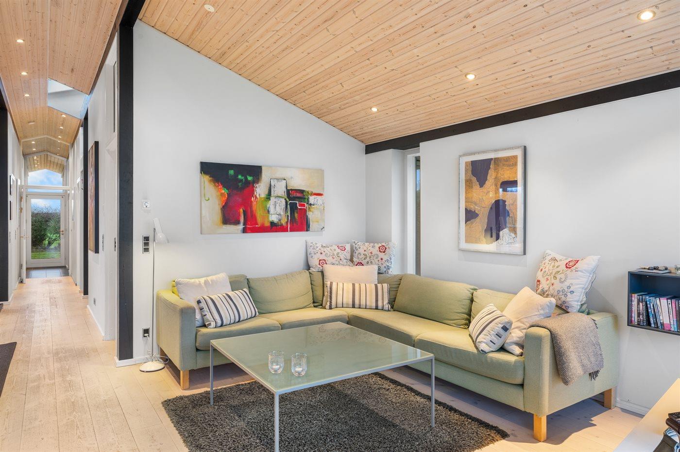 Huset er lyst og moderne indrettet, og der er flere dejlige terrasser omkring huset, hvoraf den største er sydvendt.