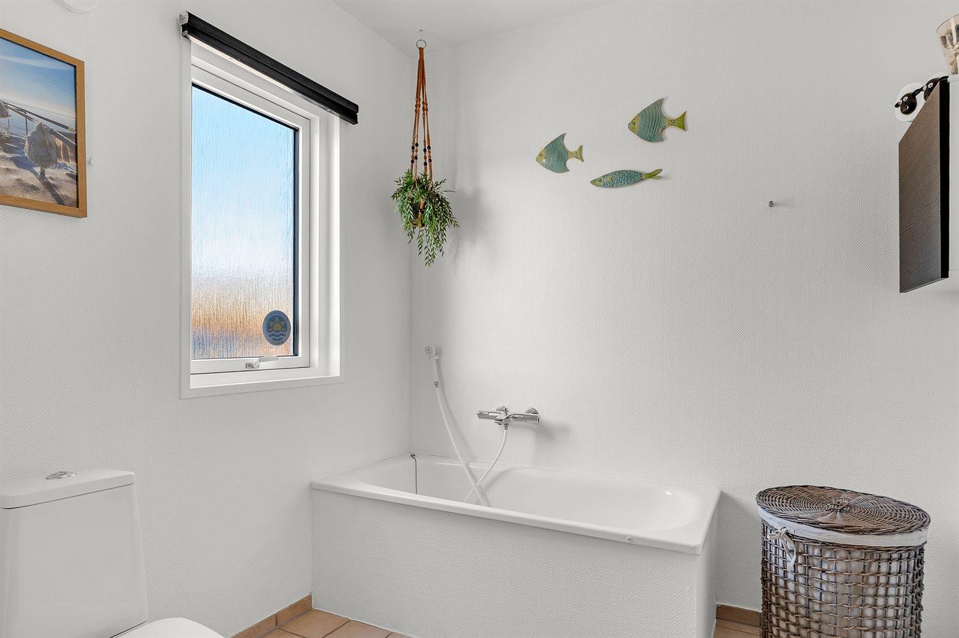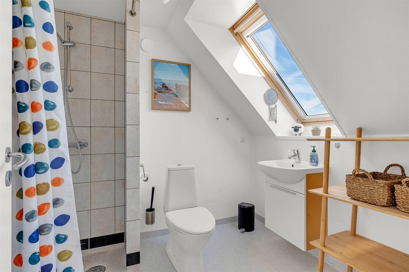 Der er 2 badeværelser med bruseniche og 2 toiletter. Der er gulvvarme på 1 badeværelse.. Badekar.