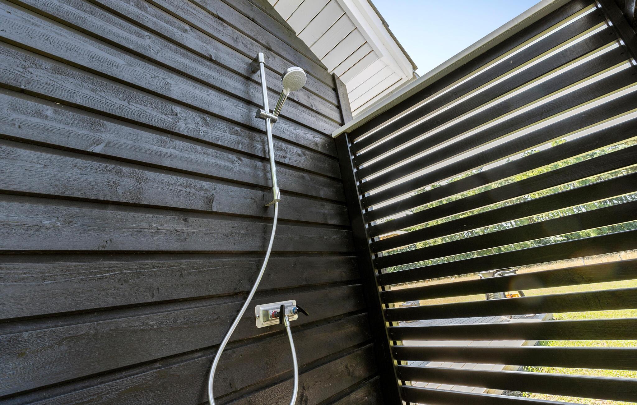 Udeområdet er tilsvarende lækkert. På den store grund er der en stor træterrasse med gode liggestole og havemøbler, hvor I kan lade jer bage godt igennem og nyde solen. Køl jer af under bruseren, når varmen er ved at få jer og lad børnene lege i haven, inden I tager på udflugt.