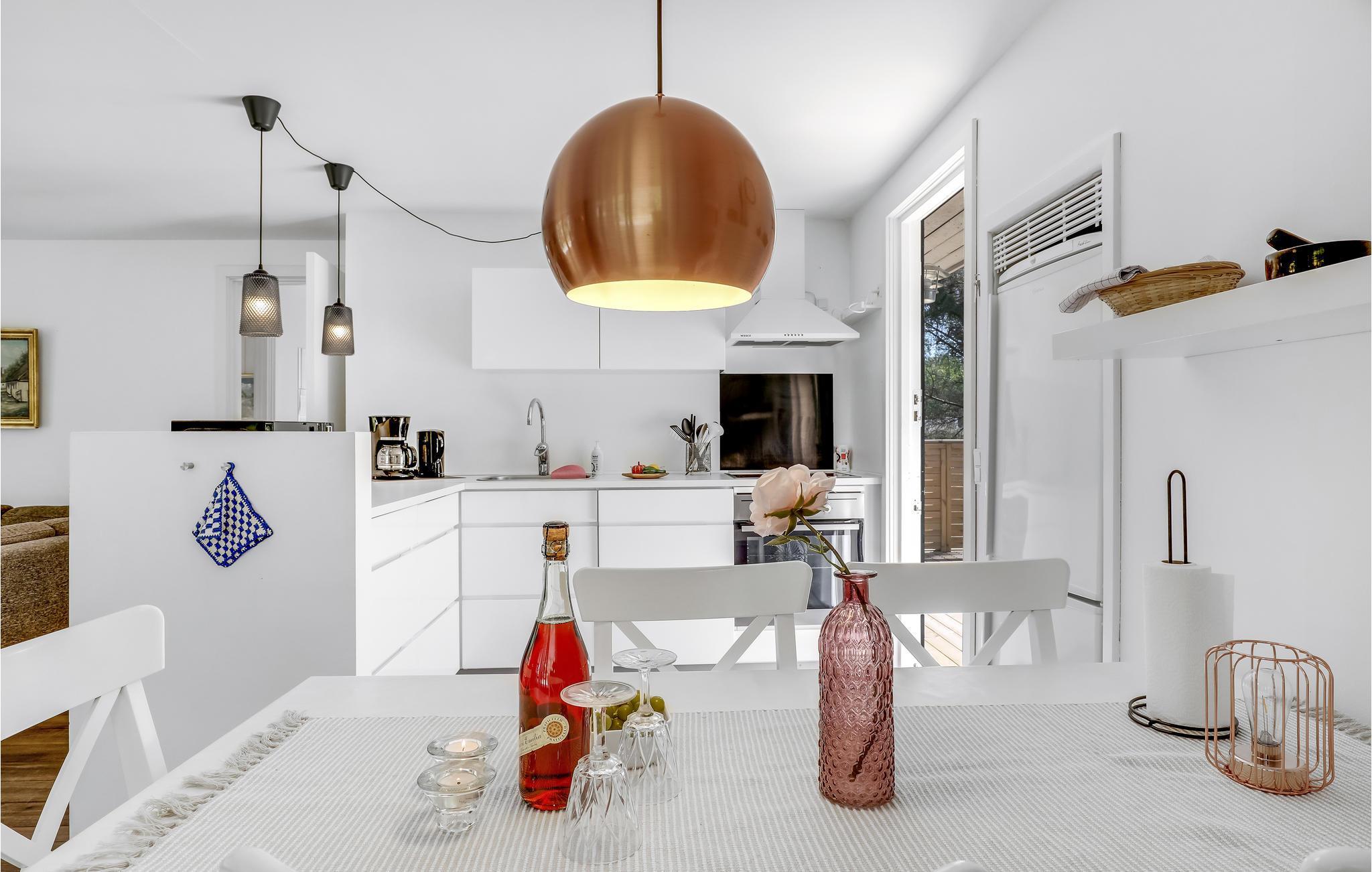 I et roligt sommerhusområde byder dette indbydende feriehus jer velkommen. Indenfor venter jer et lyst og komfortabelt møbleret interiør, der gør et varmt indtryk. I det rummelige køkkenalrum kan I lave mad sammen og nyde gode måltider rundt om spisebordet. Spil sjove brætspil og varm jer i de kølige årstider til lyden af brændeovnens knitren.