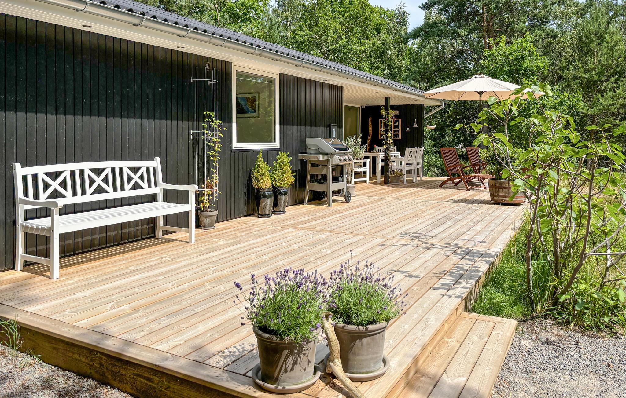 Flot moderniseret træsommerhus nær Bornholms bedste sandstrand med stor terrasse, brændeovn og gratis internet.