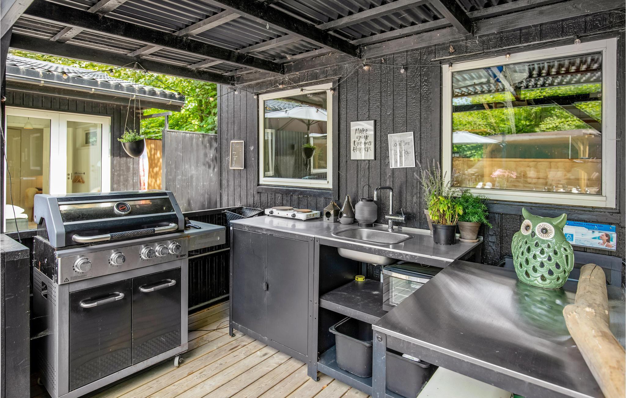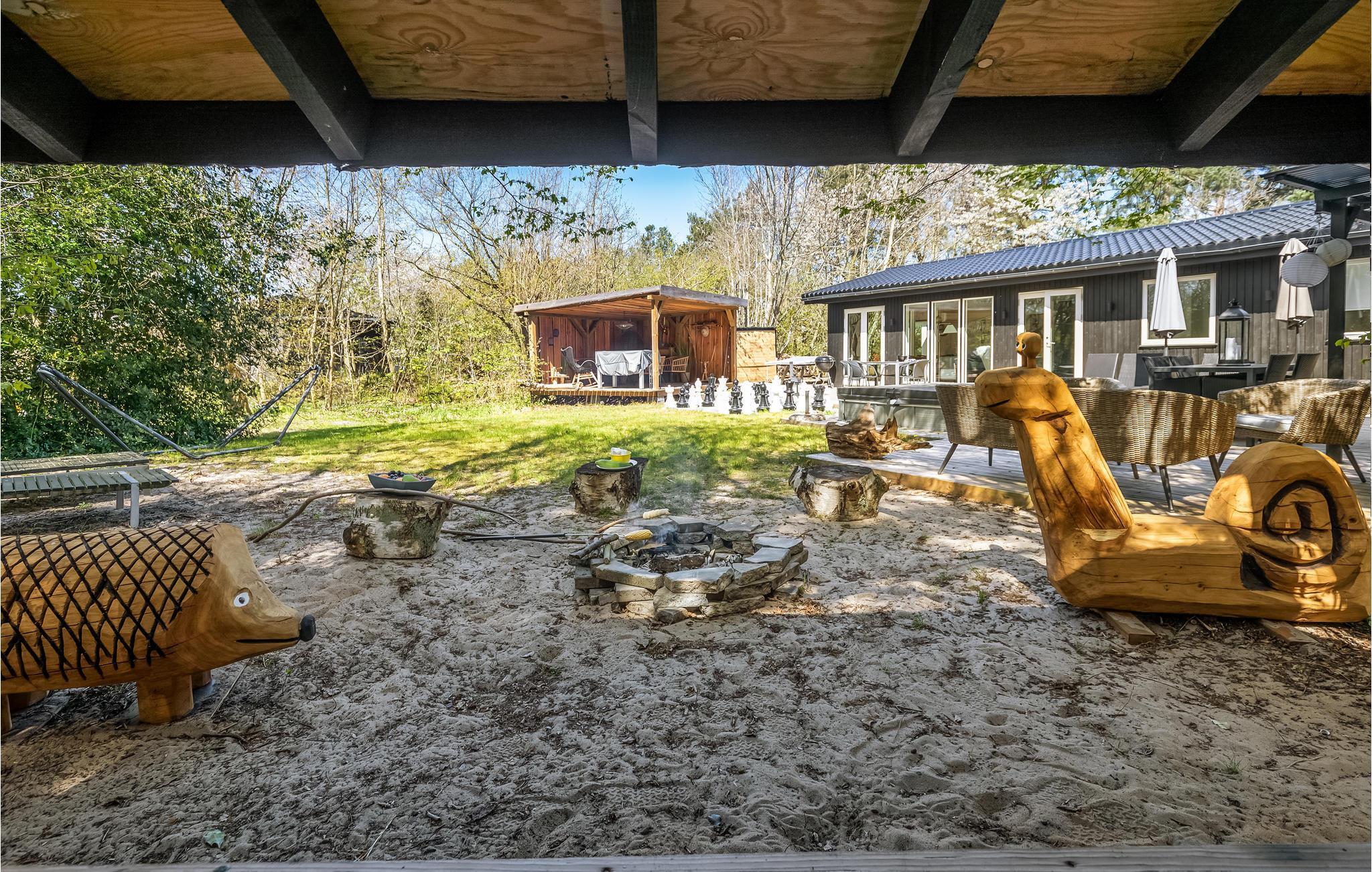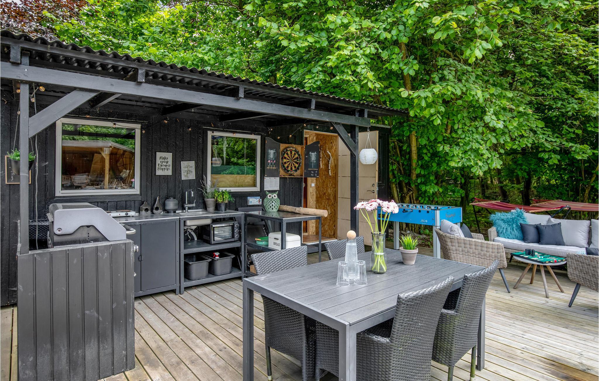 Huset ligger dejligt omkranset af træer. Terrassen er sydvendt, ugenert og solvenlig, og den er udstyret med havemøbler og liggestole. I kan også sidde under træets skygge og nyde loungemøblerne med en god bog. Der findes også udendørs stigegolf, bordbasket, haveskak, gynger, bordfodbold, bordtennis og dart - her er altså et væld af underholdningsmuligheder. Når mørket falder på, kan I nyde alle de små hyggelys, som er placeret rundt omkring. Her oplever man næsten sydlandsk stemning, og hvis I er stille, kan I høre havets brusen mellem træerne. På terrassen finder I også det flotte og velindrettede udekøkken, som har både vand og afløb, og der er også både en kul- og en gasgrill til rådighed, ligesom der er en pizzaovn, så I kan tilberede de helt store feriemåltider. I kan også slappe af i hængekøjerne og det skønne shelter, der fungerer som alletiders overdækkede hyggelige terrasse med dejlige møbler.