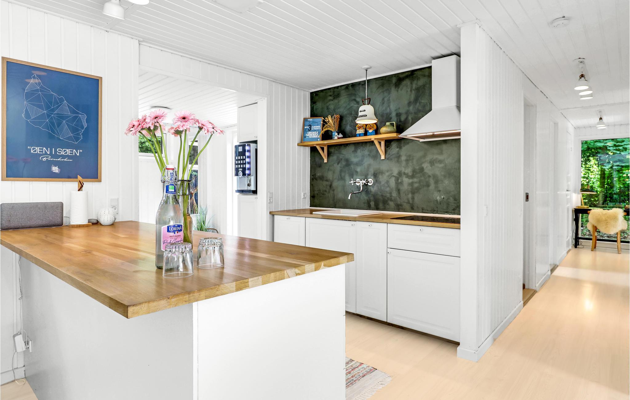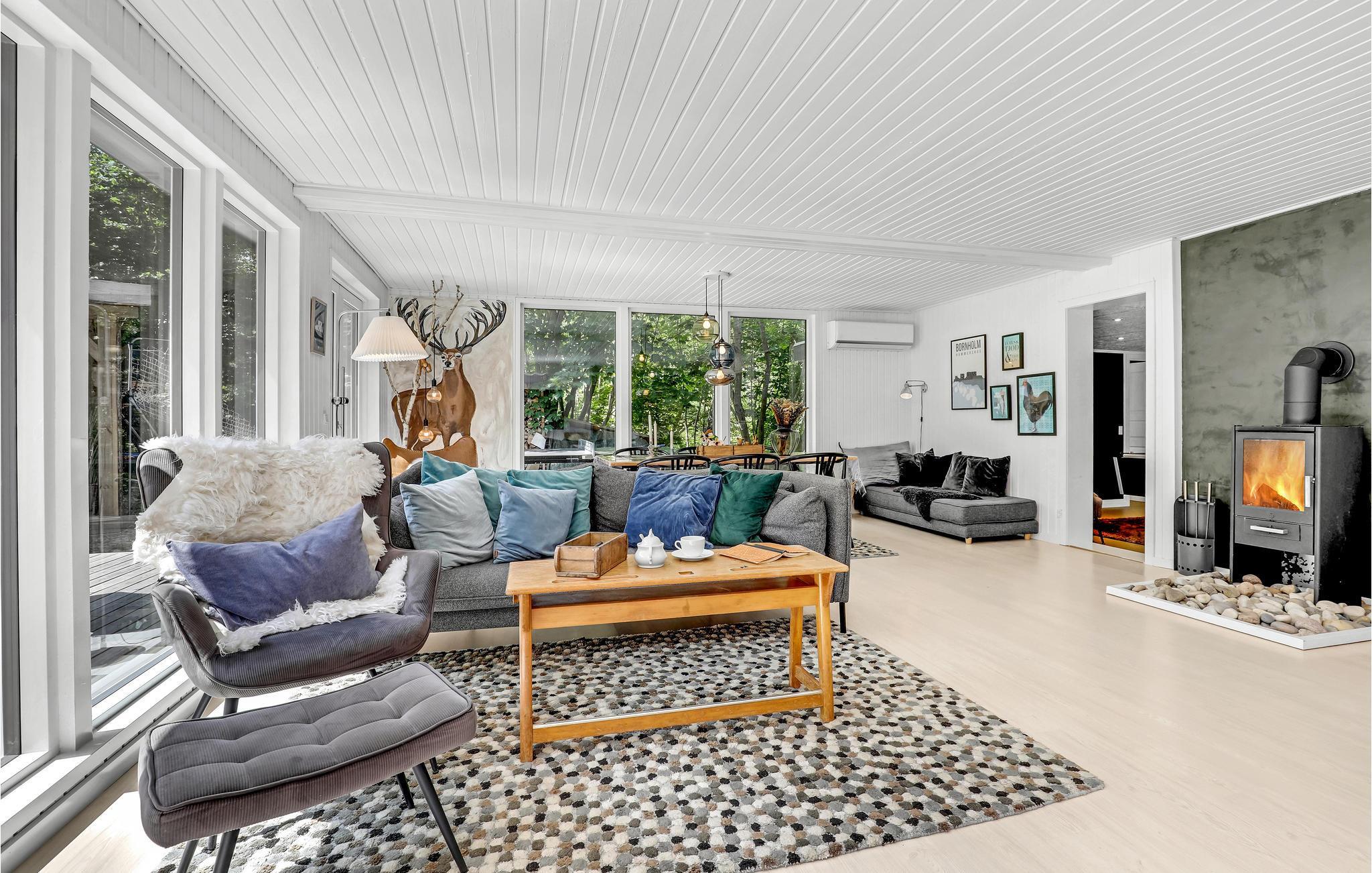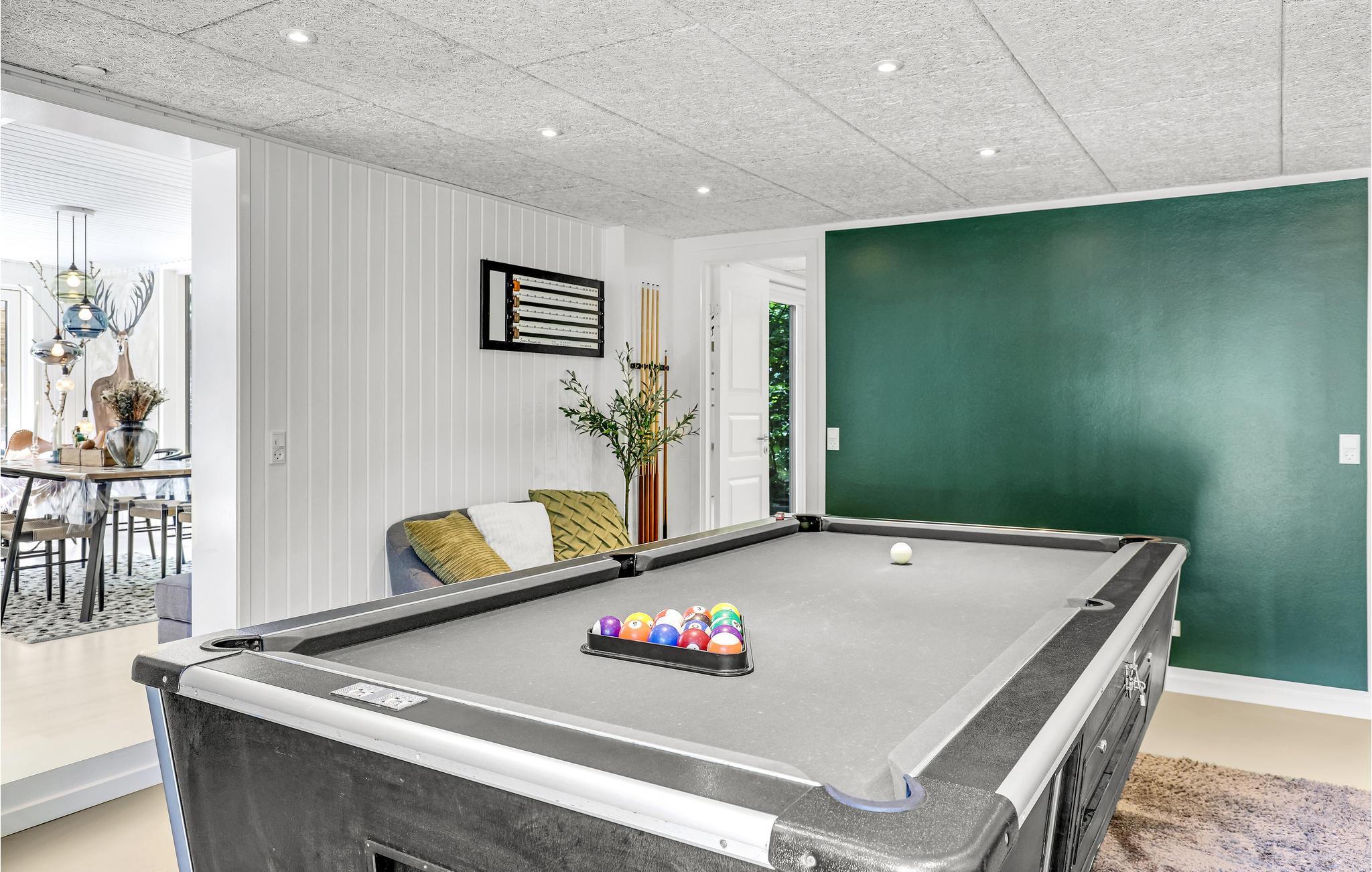 Husets naturlige samlingspunkt er den store stue med spiseplads, TV, brændeovn og varmepumpe (som også kan køle). I det åbne køkken med bl.a. vinkøleskab er det en fornøjelse at lave mad. Huset har fire gode soveværelser, der er indrettet med klædeskabe og bøjlestang. Badeværelset har behagelig gulvvarme. Derudover består huset af et arbejdsværelse og et gæstetoilet med gulvvarme samt vaskemaskine. Et af mange højdepunkter ved huset er aktivitetsrummet, hvor I kan tage et spil billard eller airhockey, så I kommer bestemt ikke til at kede jer. I udhuset findes en sauna, tørretumbler, barnestol, barneseng inkl. dyne, pude og betræk til juniordyne, parasoller, picnickurve, køletaske og tæpper.