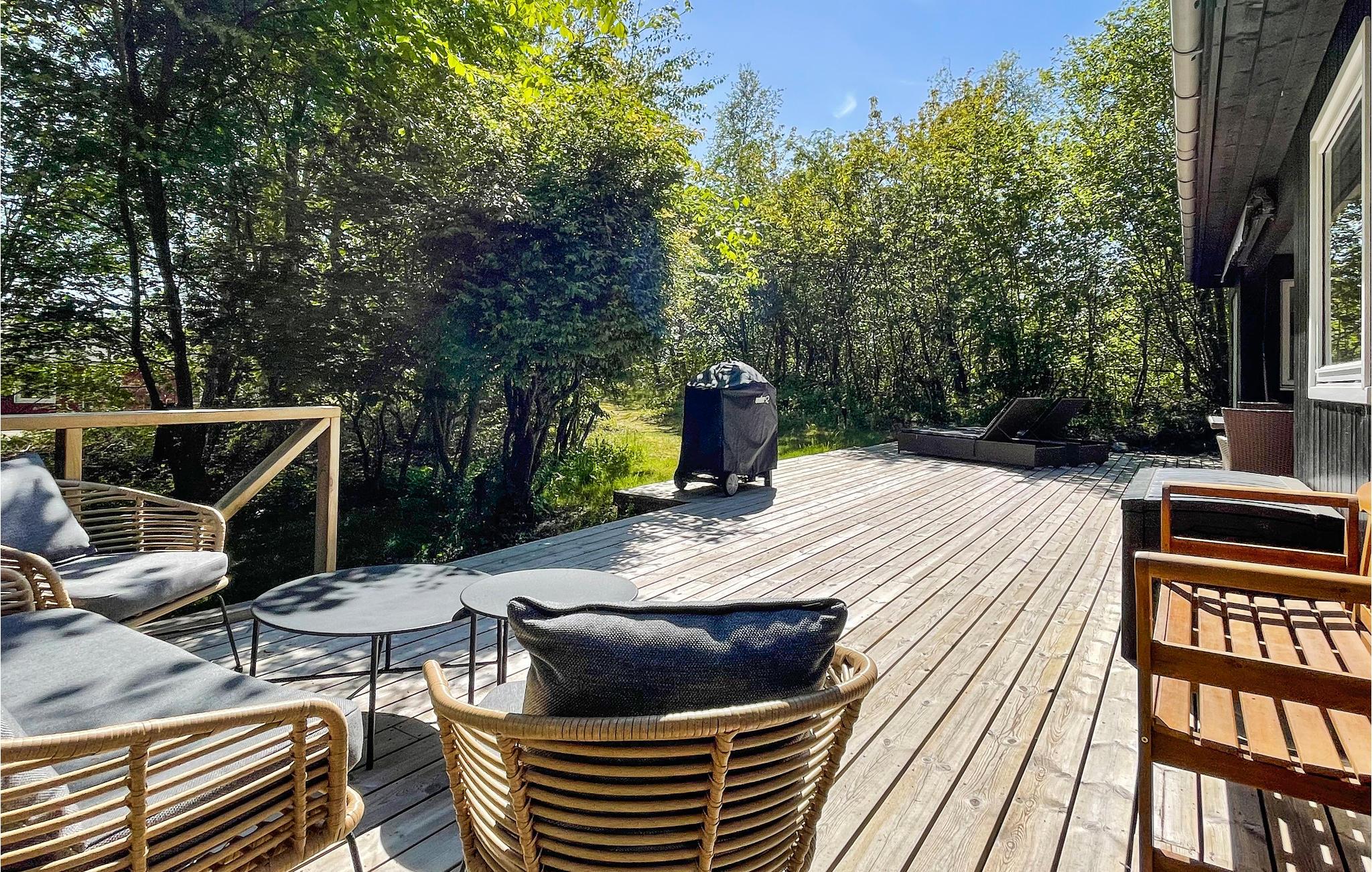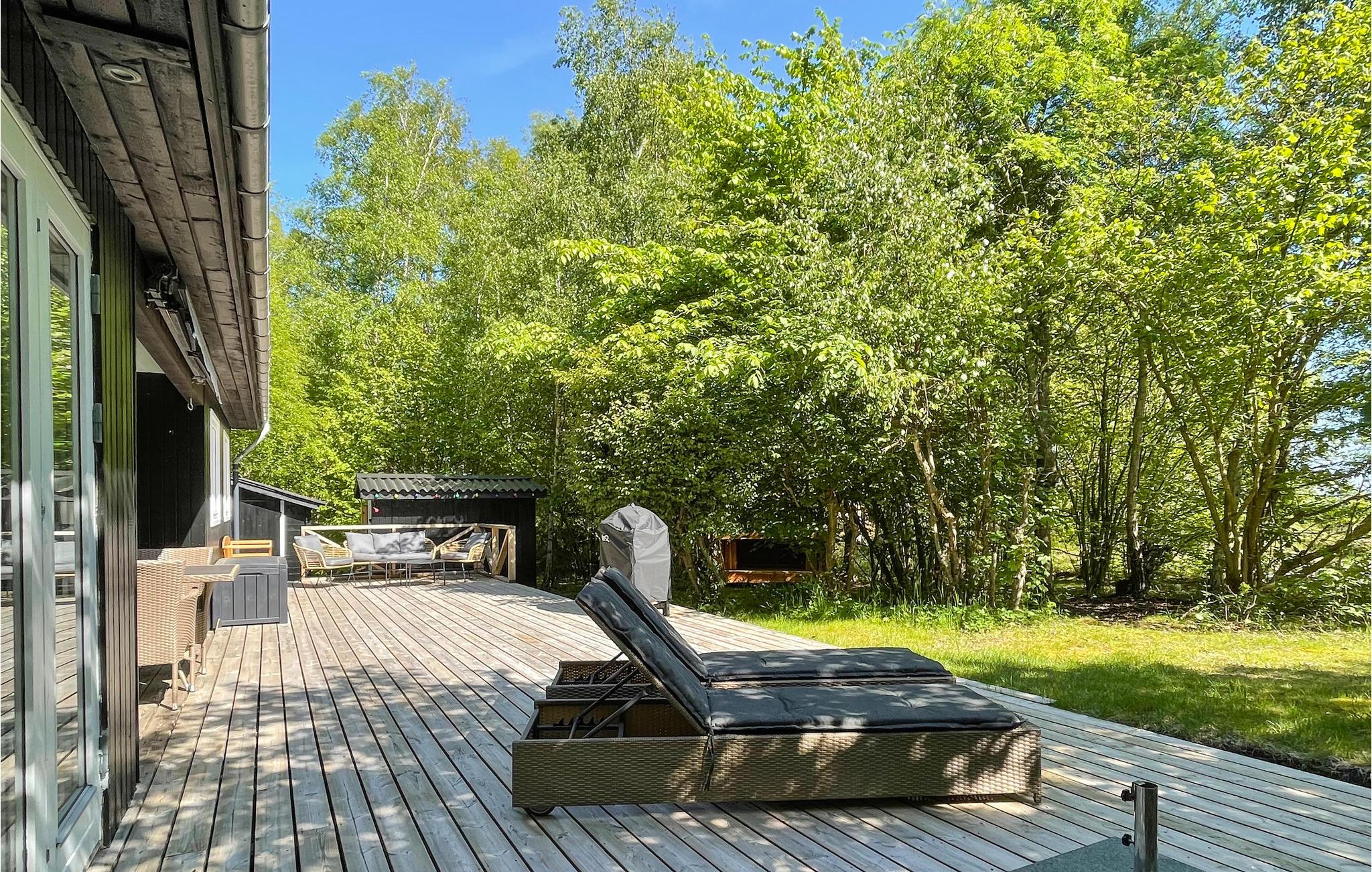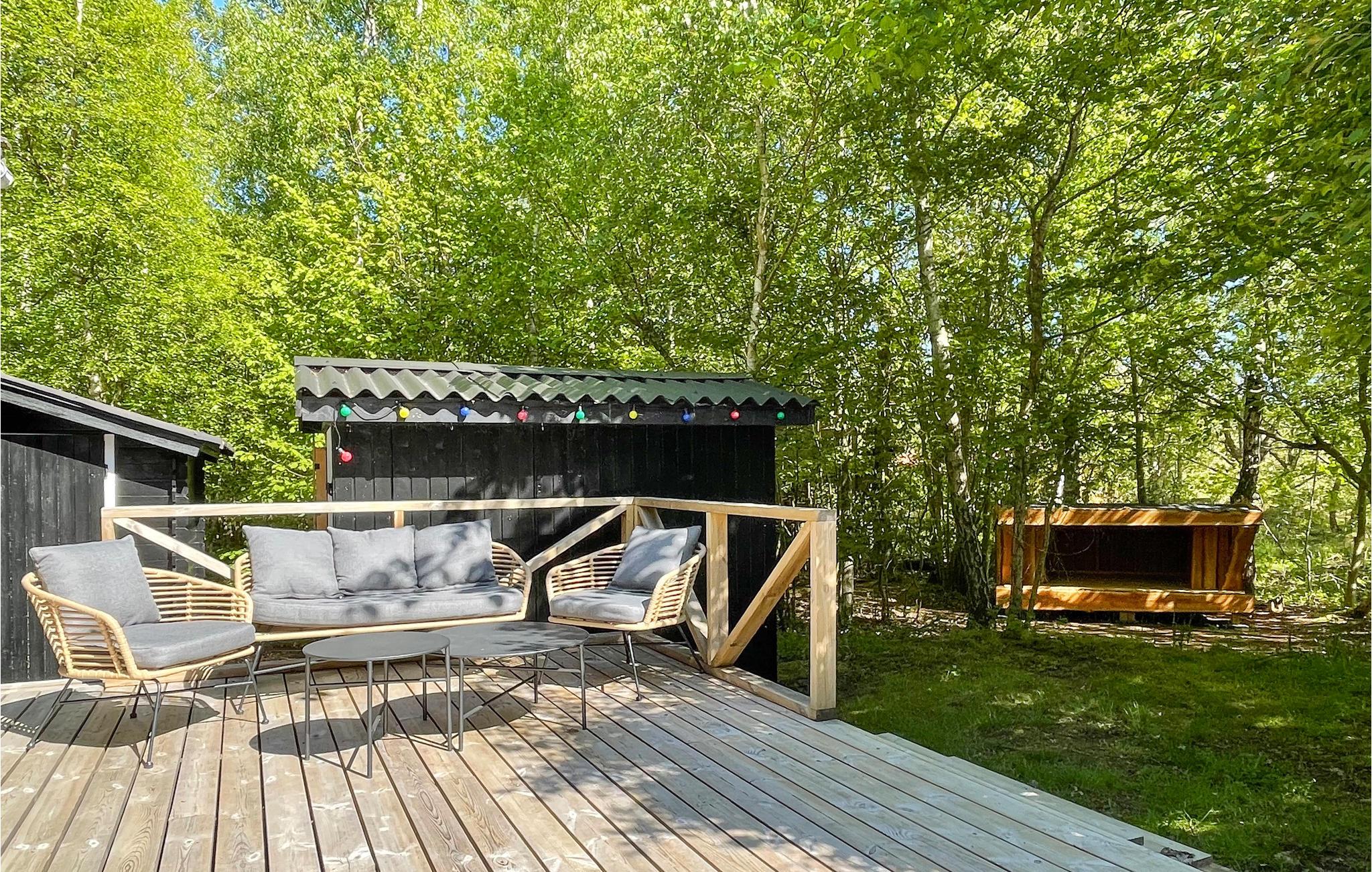 Den sydvendte terrasse ligger i læ og er delvist overdækket, så her har I et godt sted til udendørs spisning og mange solskinstimer i de komfortable liggestole. Nyd den fredelige atmosfære blandt skyggefulde træer og lad børnene legende udforske naturen og nyde de rustikke legemuligheder. Gå barfodet til stranden og tænd op i grillen, inden I dækker op til en stemningsfuld aften under åben himmel.