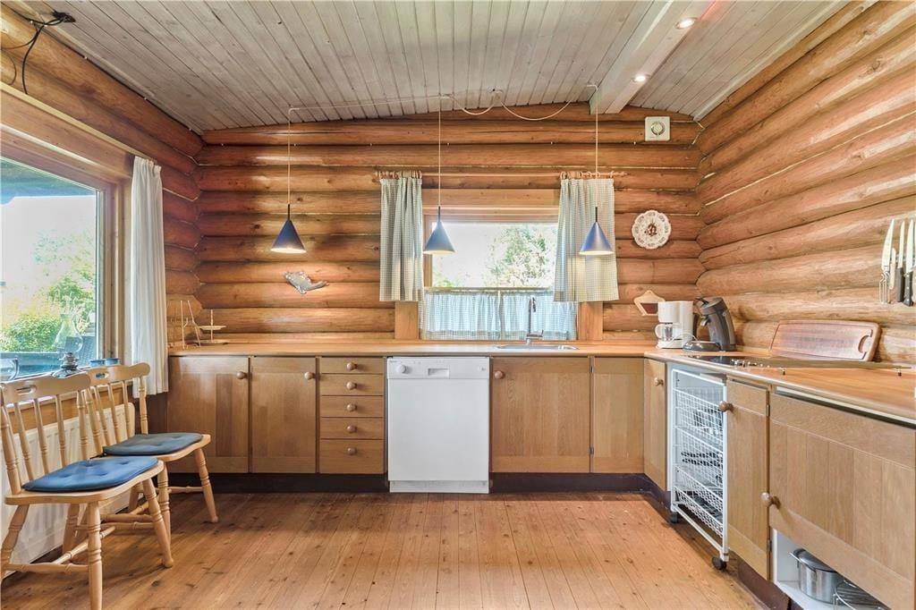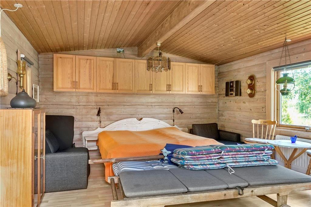 Feriehuset indeholder kombineret køkken og opholdsstue. Køkken med kogeplader, lille kombiovn med grill, Opvaskemaskine og amerikaner køleskab med fryser. Opholdsstue med varmepumpe, brændeovn, spiseplads, sofa, lænstole, Tv med Waoo Flex TV pakke.. Badeværelse med bruseniche og vaskemaskine. Der er to soveværelser, et med dobbeltseng og varmepumpe inde i huset og et i et 24 m2 anneks med en dobbeltseng. Desuden er der mulighed for soveplads på en dobbelt sovesofa i stuen.