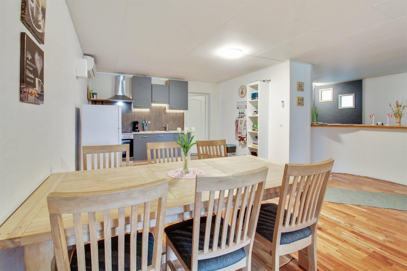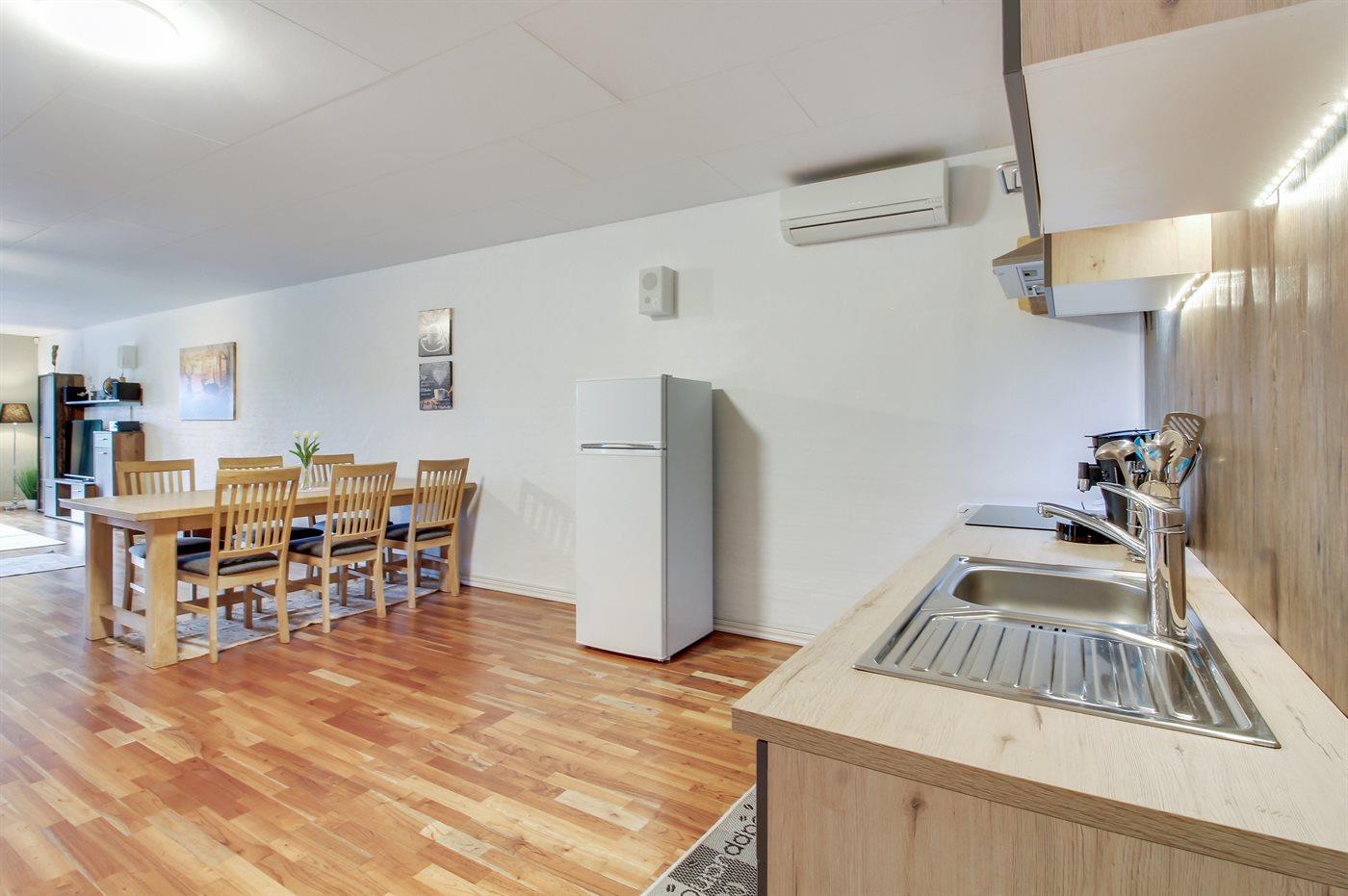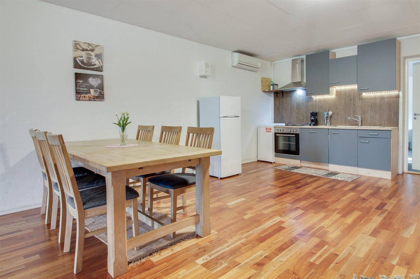 Køkkenet er udstyret med 1 køleskab. Der er 4 keramiske kogeplader, varmluftovn, mikrobølgeovn samt opvaskemaskine.