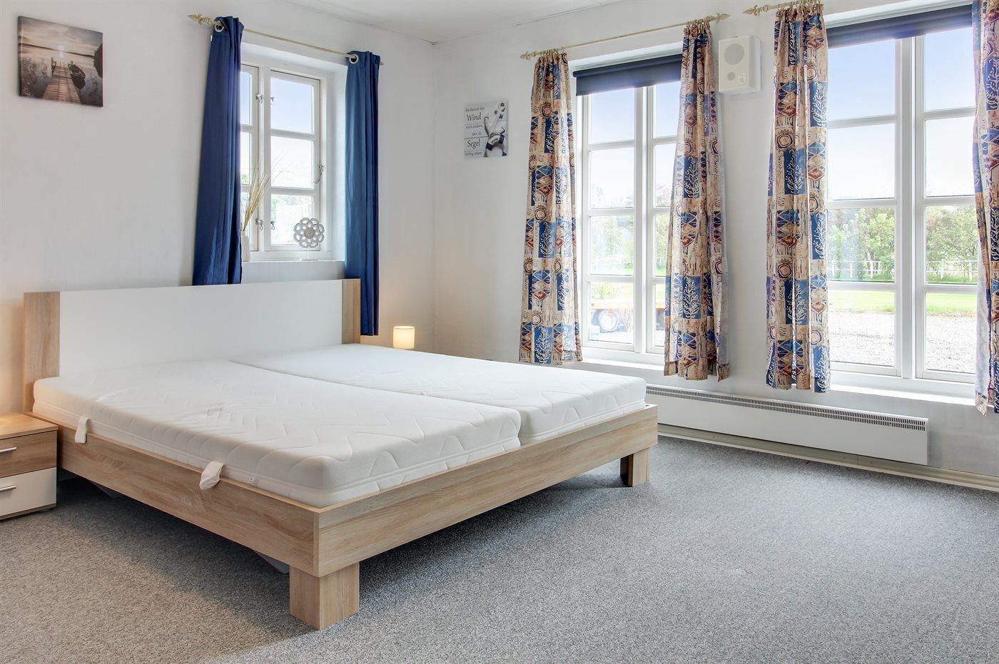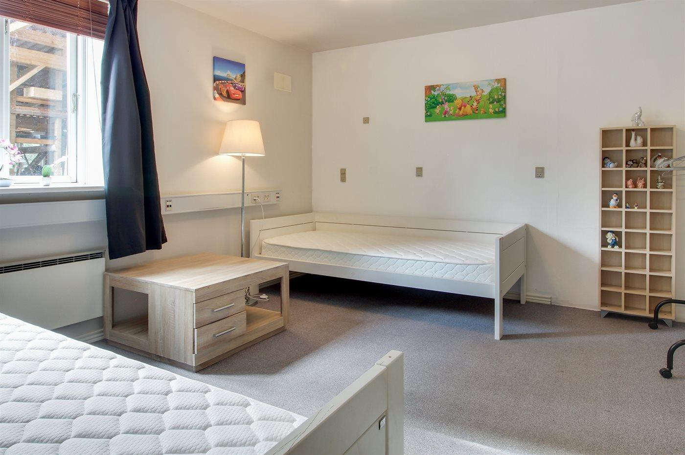 Der er i alt 2 soveværelser. Sovepladserne fordeler sig på: 2 sovepladser i dobbeltseng. 2 sovepladser i enkeltsenge. Derudover er der 1 stk. barneseng.