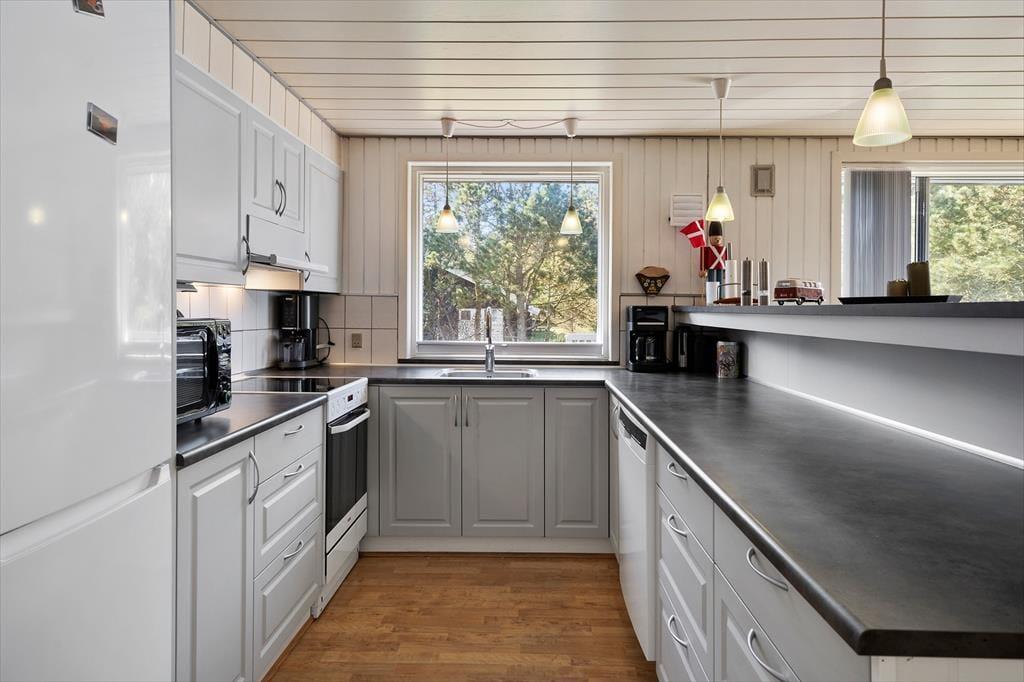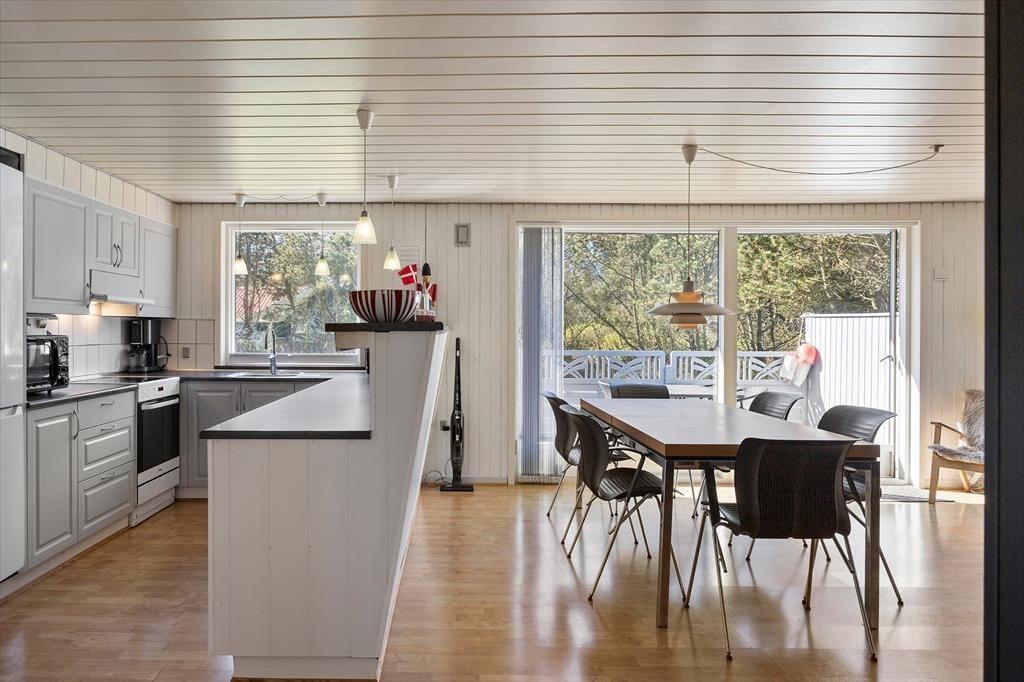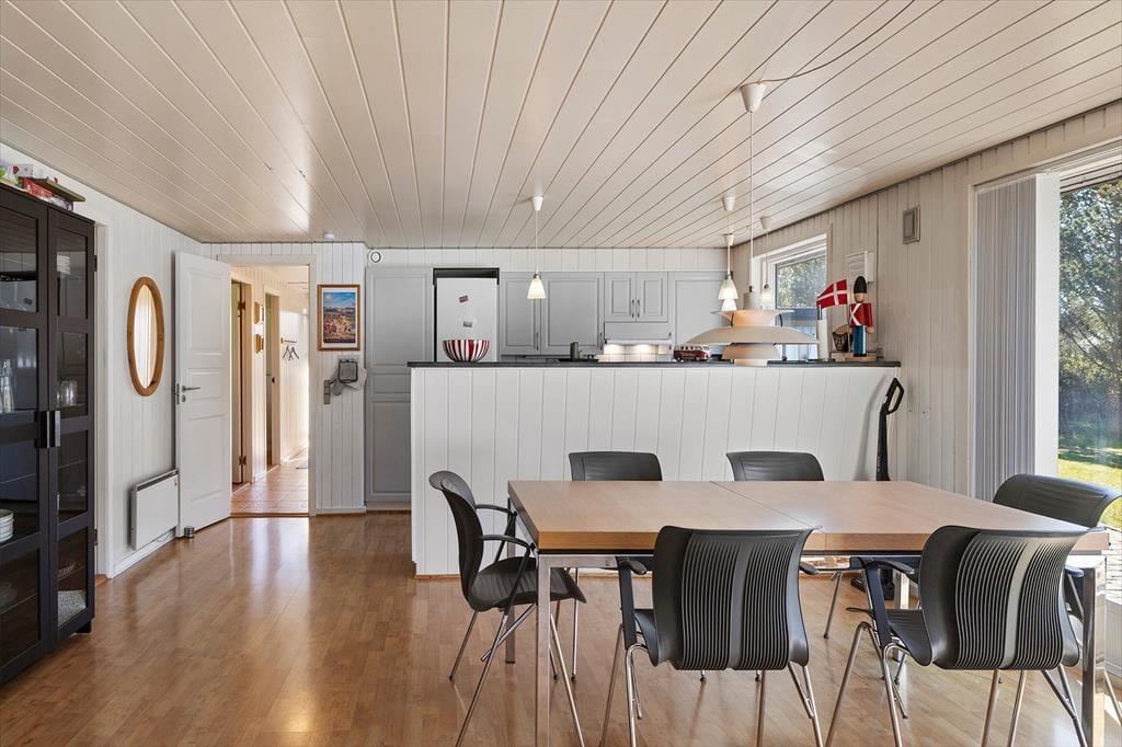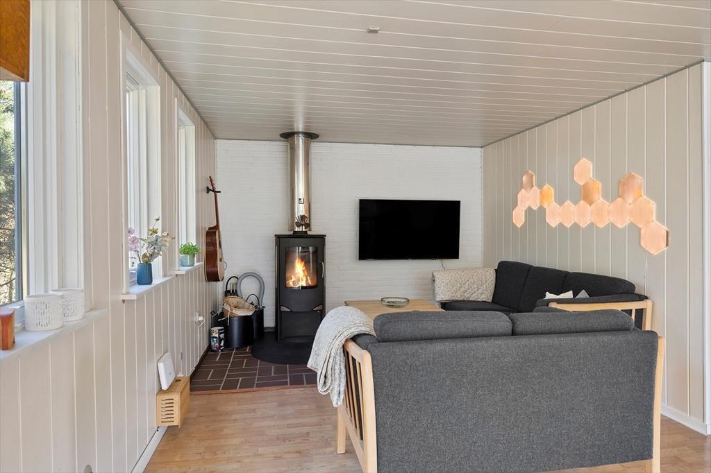 Det første, du mærker, når du træder ind i sommerhuset på Isfuglevej 19, er følelsen af varme og hjemlig hygge. Den lyse opholdsstue er indrettet med komfortable møbler og har et skønt lysindfald fra de store vinduer. Midt i stuen står brændeovnen klar til at sprede varme og knitrende stemning, mens du nyder en god bog, et brætspil med familien eller bare en stille stund med udsigt til haven. Her er plads til at trække vejret og lade feriefreden sænke sig. Når du trænger til ekstra forkælelse, venter sommerhusets sauna – et oplagt sted at finde ro efter en lang gåtur ved havet eller en frisk dukkert i bølgerne.