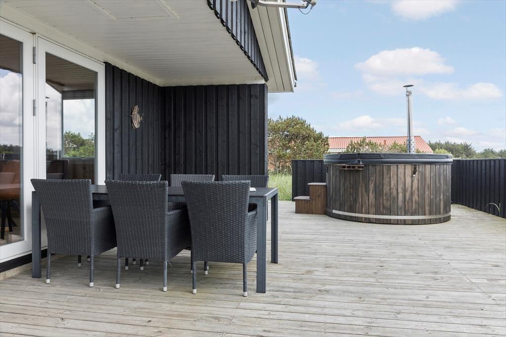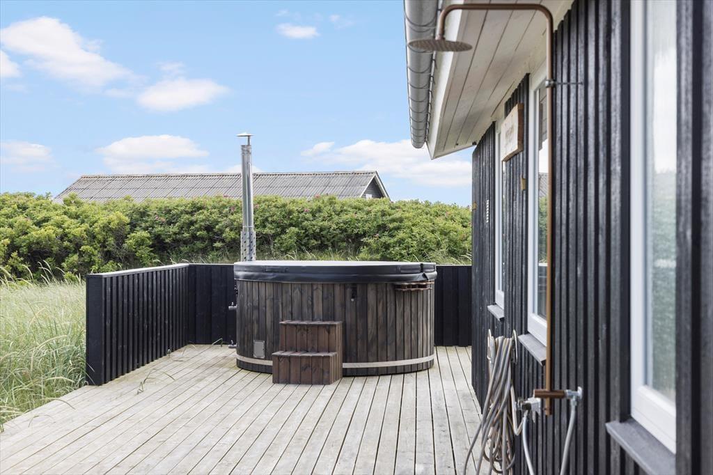 Sommerhusets uderum er en sand oase for både store og små. På den store terrasse kan du nyde solen i loungemøblerne, grille lækre måltider og lade børnene lege frit på græsplænen. Det absolutte højdepunkt er dog det skønne vildmarksbad, hvor du kan synke ned i det varme vand og lade dig omfavne af den friske havluft – måske med et glas vin i hånden, mens solen går ned over klitterne. Når sommerdagene bliver varme, kan du tage en forfriskende udendørs bruser, der fuldender oplevelsen af ferie tæt på naturen.