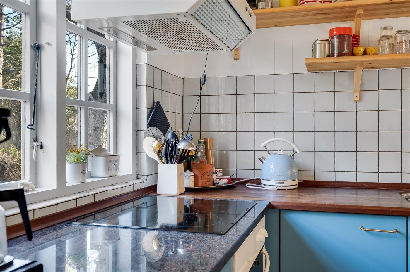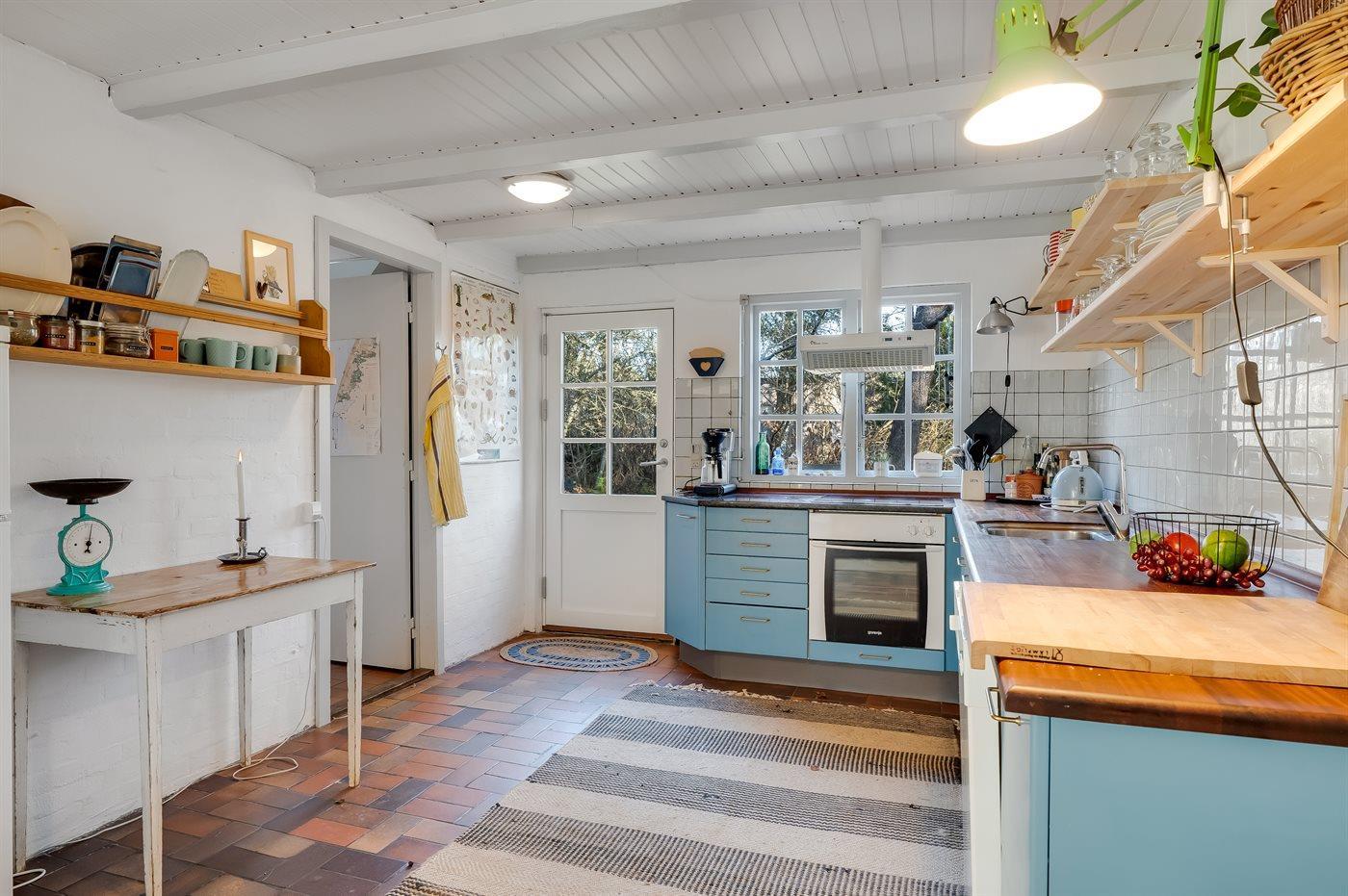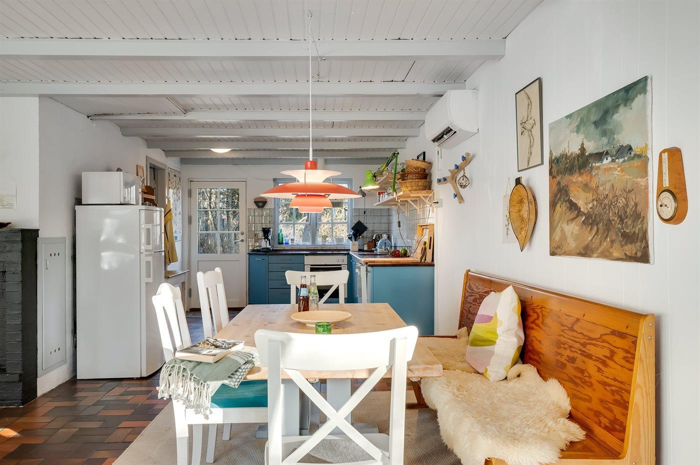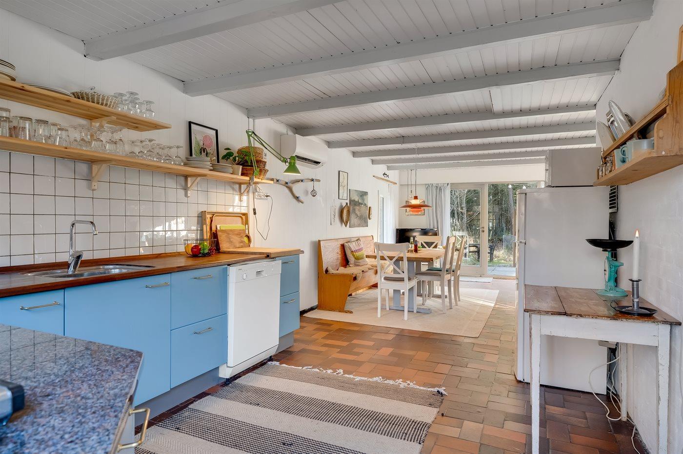 Køkkenet er udstyret med 1 køleskab. Der er 4 keramiske kogeplader, varmluftovn, mikrobølgeovn samt opvaskemaskine.