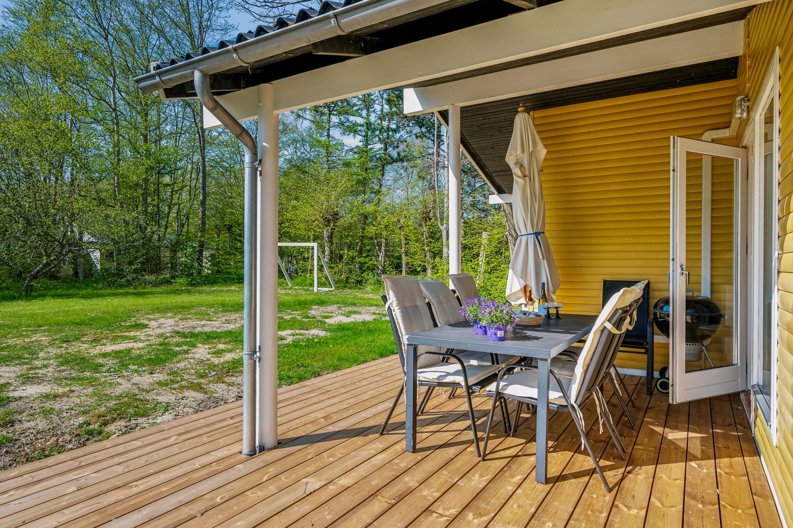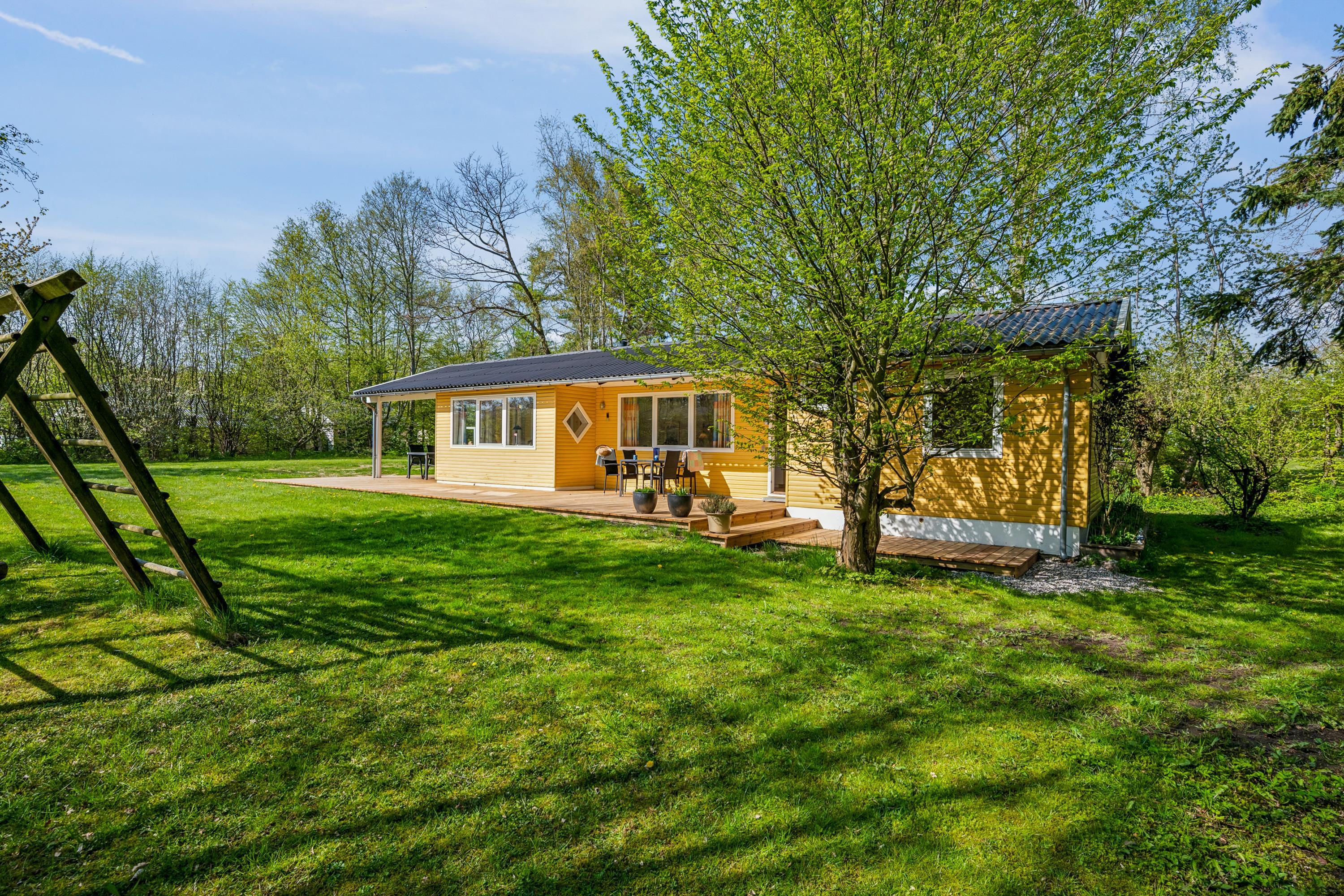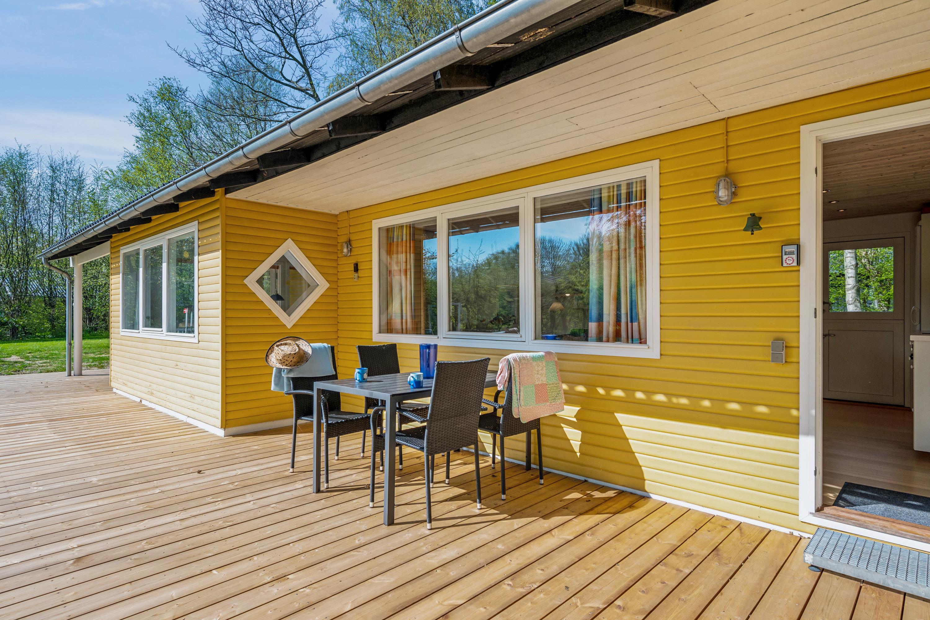 Hyggeligt og velholdt feriehus tæt på Ebeltoft med brændeovn, terrasse og børnevenlig strand.
