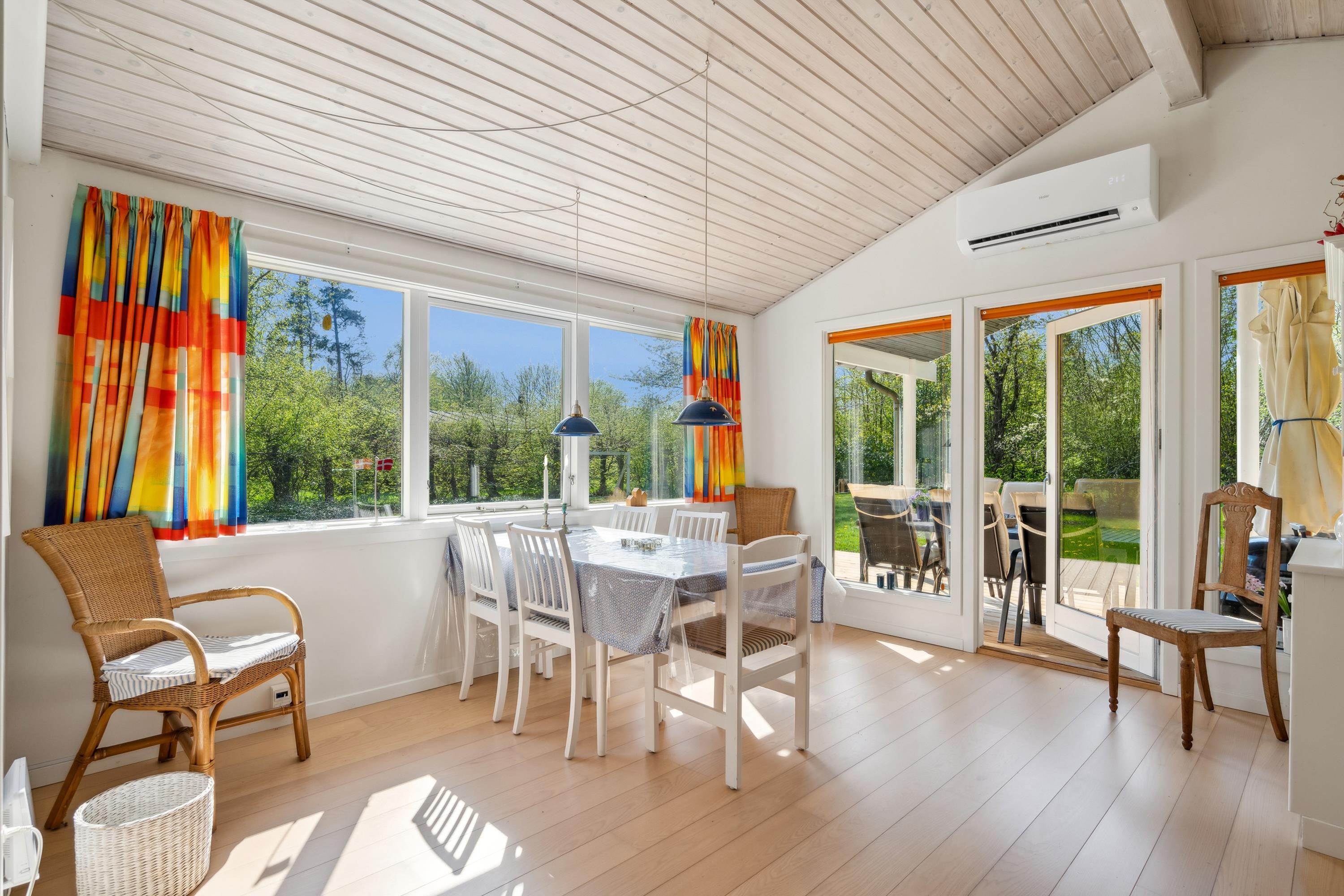 Ikke langt fra Ebeltoft og tæt på en rigtig god badestrand finder man dette hyggelige og meget velholdte feriehus. Her bliver man budt indenfor til en hyggelig og velmøbleret stue med brændeovn og varmepumpe og hvorfra der er udgang til en god overdækket terrasse med havemøbler. Dejlig køkkenafdeling med b.la. opvaskemaskine og udgang til terrasse. Husets sovepladser finder man i tre gode værelser, heraf et værelse med dobbeltseng, et værelse med køjeseng samt et værelse med en køjeseng og en enkeltseng. Stort og rummeligt badeværelse med bruseniche og gulvvarme. Ved huset er der både åben og overdækket terrasse med havemøbler og huset er beliggende på en dejlig grund med græsplæne, velegnet til leg og boldspil samt udendørs hygge. Til de små feriegæster er der gyngestativ.