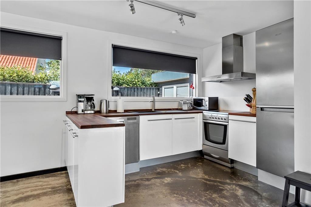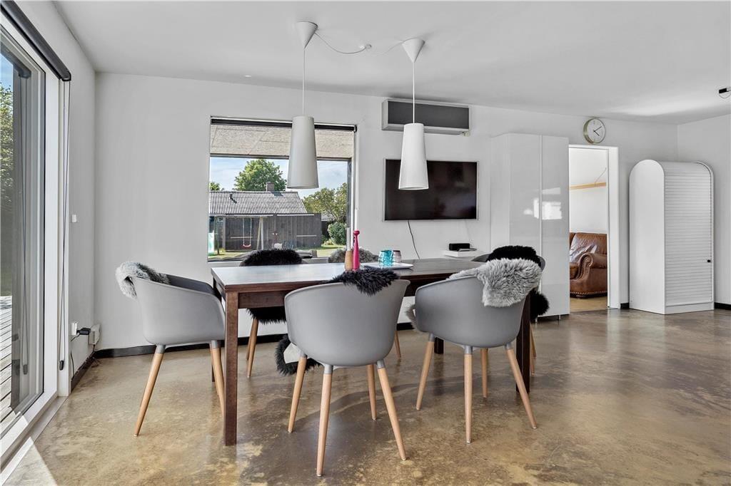 Når du træder ind i huset, mødes du af et lyst og indbydende rum hvor køkken, spiseplads og stue flyder naturligt sammen. Her kan du samle familien til måltider, samtaler og gode grin mens lyset strømmer ind gennem de store vinduer. Den moderne indretning gør det let at slappe af, og du finder hurtigt din egen favoritplads, måske ved spisebordet med en varm kop kaffe eller i sofaen hvor du kan læne dig tilbage og nyde roen. Brændeovnen spreder varme på kølige dage og skaber en behagelig stemning der indbyder til lange aftener med nærvær og afslapning. Indretningen er både funktionel og komfortabel, og du mærker straks hvordan huset giver dig en følelse af at være væk hjemmefra, men stadig med alle de små bekvemmeligheder der gør opholdet behageligt fra første øjeblik.