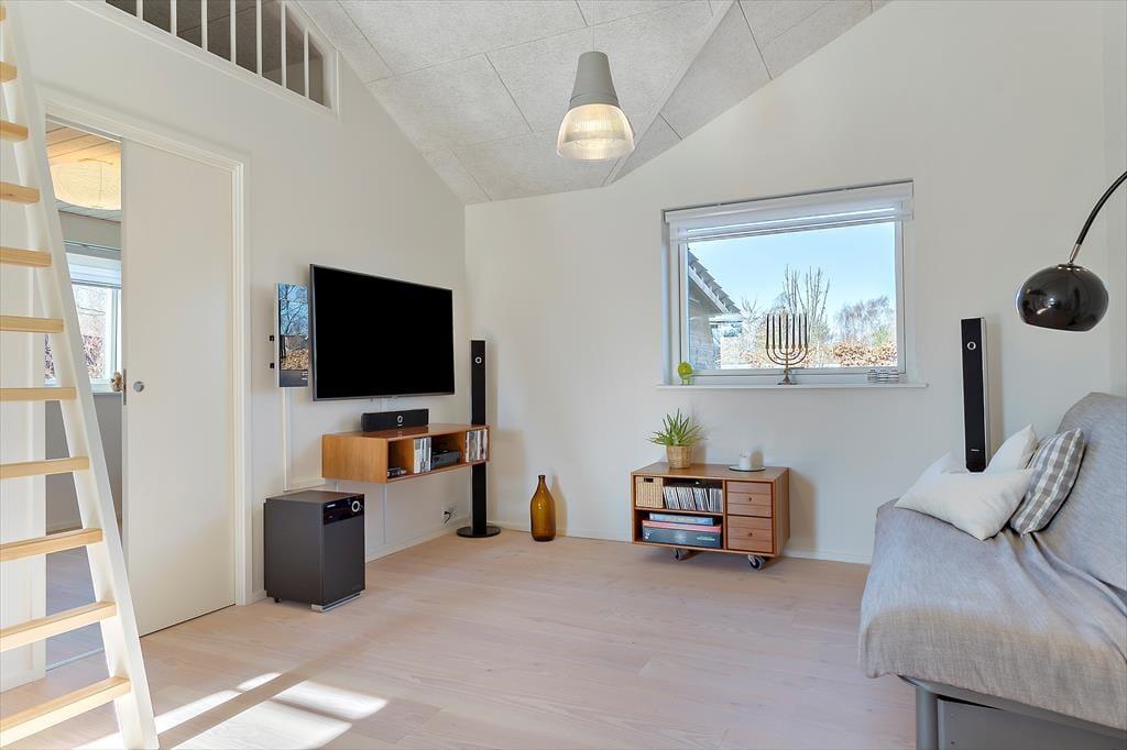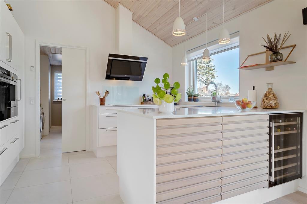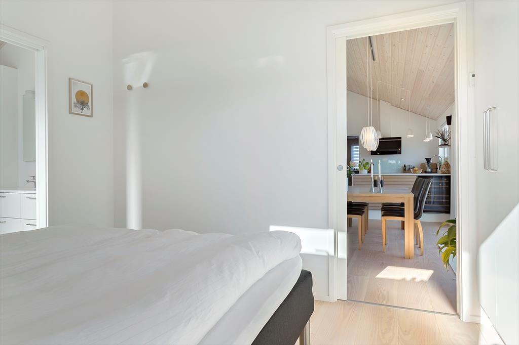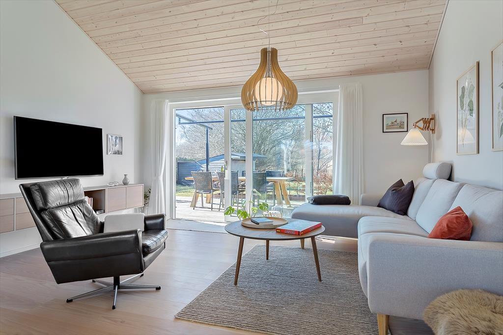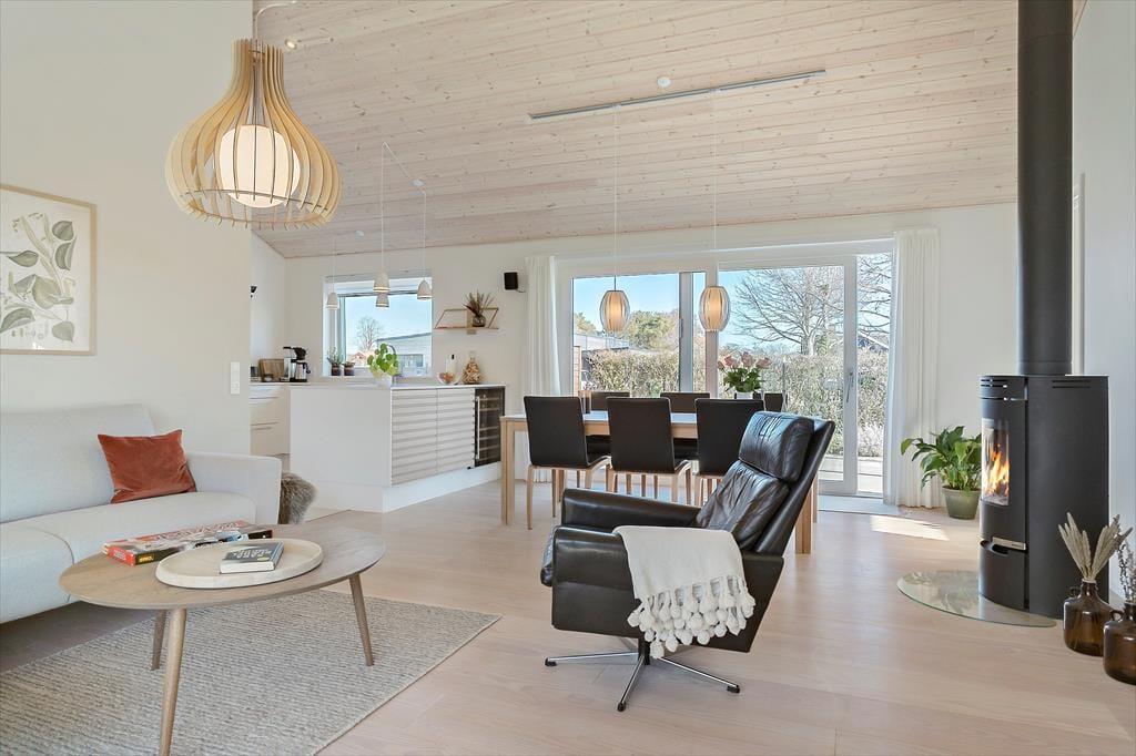 Når du træder ind i huset, mærker du straks hvordan ferieroen breder sig. Det store opholdsrum samler stue, køkken og spiseplads, så alle kan være sammen uanset om du tilbereder et måltid, spiller et spil eller blot nyder hinandens selskab. De mange vinduer lader lyset strømme ind og skaber en behagelig forbindelse mellem inde og ude, som giver rummet en lethed der passer perfekt til ferielivet. Brændeovnen spreder varme på kølige dage og gør det let at finde en stund med ren afslapning. Indretningen er præget af kvalitet og gennemtænkte detaljer, så du hurtigt føler dig hjemme og oplever hvordan huset er skabt til rolige øjeblikke og hyggelige timer sammen