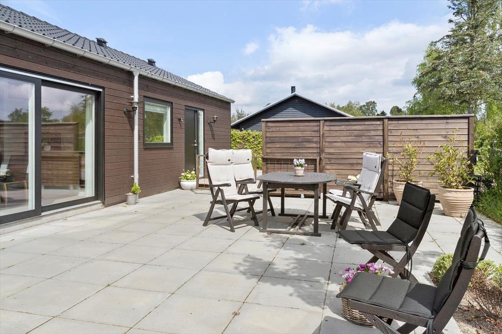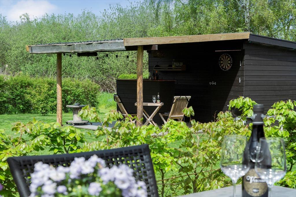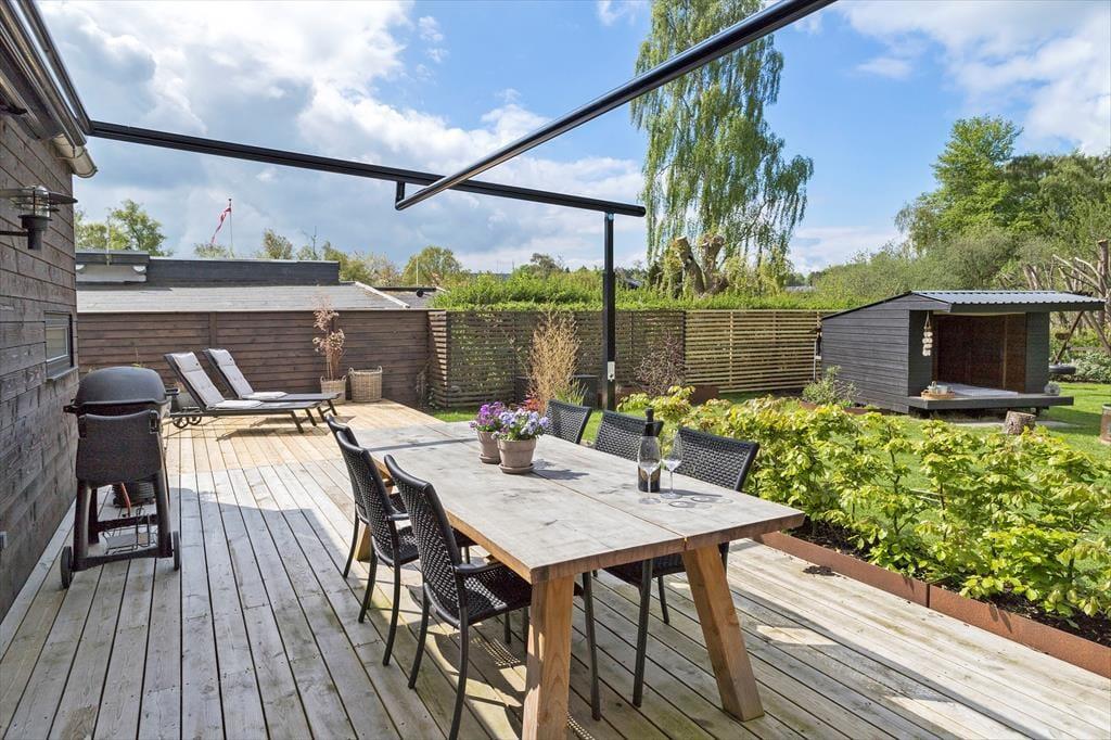 Udelivet bliver en naturlig del af ferien her. Terrasserne på begge sider af huset giver dig mulighed for at følge solen gennem hele dagen og skabe din helt egen rytme. Du kan starte morgenen med en kop kaffe og fuglenes sang og fortsætte dagen med sol, leg eller måske en god bog i havens rolige omgivelser. Terrassen kan overdækkes når du ønsker det, så du får både ly og skygge efter behov, og om aftenen bliver den et oplagt sted at samles med grillmad og gode samtaler. Efter en tur til stranden som ligger få minutters gang fra huset, kan du skylle saltvandet af under den udendørs bruser og mærke hvor forfriskende kystluften gør godt. Haven rummer både plads til børn, leg og de stille stunder hvor du bare nyder roen og duften af hav.