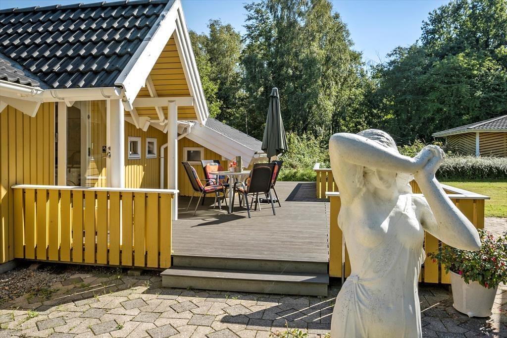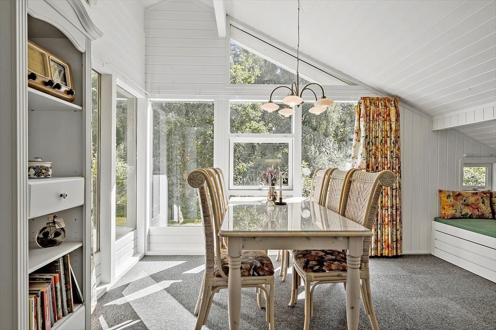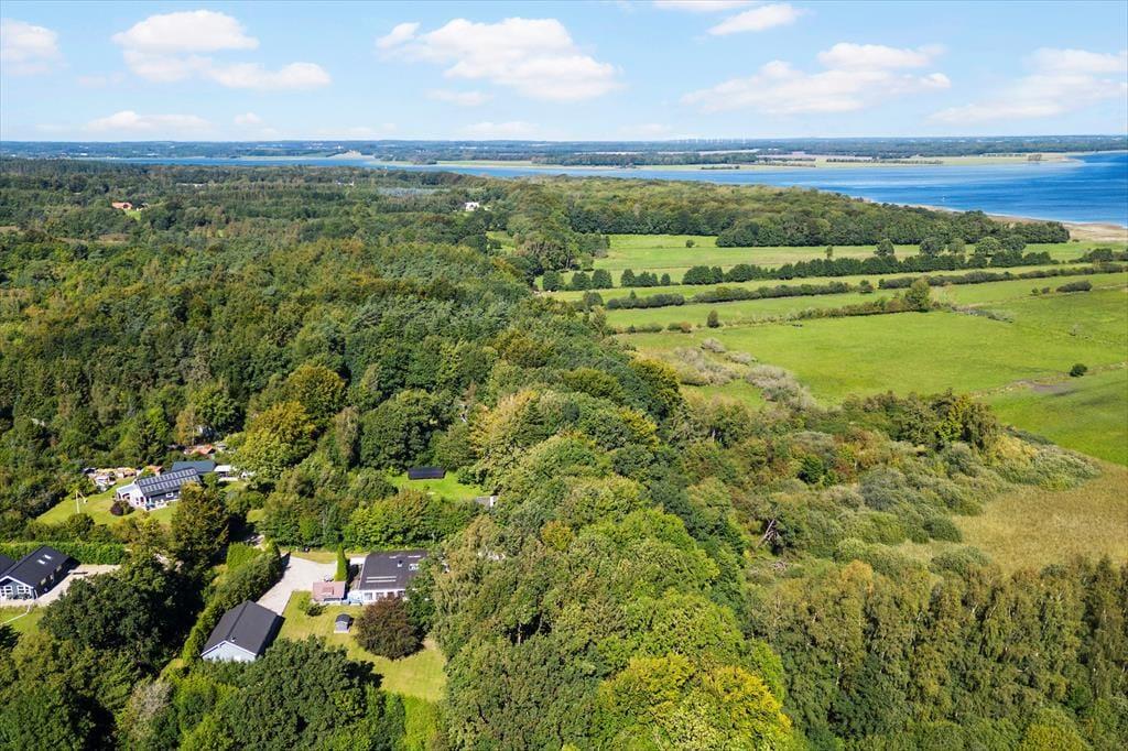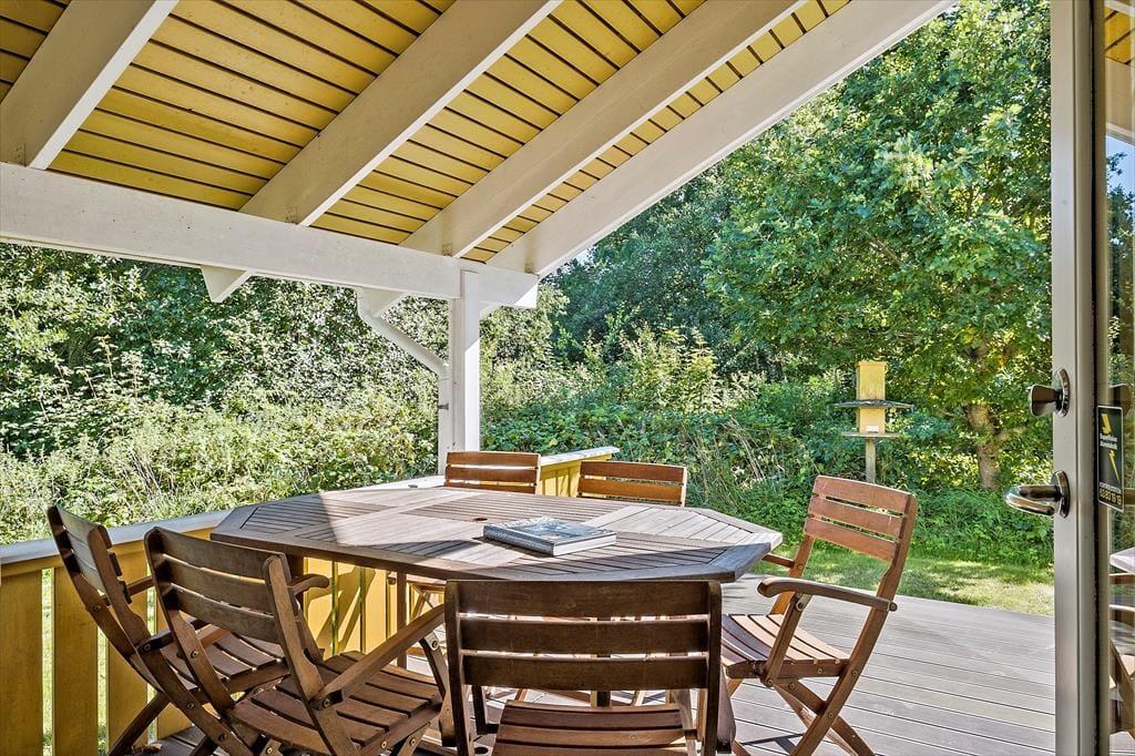 Når vejret er med jer, er det fristende at tilbringe størstedelen af ferien ude i det fri på den 1865 m2 store naturgrund. Flotte træer skærmer udearealerne godt af, og mod øst er der dog mere åbent, så I virkelig kan nyde fjordudsigten og det vidtstrakte landskab. Omkring huset er der terrasser mod både syd og vest, og her kan I vælge mellem både åbne og overdækkede arealer alt efter, om I foretrækker at sidde i sol eller skygge. Til børnene er der gynge og en god græsplæne at lege på, og bilen kan enten holde i carporten eller indkørslen.