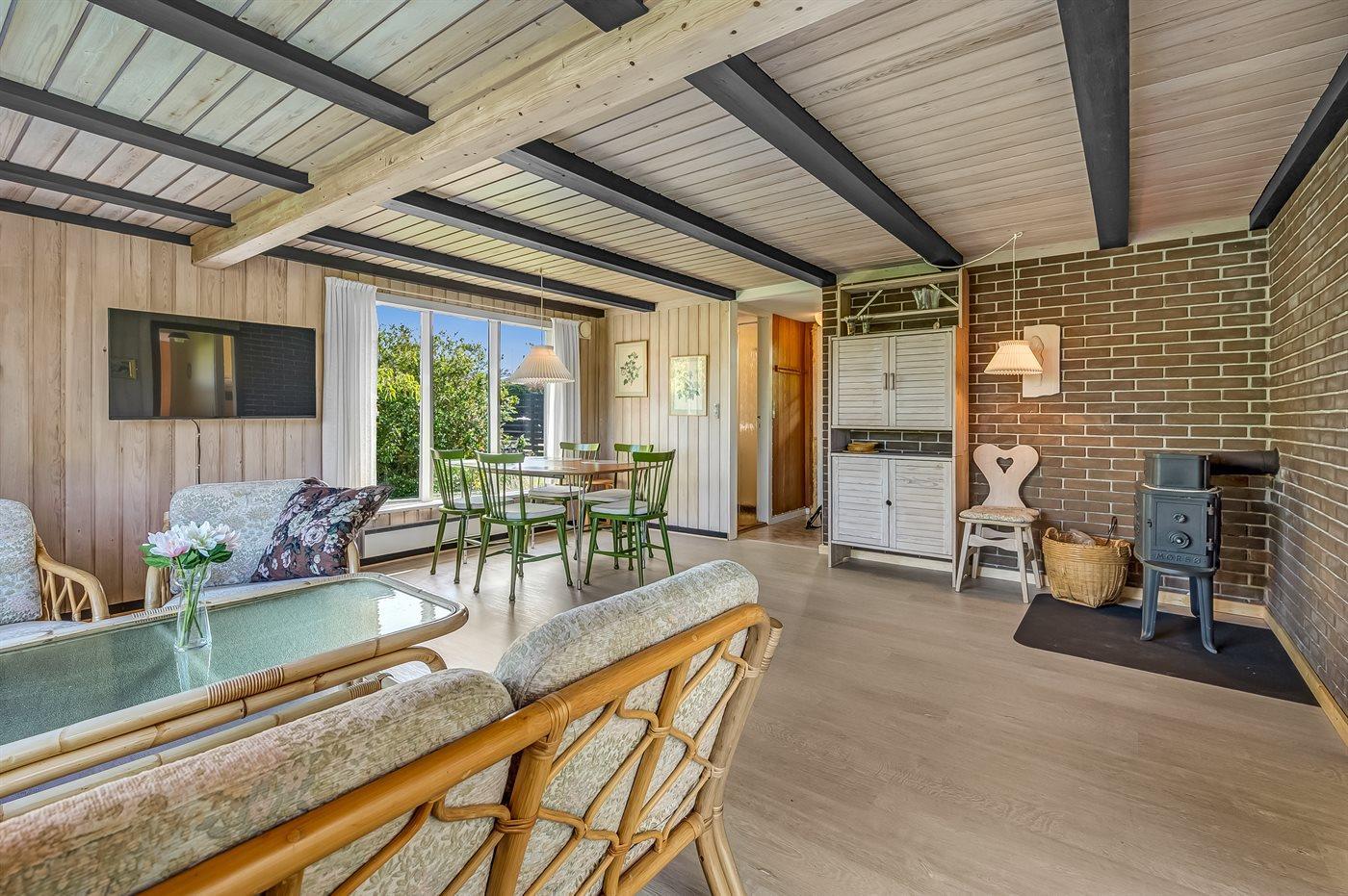 Hyggeligt sommerhus tæt på børnevenlig strand ved Ajstrup, perfekt til familieferie med delvis overdækket terrasse og brændeovn.