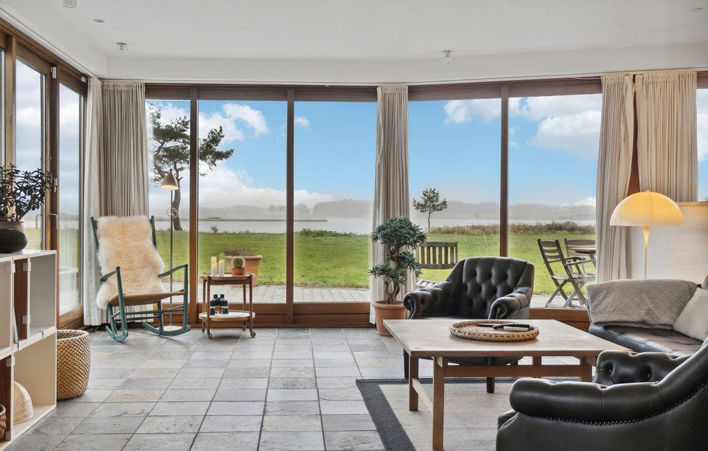 Gllæd jer til en fantastisk panoramaudsigt over Norsminde Fjord fra dette lækre feriehus.