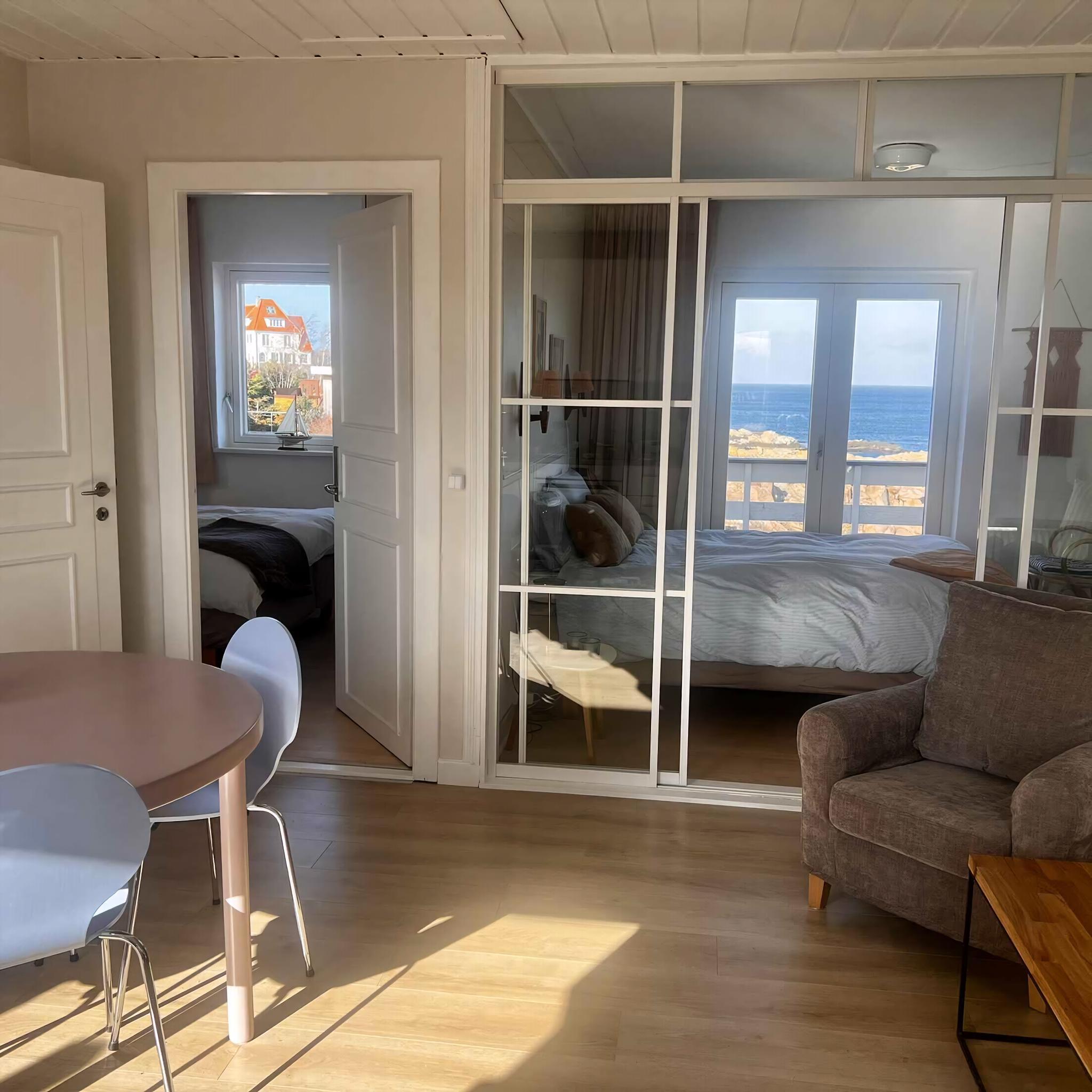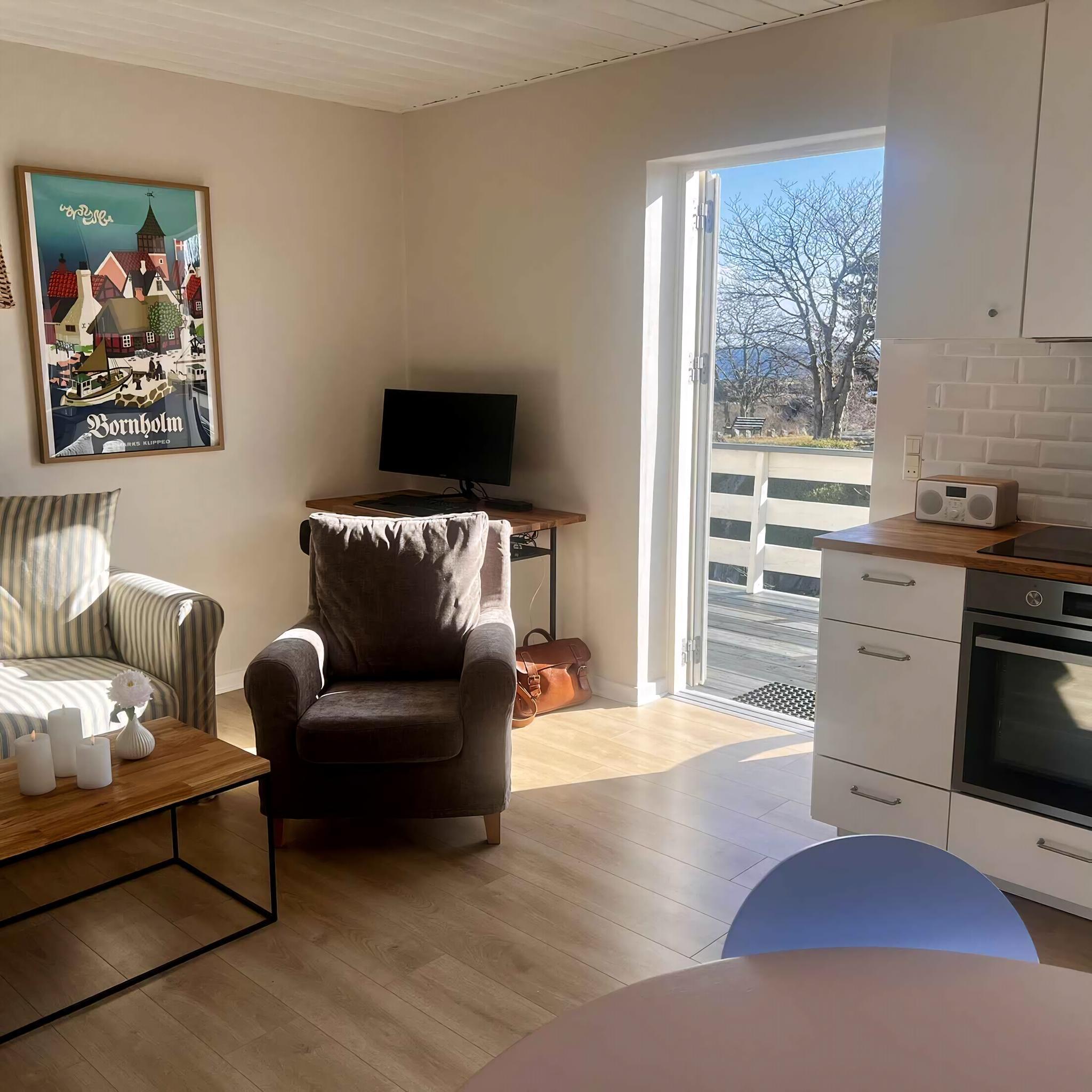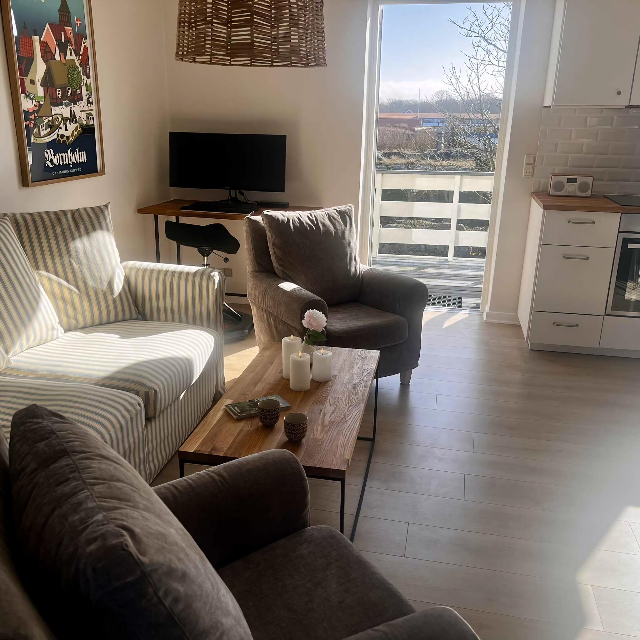 Lys og moderne ferielejlighed på Bornholm med havudsigt, to altaner og kun 50 meter fra havet i idylliske Sandvig.