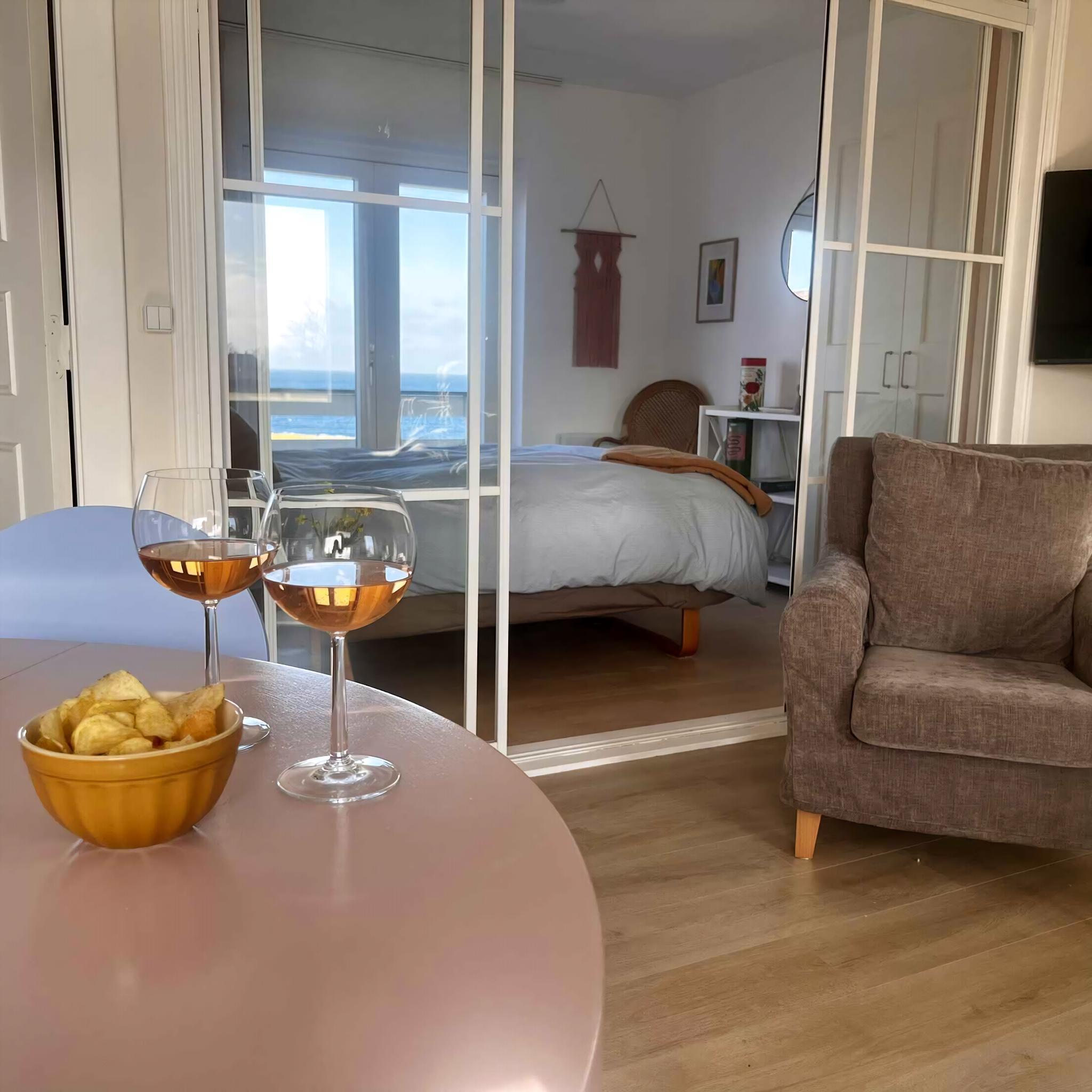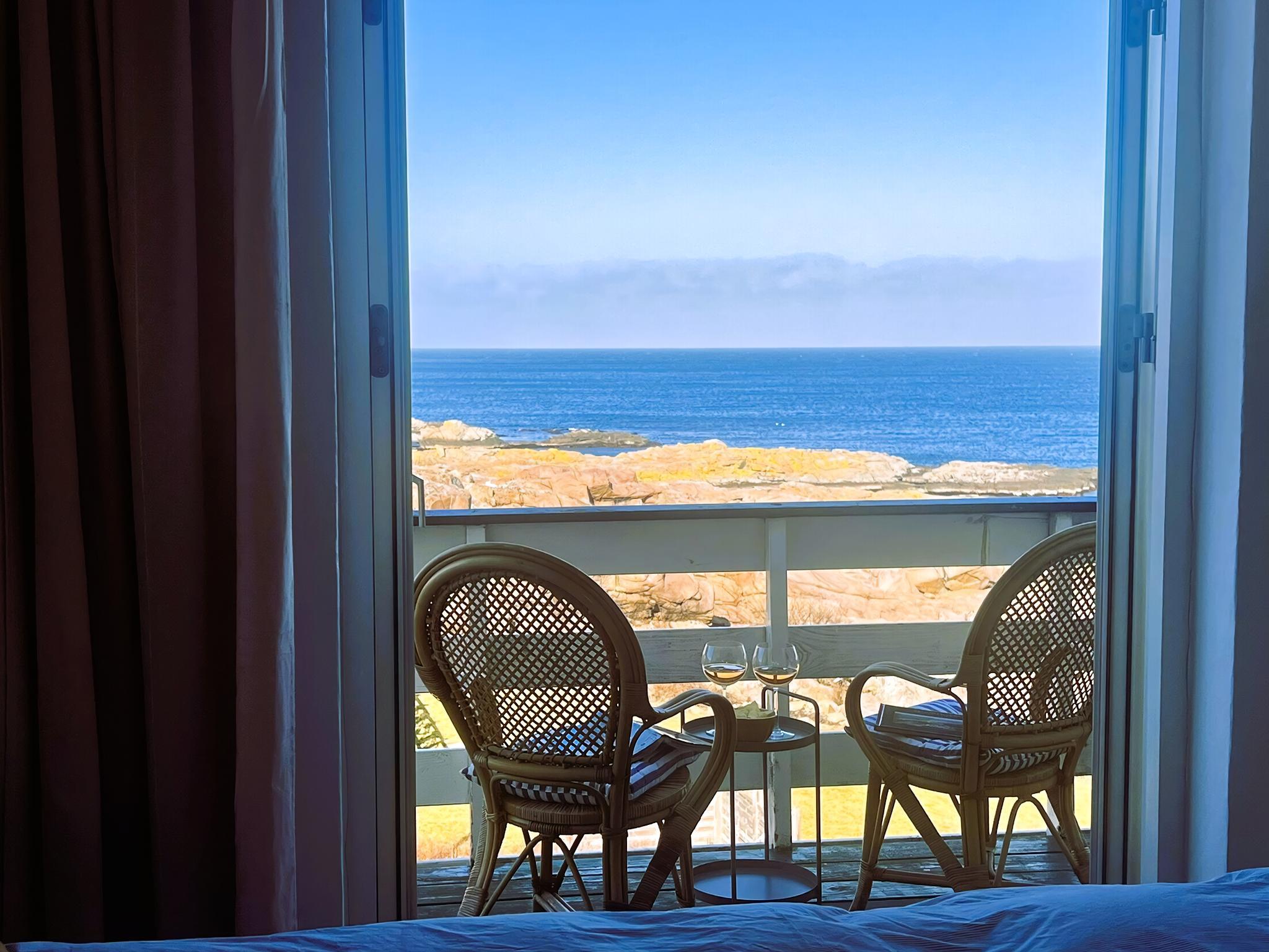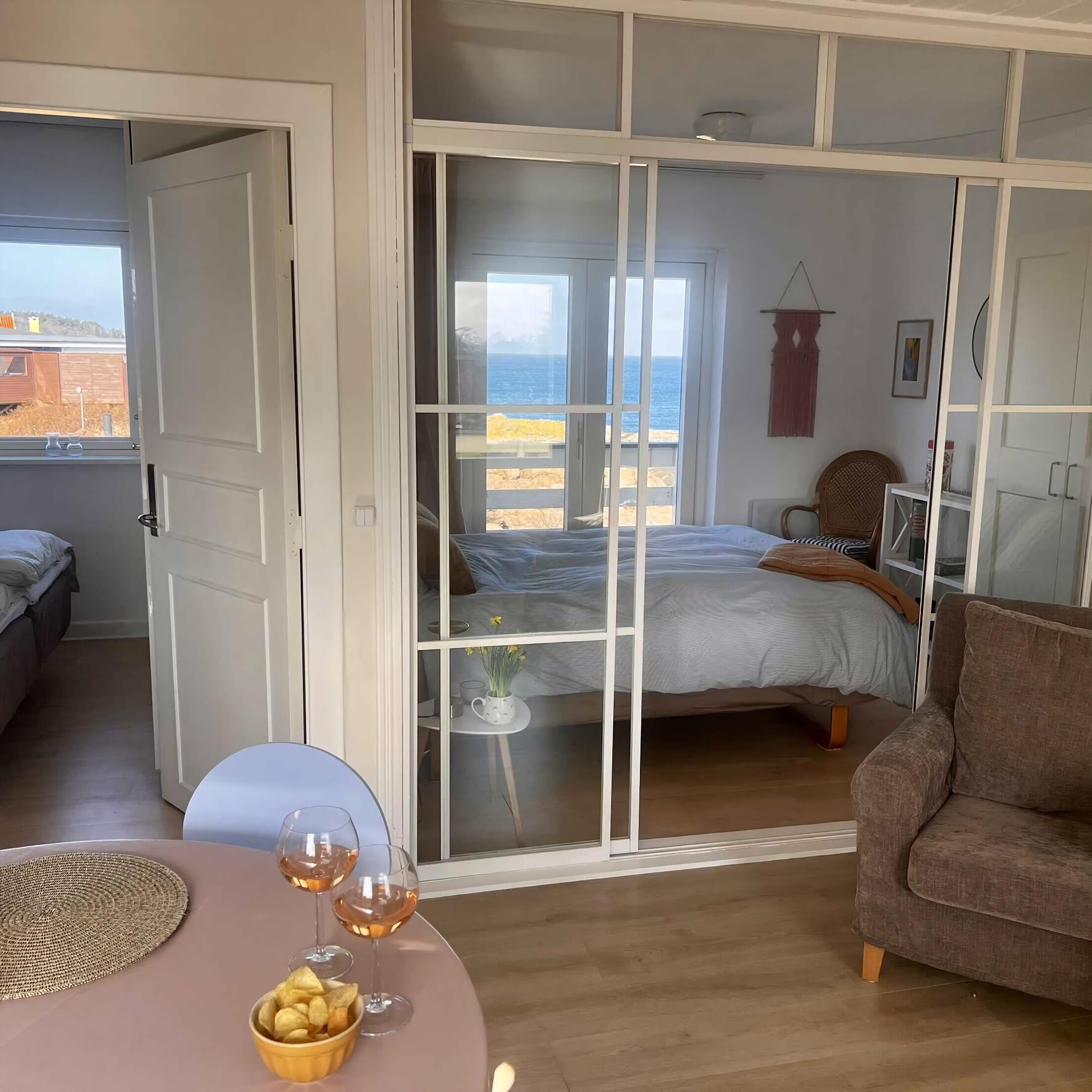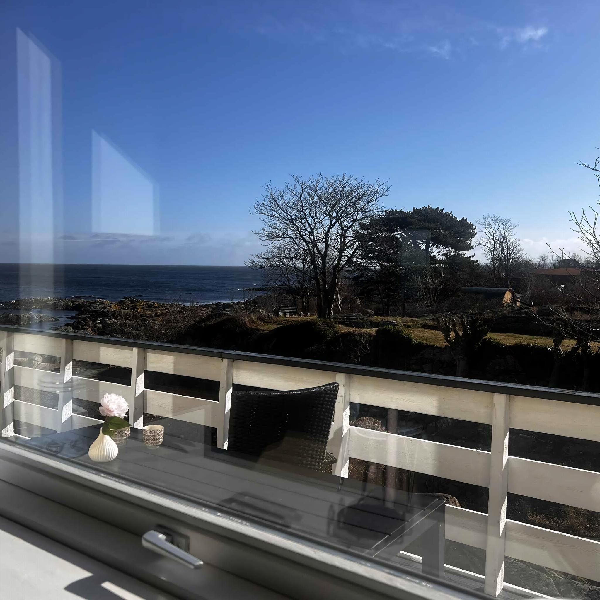 Lys og moderne ferielejlighed på Bornholm med havudsigt, to altaner og kun 50 meter fra havet i idylliske Sandvig.