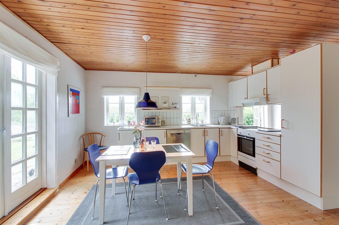 Køkkenet er udstyret med 1 køleskab. Der er 4 elkogeplader, varmluftovn, mikrobølgeovn samt opvaskemaskine.