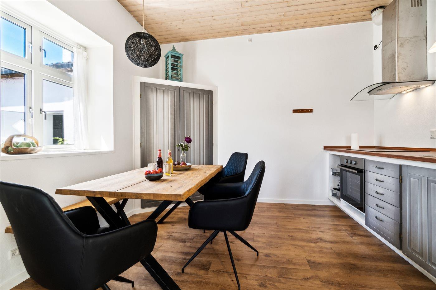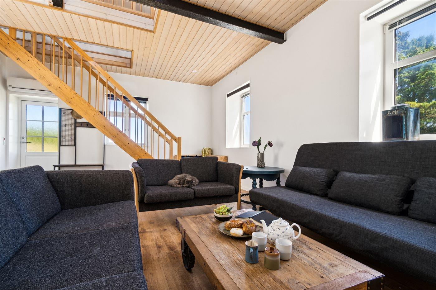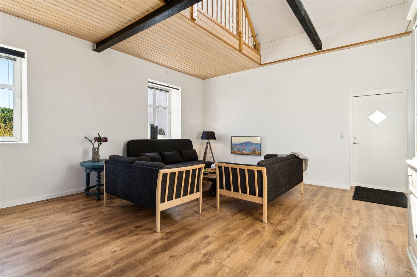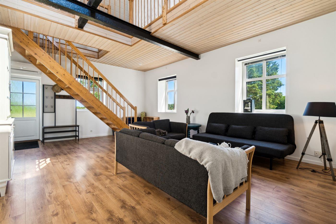 Der er højt til loftet i den moderniserede lejlighed, der er i to plan med soveværelser oppe. Nyere køkkenafdeling og større badeværelse. Interiøret er lyst med hvide vægge og lofter, og der er loft til kip. Boligen er pæn, ordentlig og hyggelig. Der er egen indgang fra terrasse med havemøbler og et udsyn ned over mark og eng. Desuden egen P-plads.