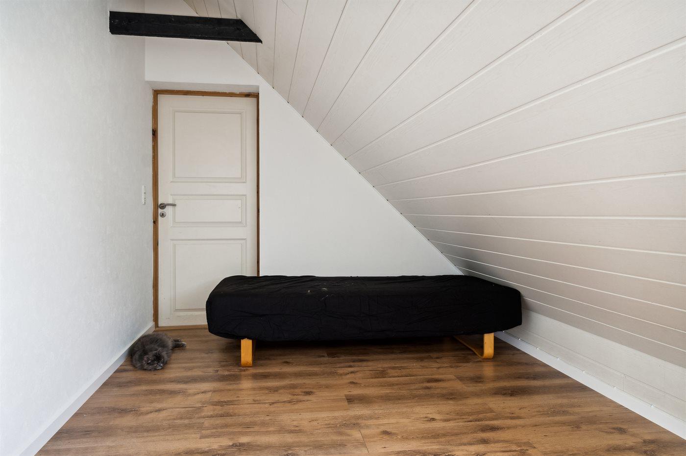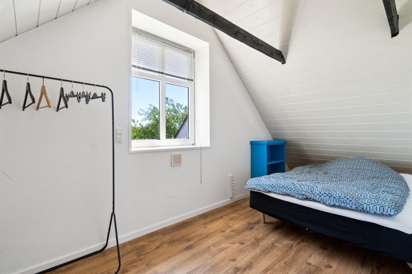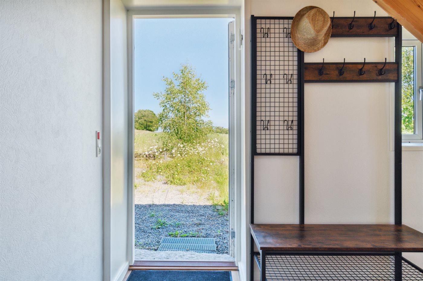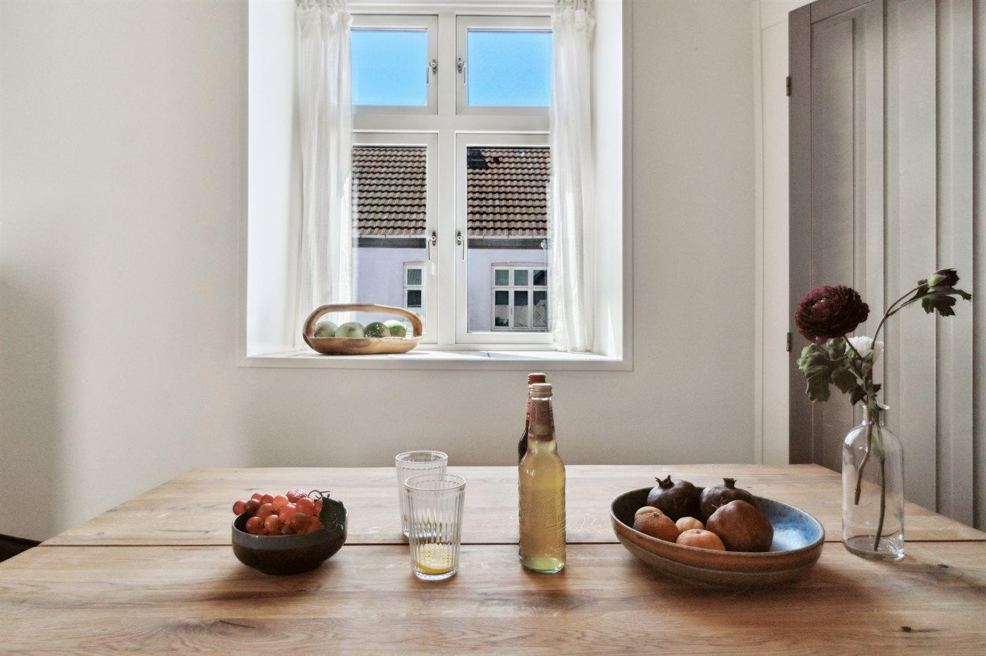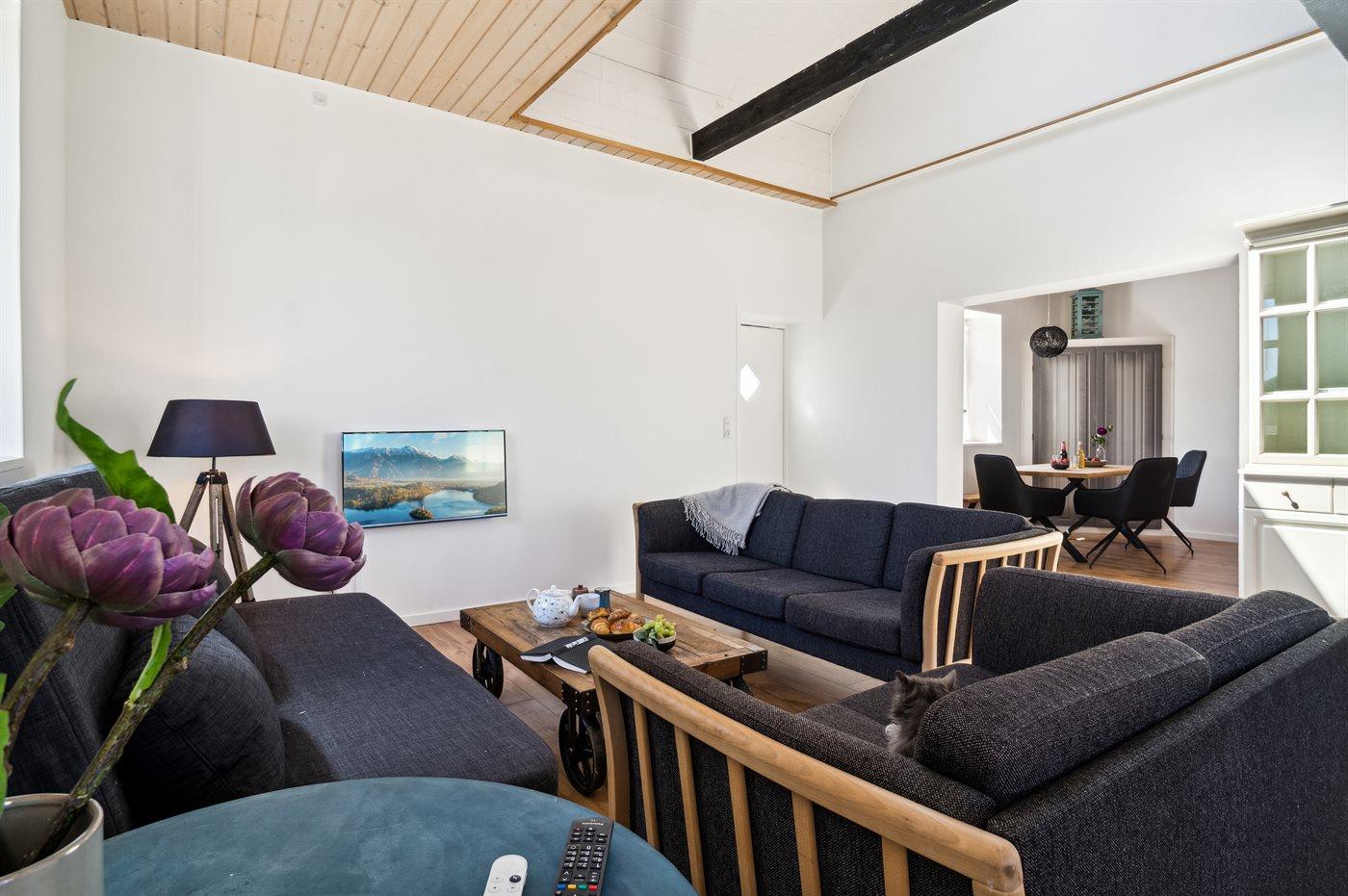 Der er højt til loftet i den moderniserede lejlighed, der er i to plan med soveværelser oppe. Nyere køkkenafdeling og større badeværelse. Interiøret er lyst med hvide vægge og lofter, og der er loft til kip. Boligen er pæn, ordentlig og hyggelig. Der er egen indgang fra terrasse med havemøbler og et udsyn ned over mark og eng. Desuden egen P-plads.