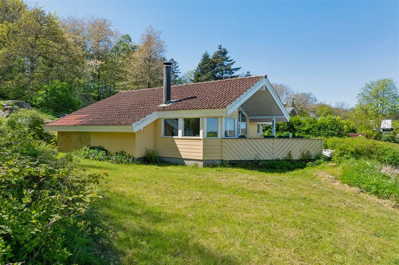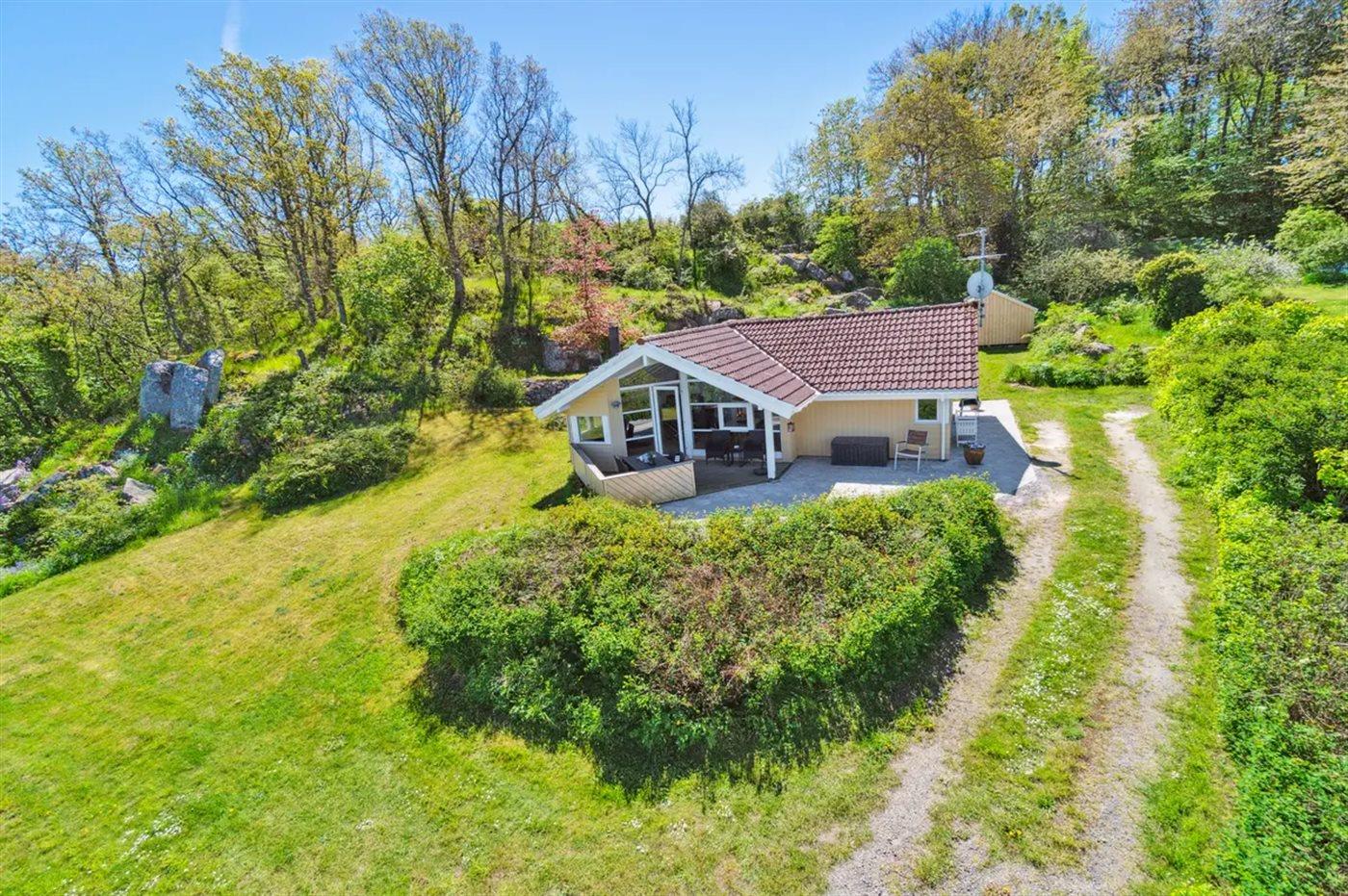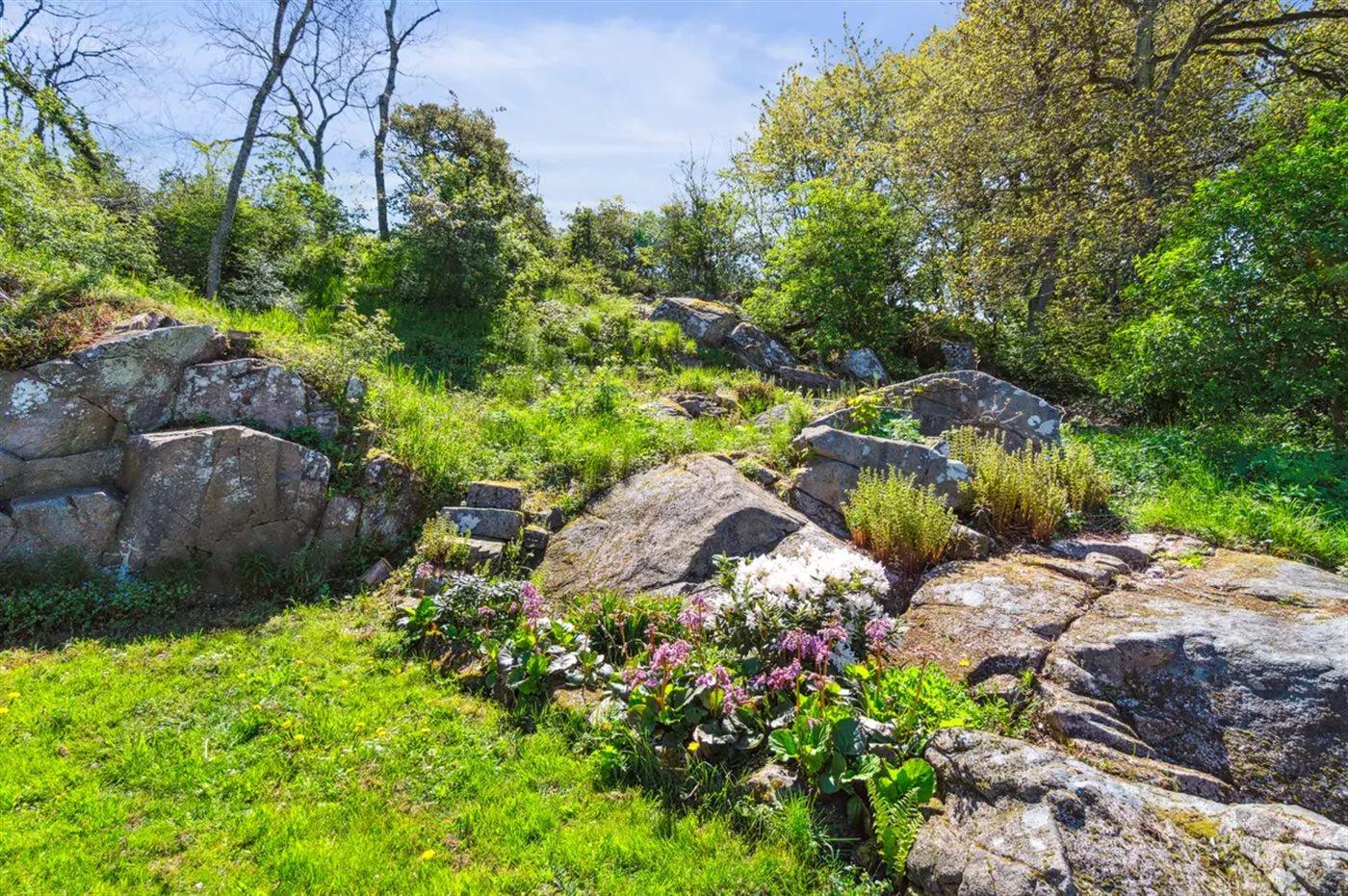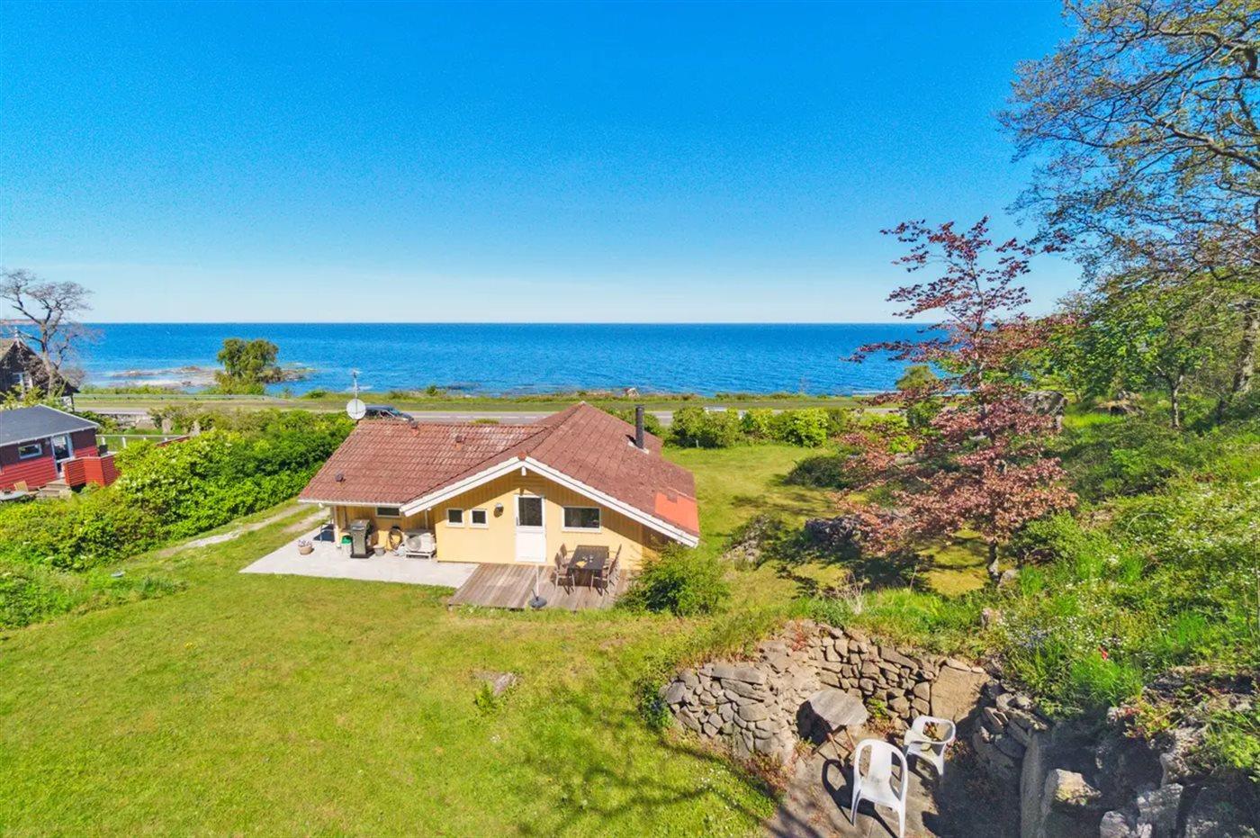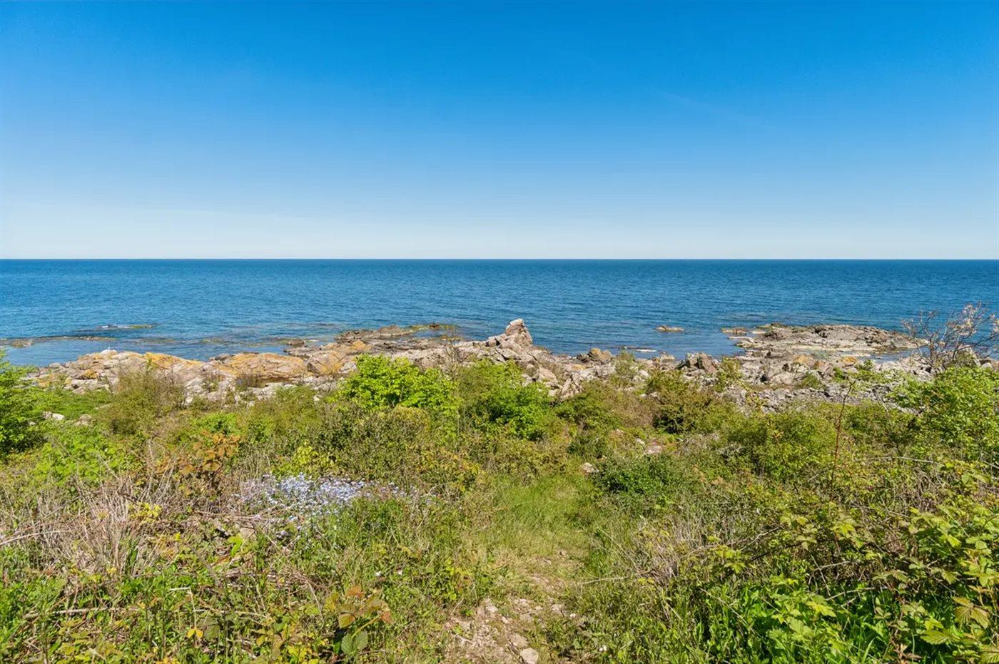 Herlig beliggenhed med udsigt over kysten og havet på varieret grund med både klippepartier og almindelig naturgrund. Der er terrasse både foran og bag huset, så man kan nyde havets bølgende lyde eller trække sig tilbage i ugenerthed.