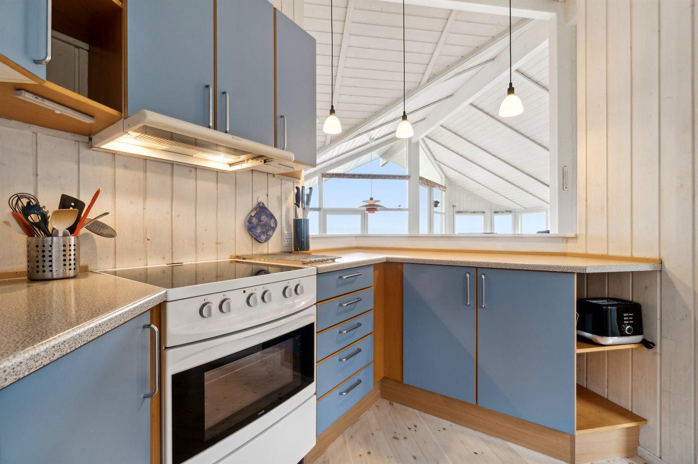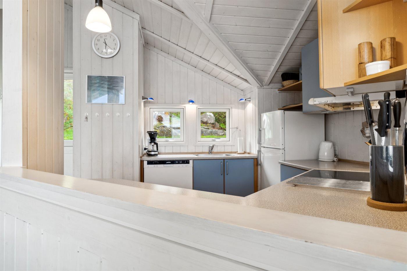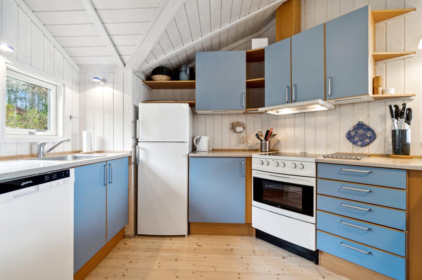 Køkkenet er udstyret med 1 køleskab. Der er 4 keramiske kogeplader, varmluftovn samt opvaskemaskine.