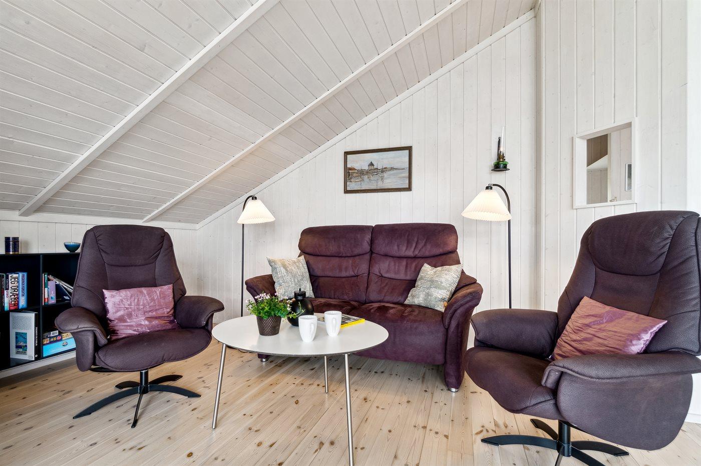 Huset er indrettet med større stue, der er havvendt med stort vinduesparti. Køkkenafdelingen er moderne og pænt indrettet ligesom der er to gode værelser - det ene med elevationssenge og det andet med dobbeltseng, der kan adskilles ved behov for det. Klinkebeklædt badeværelse.