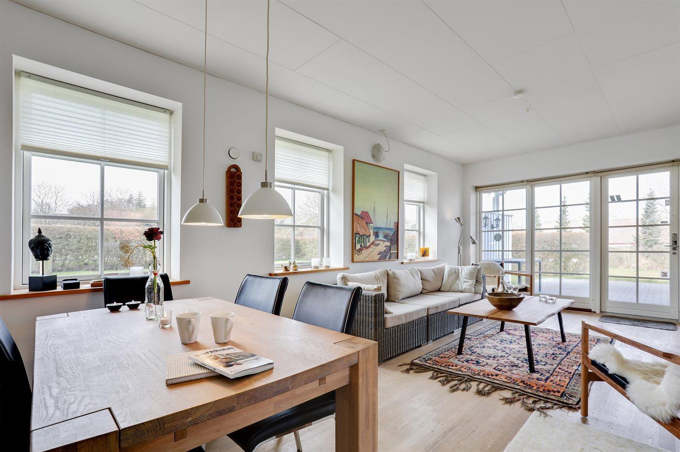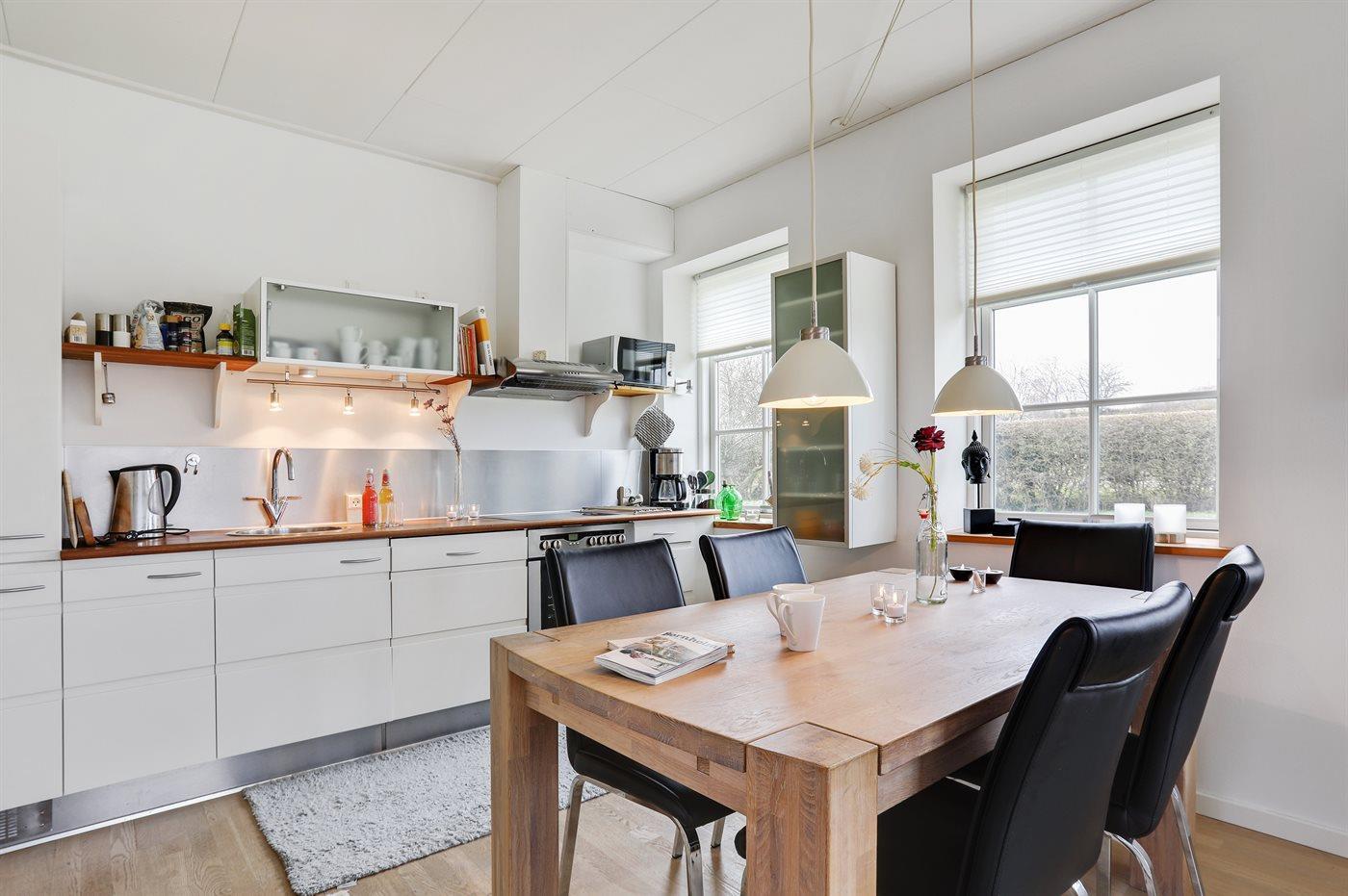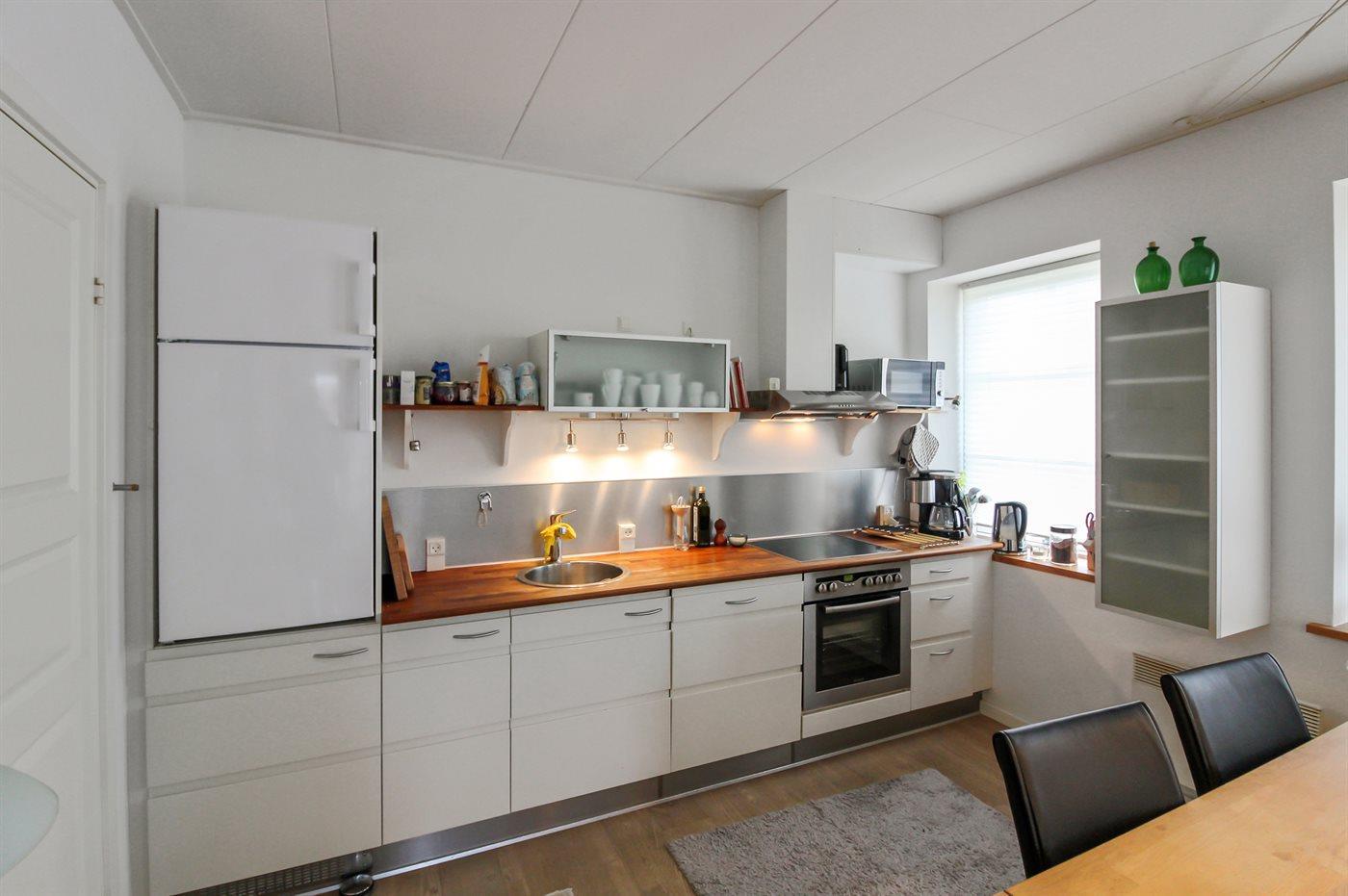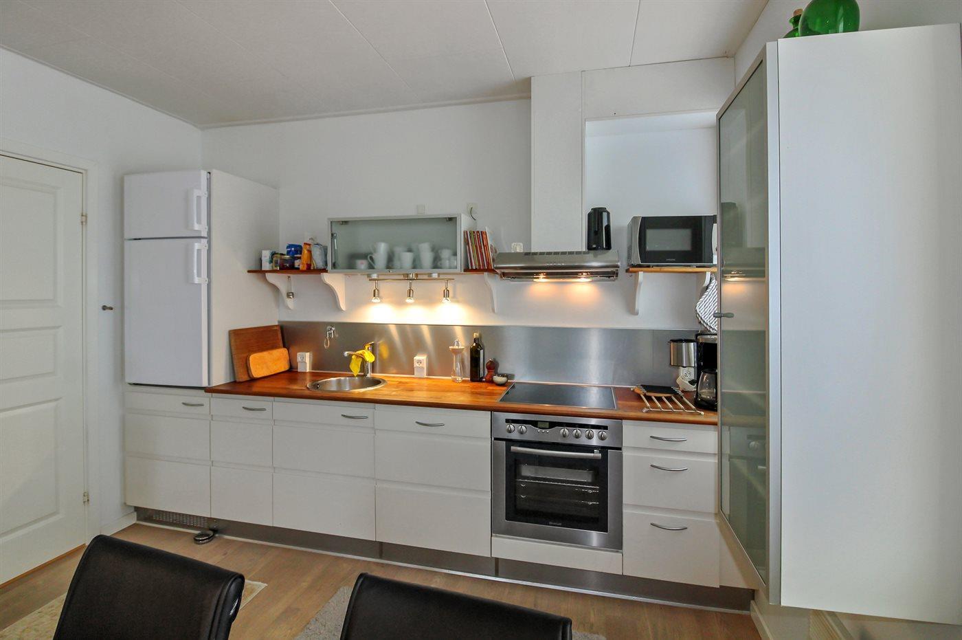 Køkkenet er udstyret med 1 køleskab. Der er 4 keramiske kogeplader, varmluftovn, mikrobølgeovn, Airfryer samt opvaskemaskine.