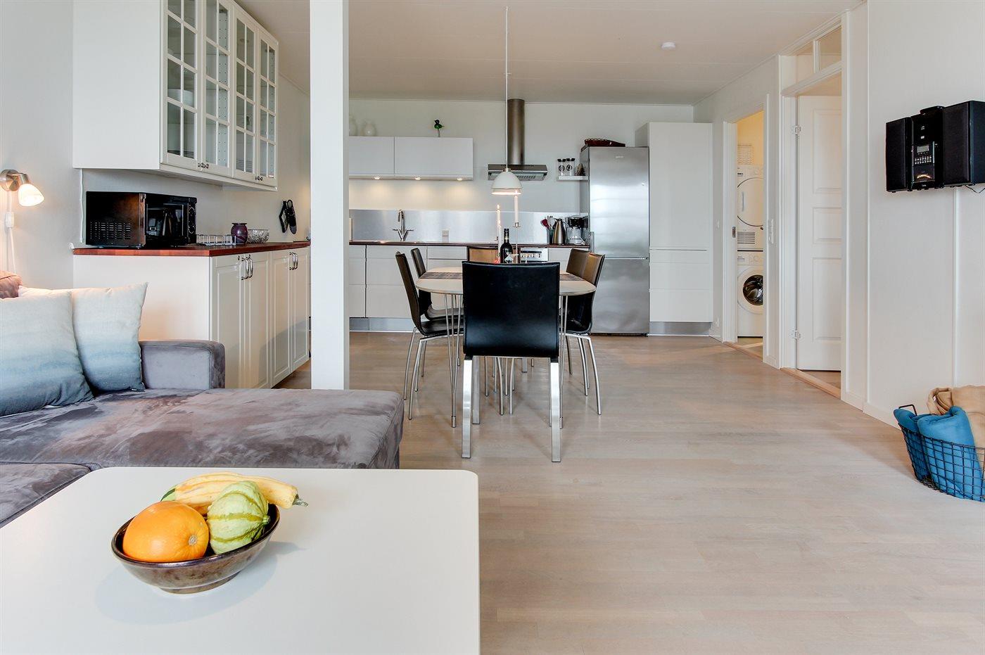 Rummelig og lys ferielejlighed med havudsigt, terrasse og adgang til opvarmet pool i naturskønne Sandkås.